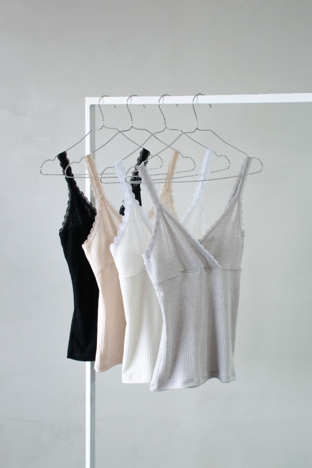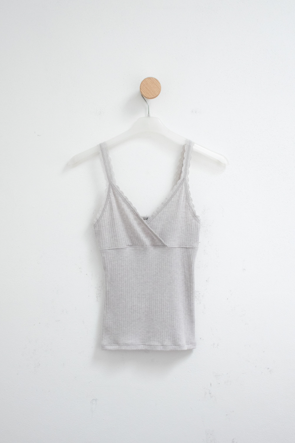 Musculosa confeccionada en suave viscosa con detalles calados. Modelo con escote cruzado en V y detalle de puntilla elástica.