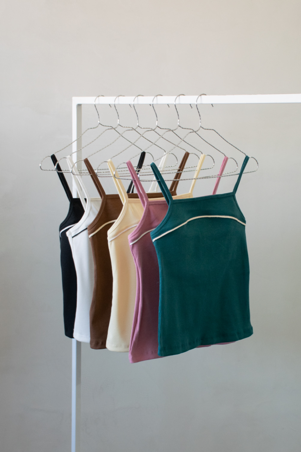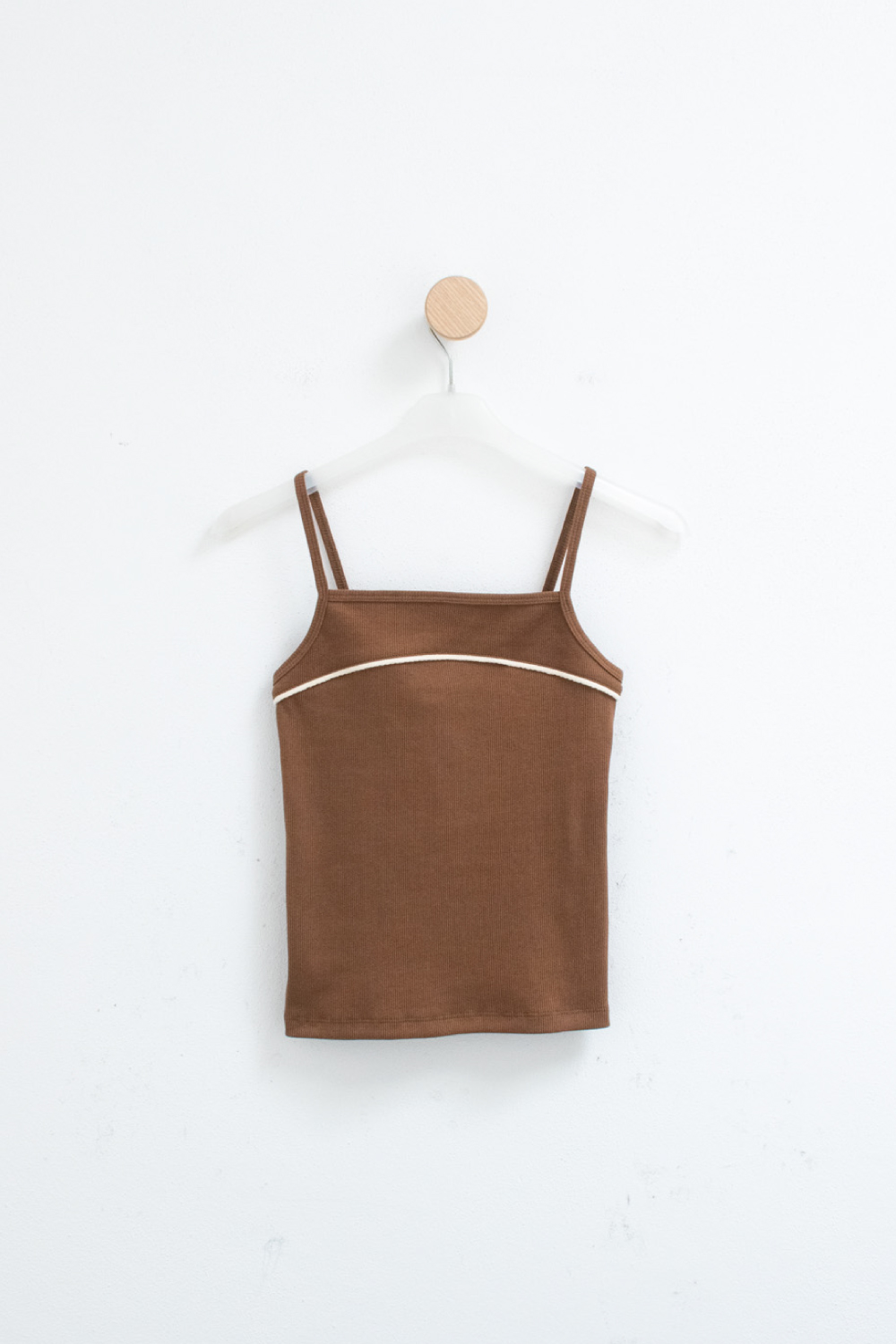 Top de morley algodón con escote recto y breteles finos. Detalle de vivo en el delantero superior.
