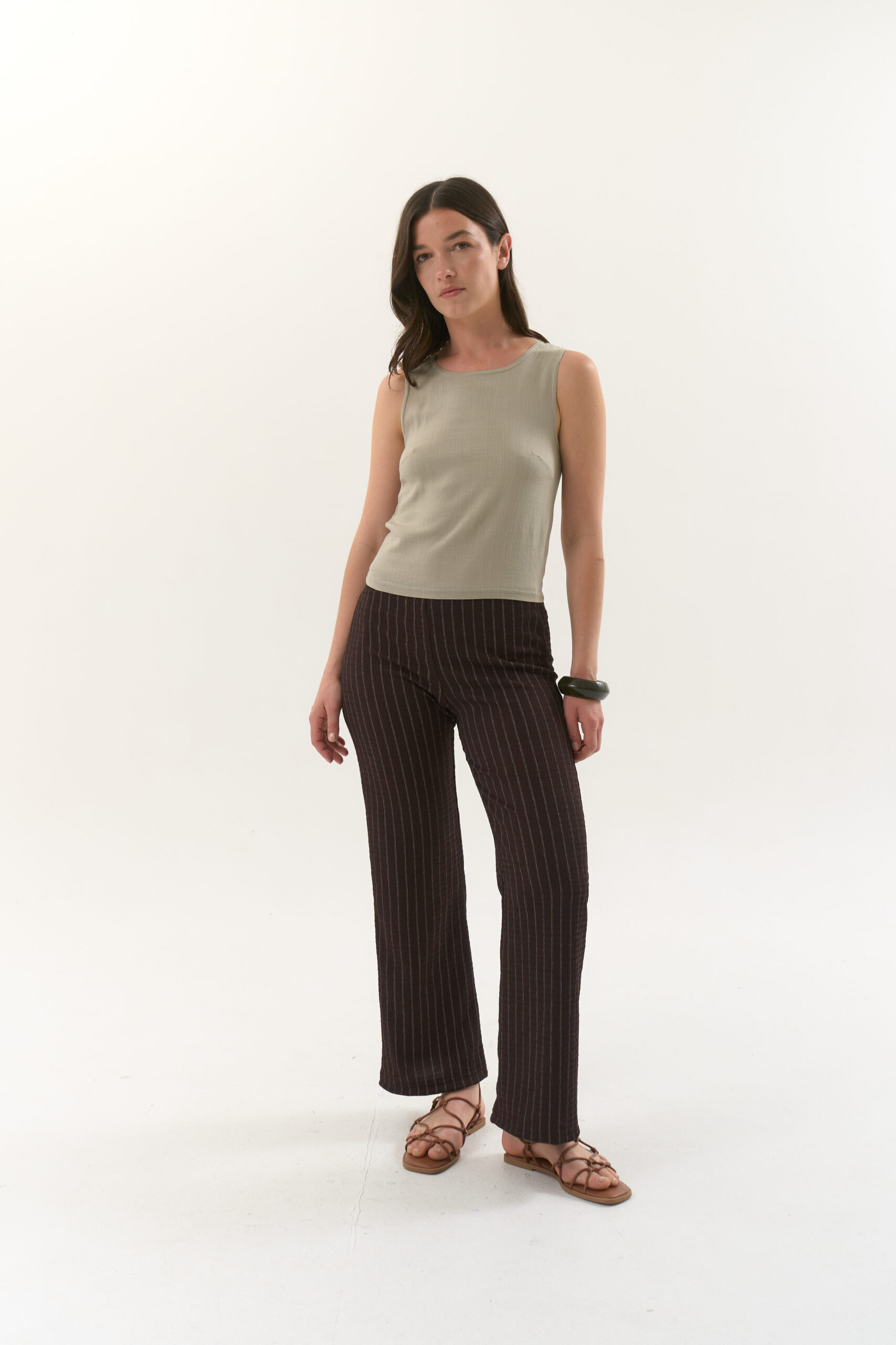 Pantalón de bambula rayada con elástico en la cintura y tiro medio/alto. Modelo con piernas rectas.