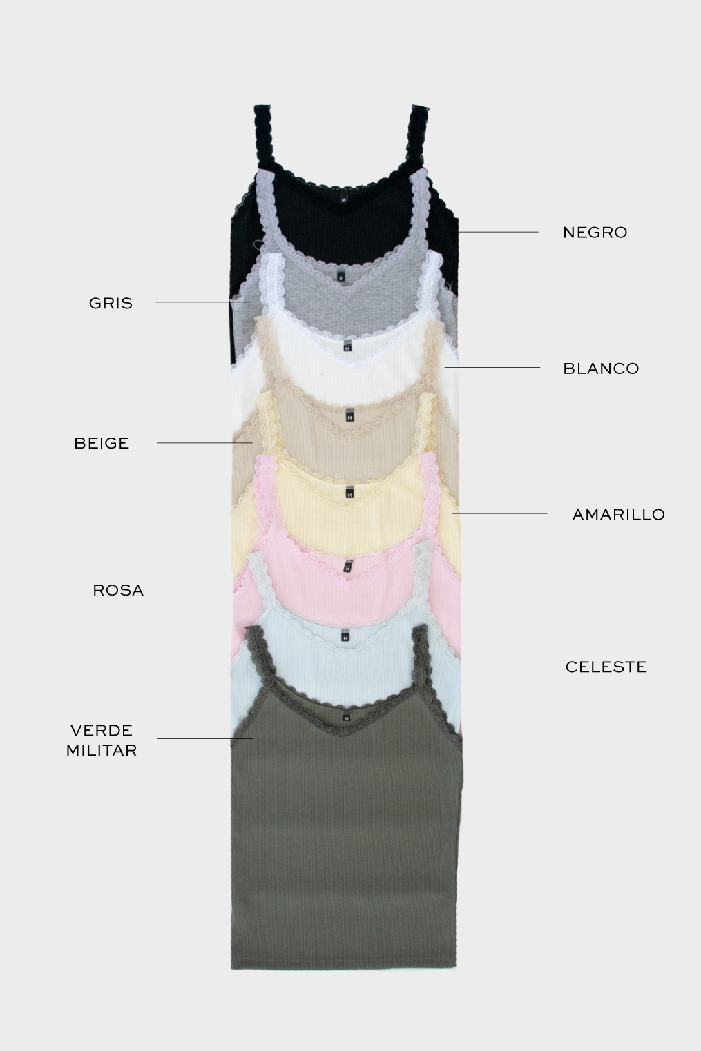 Musculosa de morley viscosa con escote V. Terminación con encaje al tono en sisa, escote y breteles.
