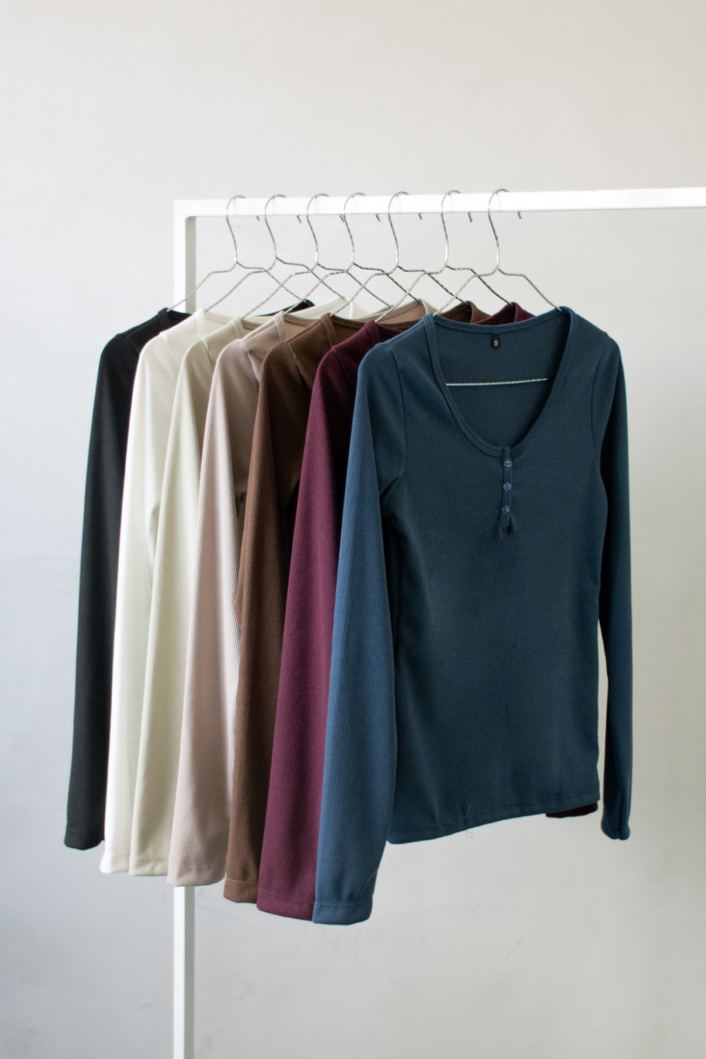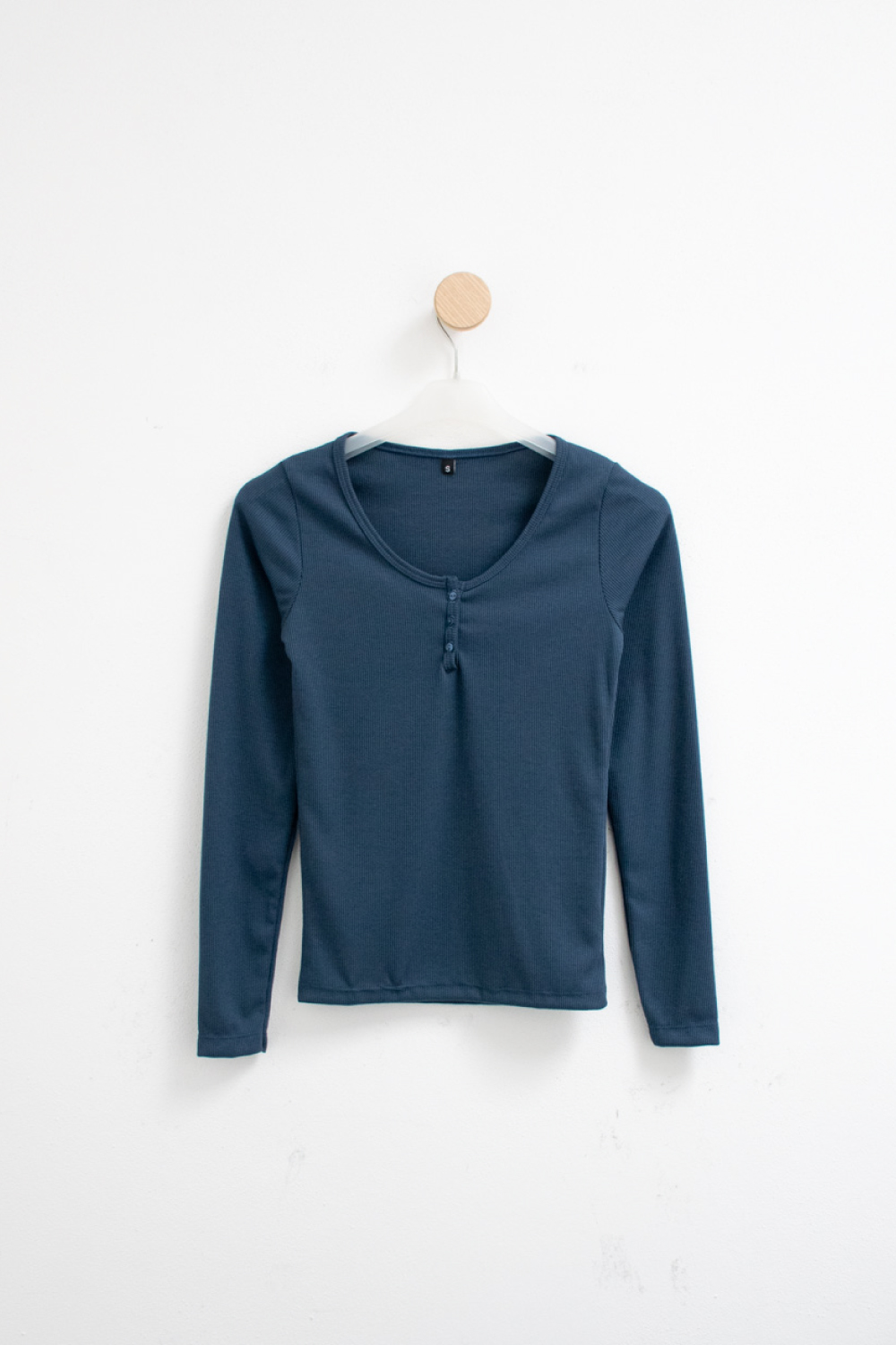 Remera de morley viscosa pesada con cuello redondo y mangas largas. Detalle de cartera con botones en el delantero.