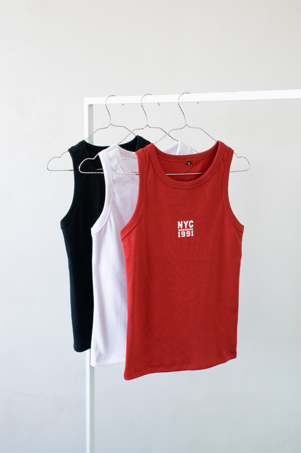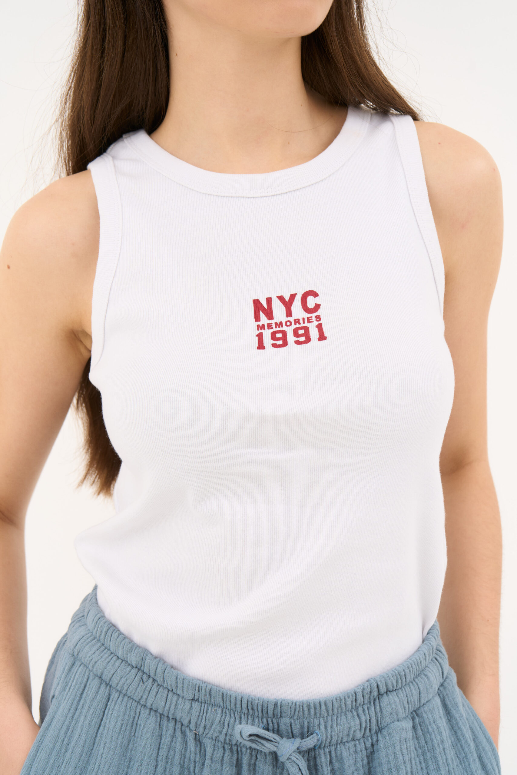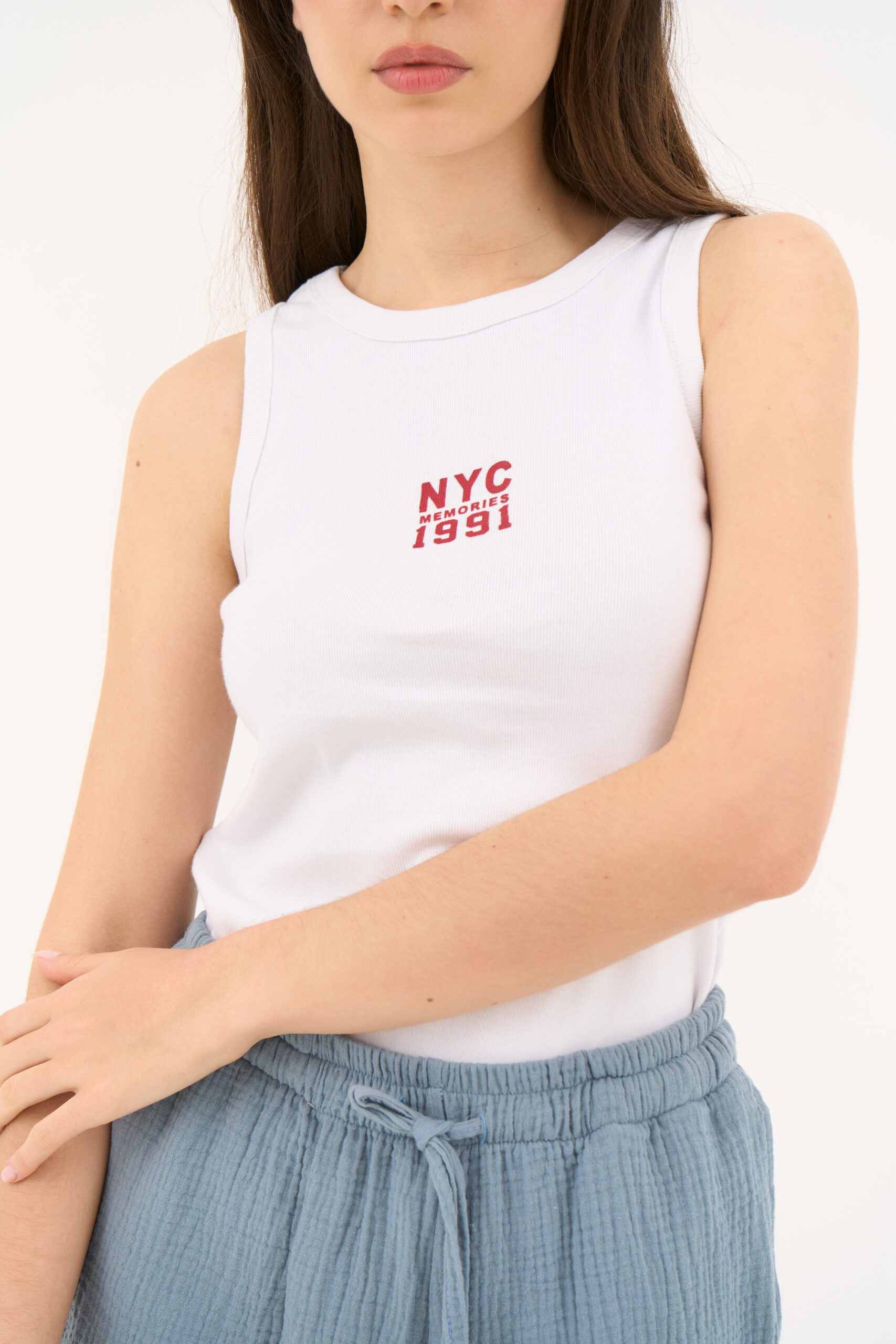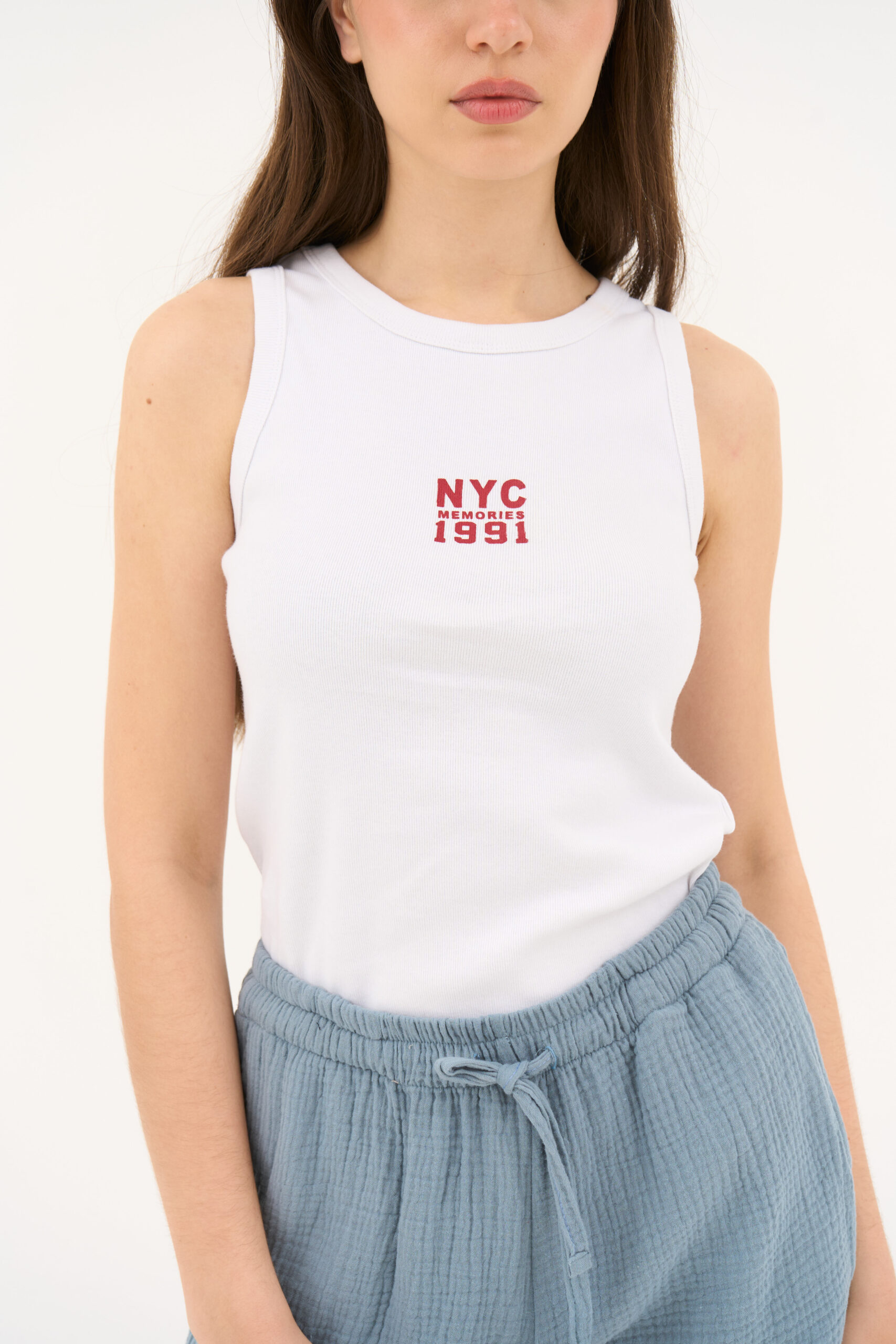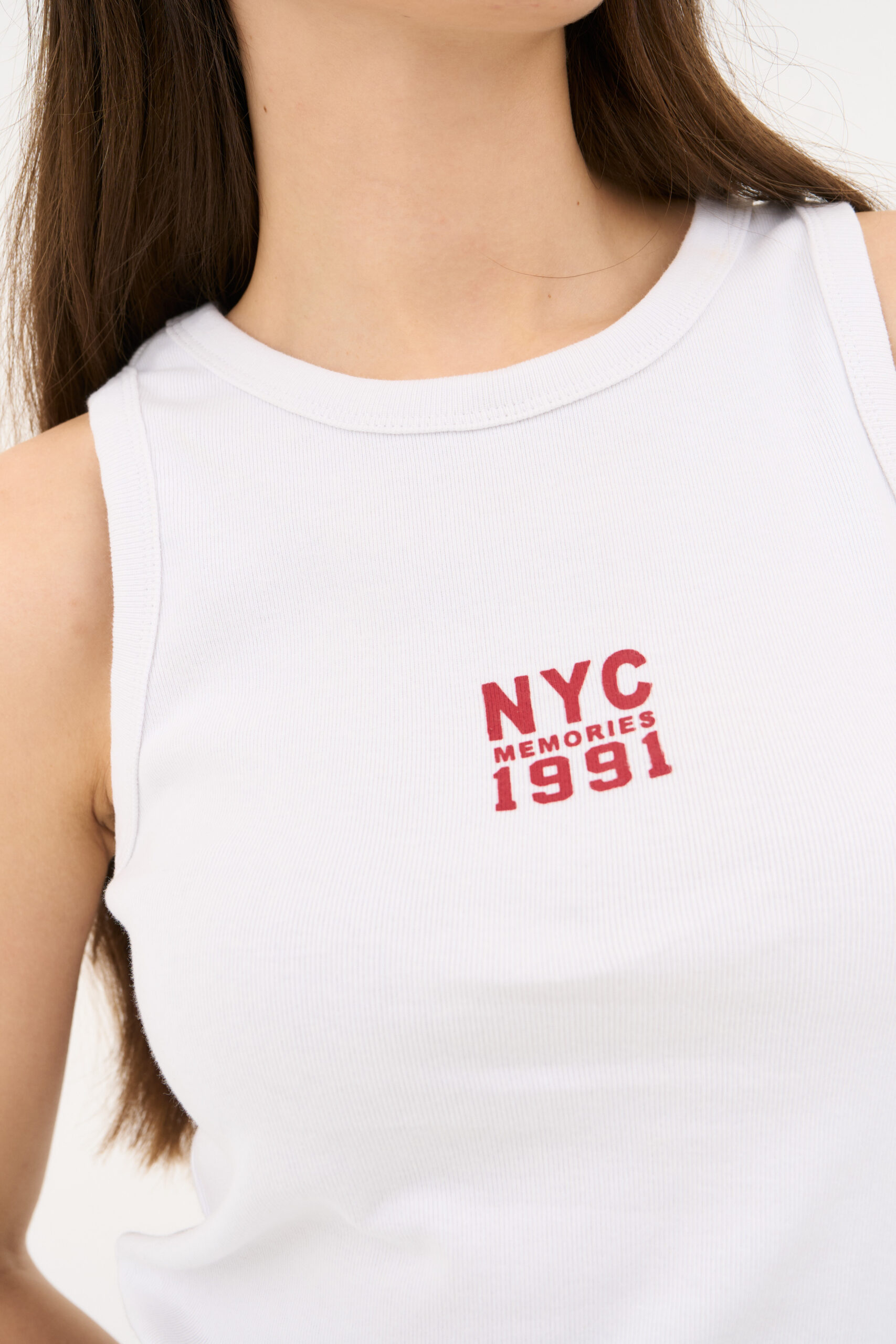 Musculosa de ribb pesado 100% algodón con collareta ancha en cuellos y sisa. Detalle de estampa en el delantero
