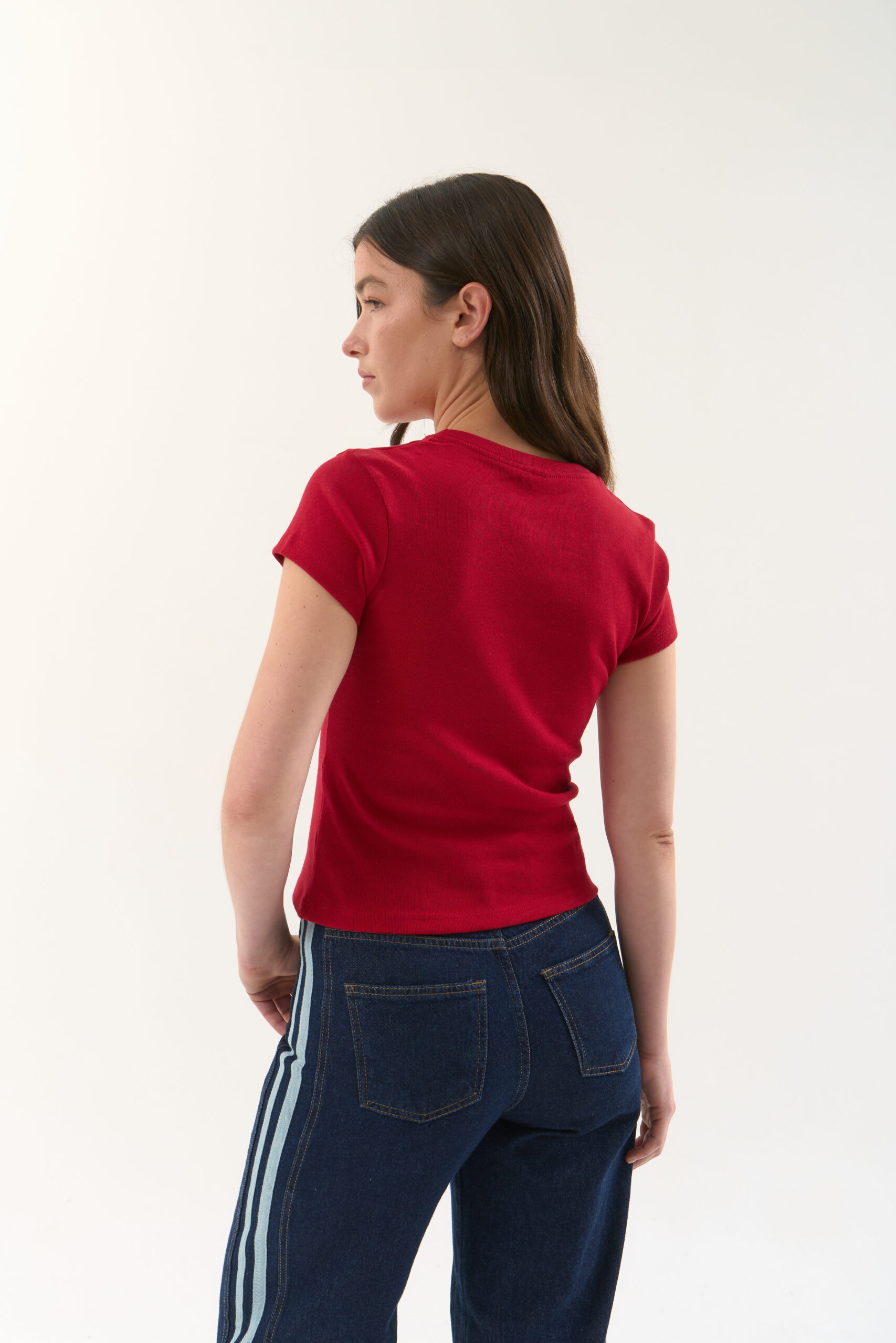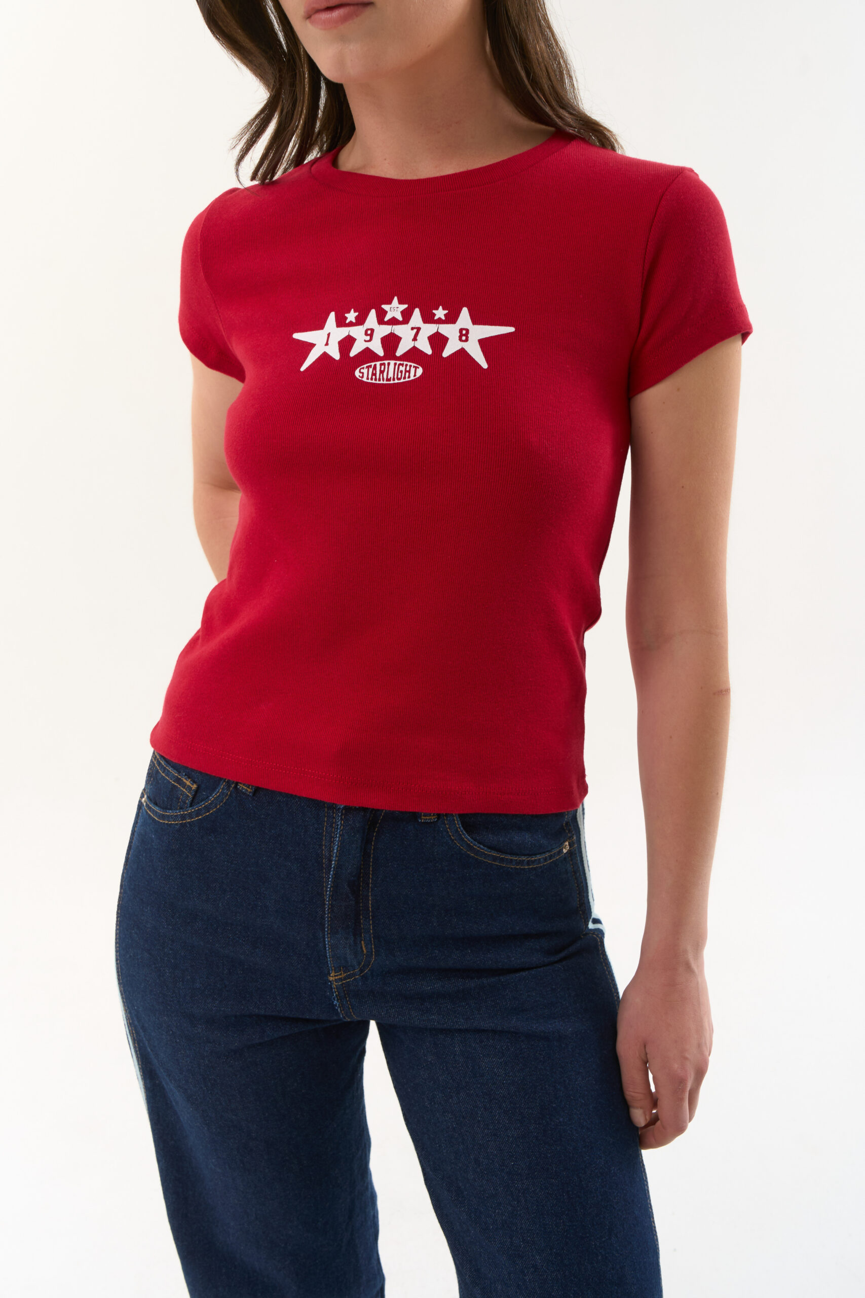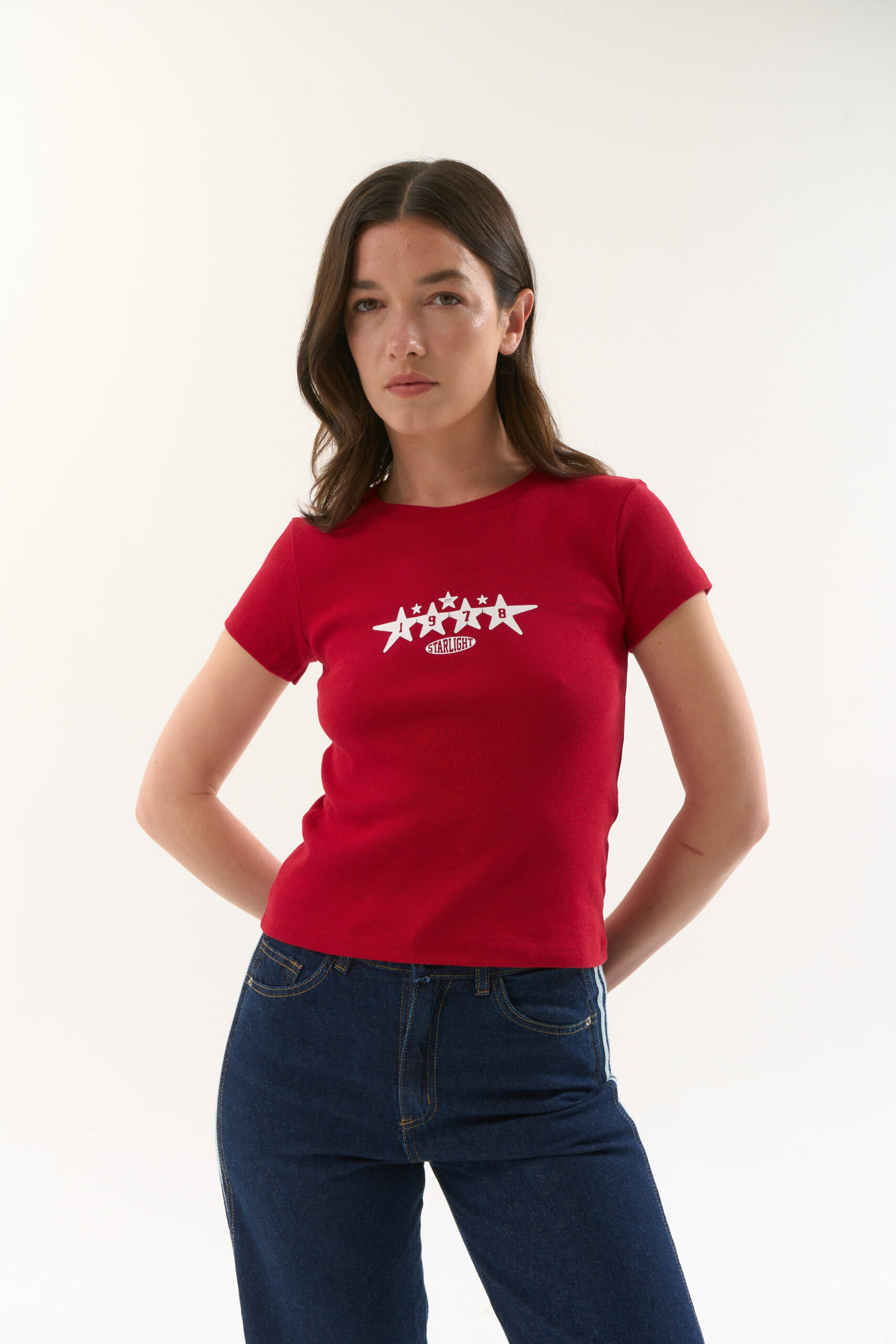 Remera básica con cuello redondo en ribb pesado 100% algodón. Detalle de estampa con serigrafia en el delantero.