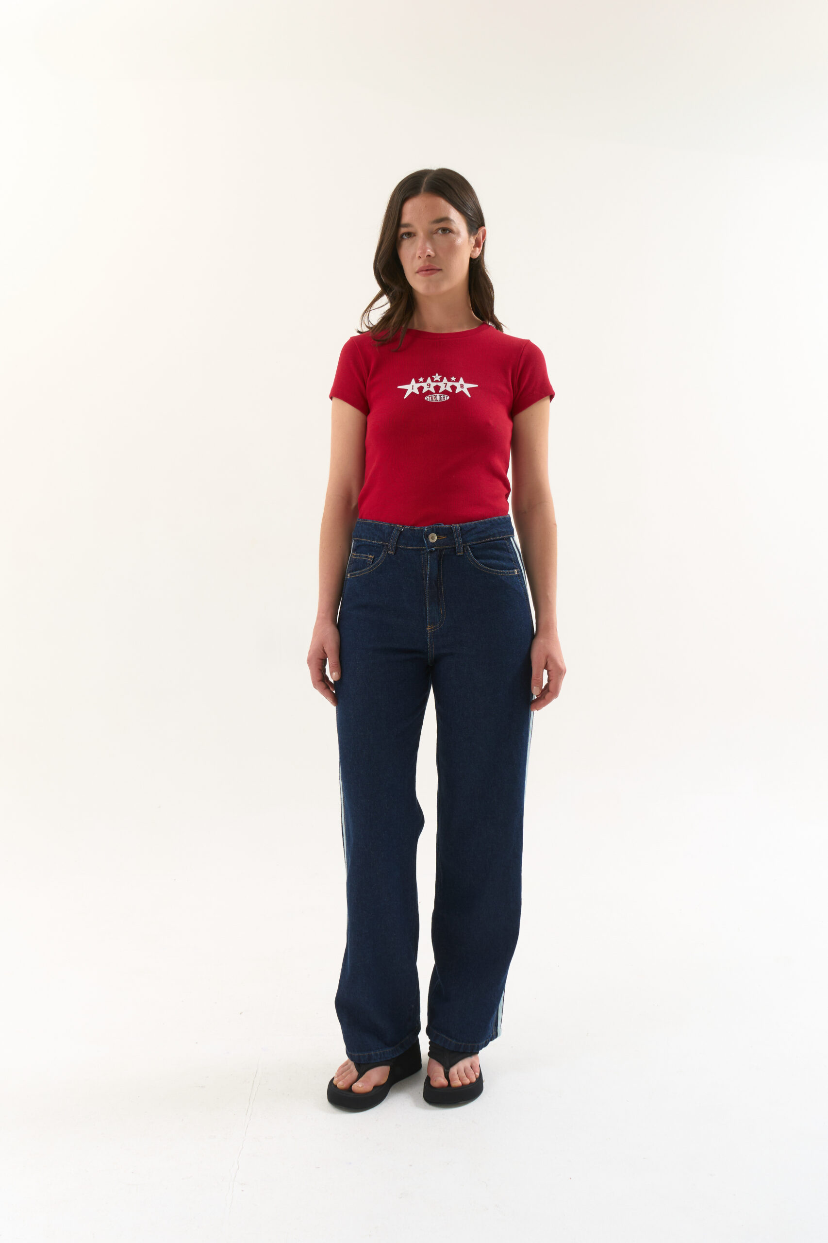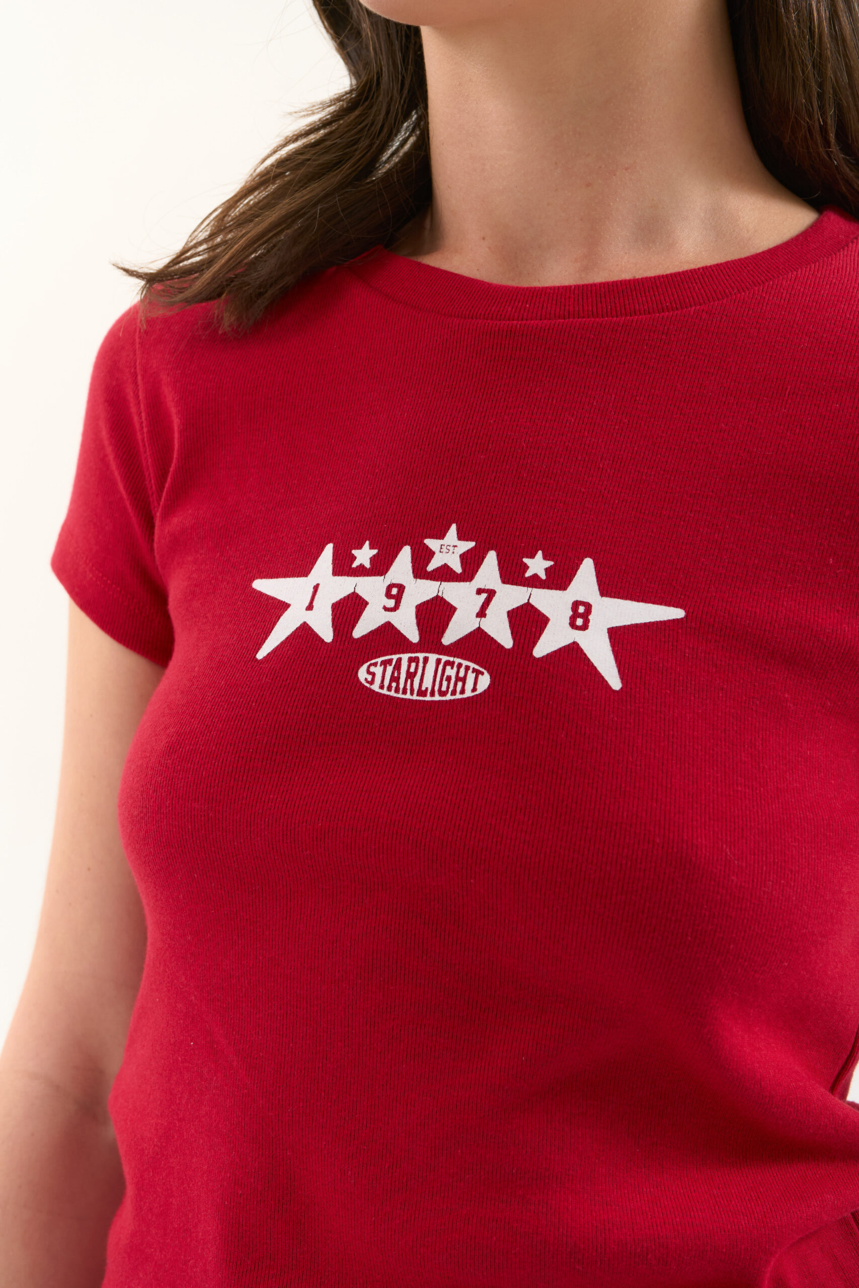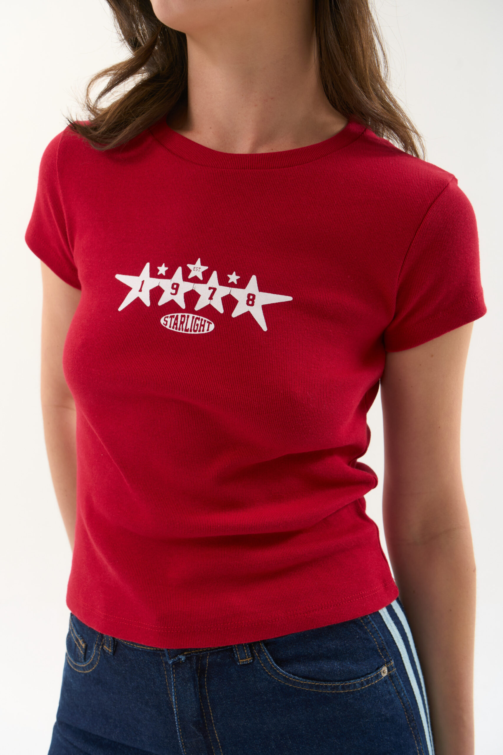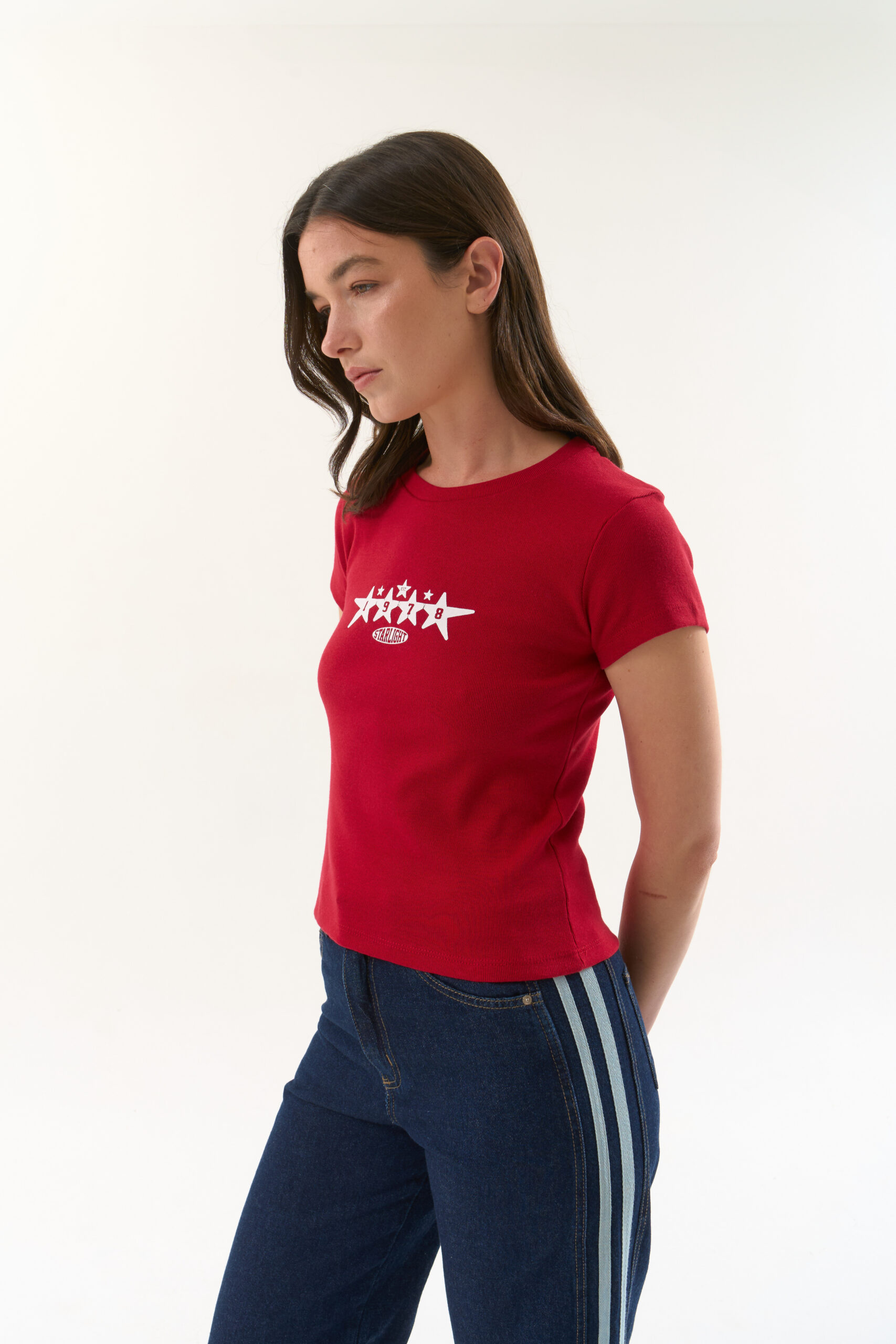 Remera básica con cuello redondo en ribb pesado 100% algodón. Detalle de estampa con serigrafia en el delantero.