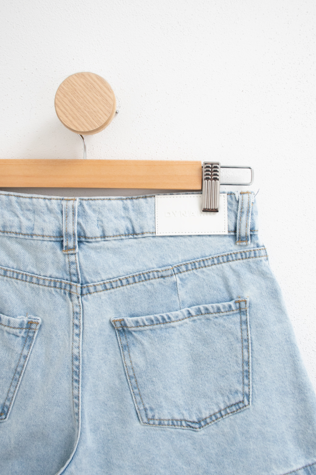 Short tiro medio en denim rígido y cinco bolsillos. Modelo con ruedo simple y lavado con bajada de color.