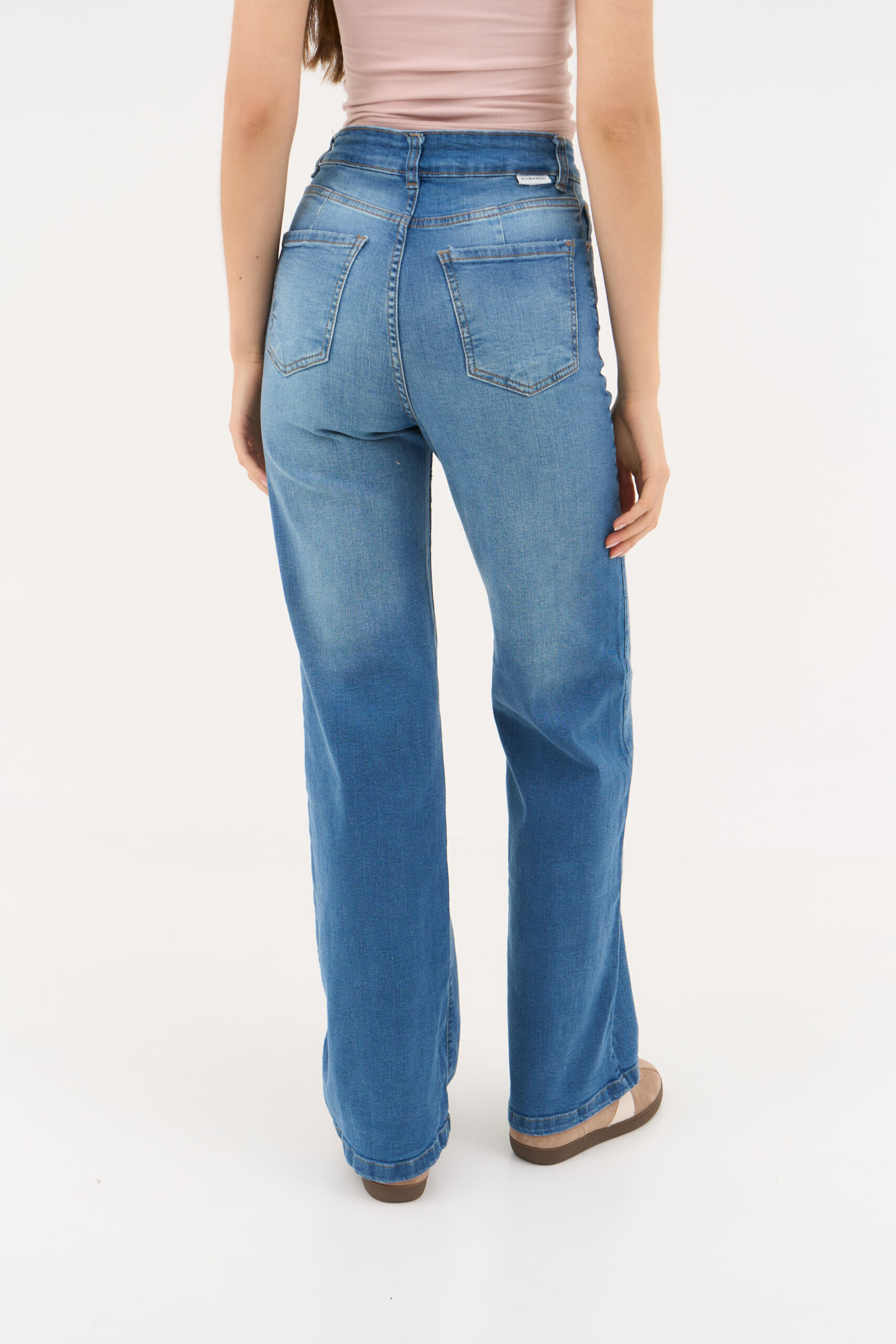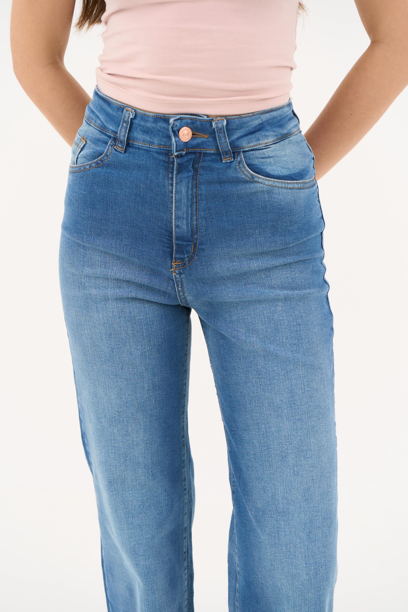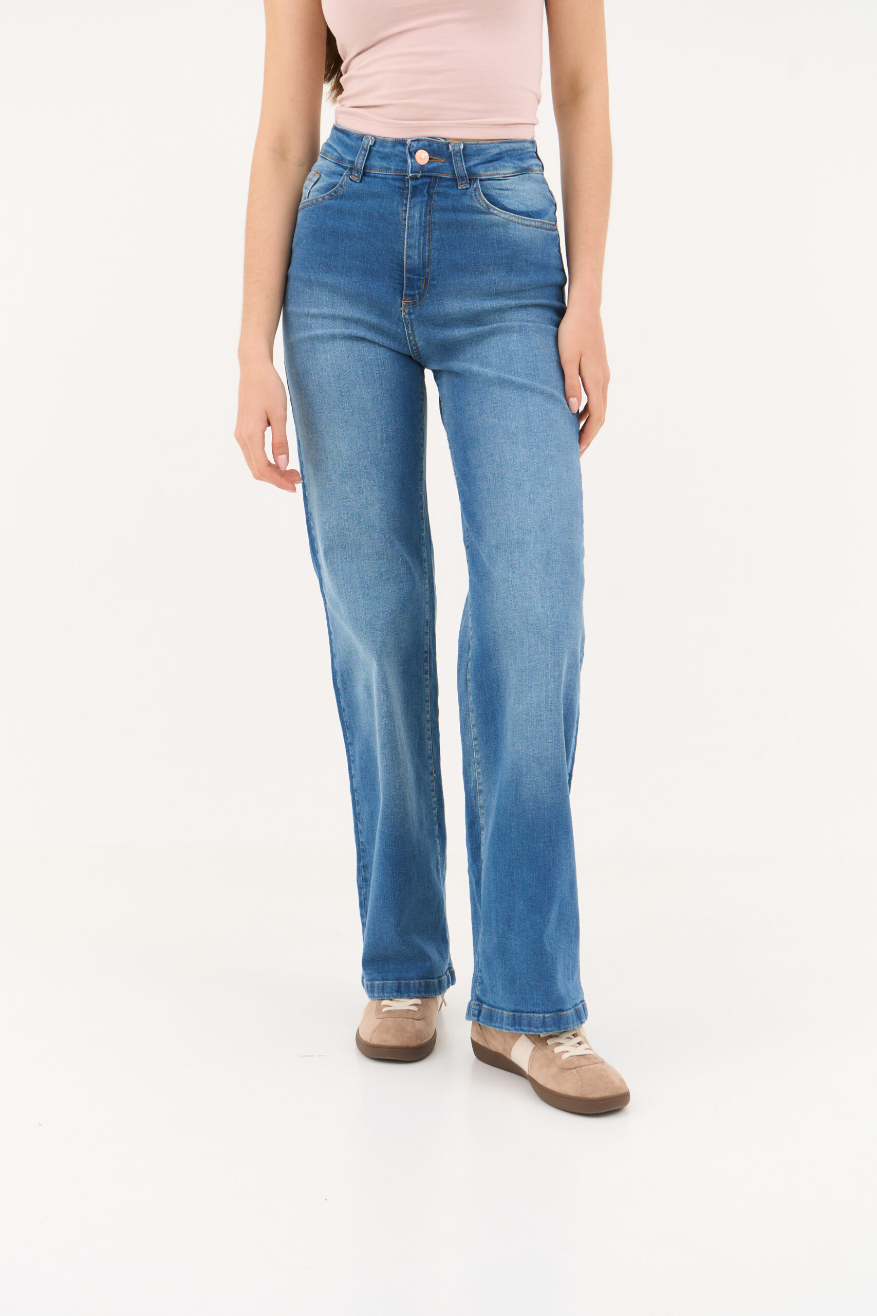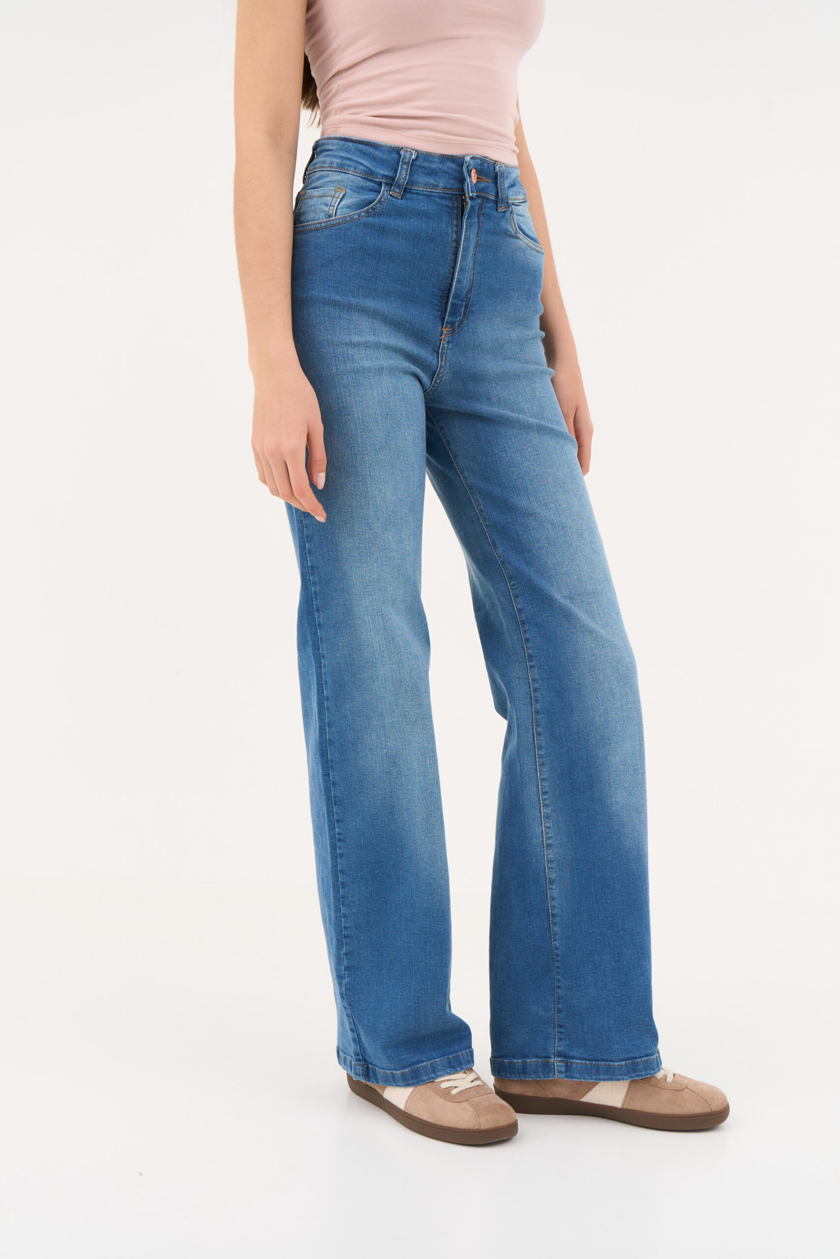 Jean elastizado de tiro alto y piernas anchas. Modelo confeccionado con denim premium 98% algodón 2% spandex.