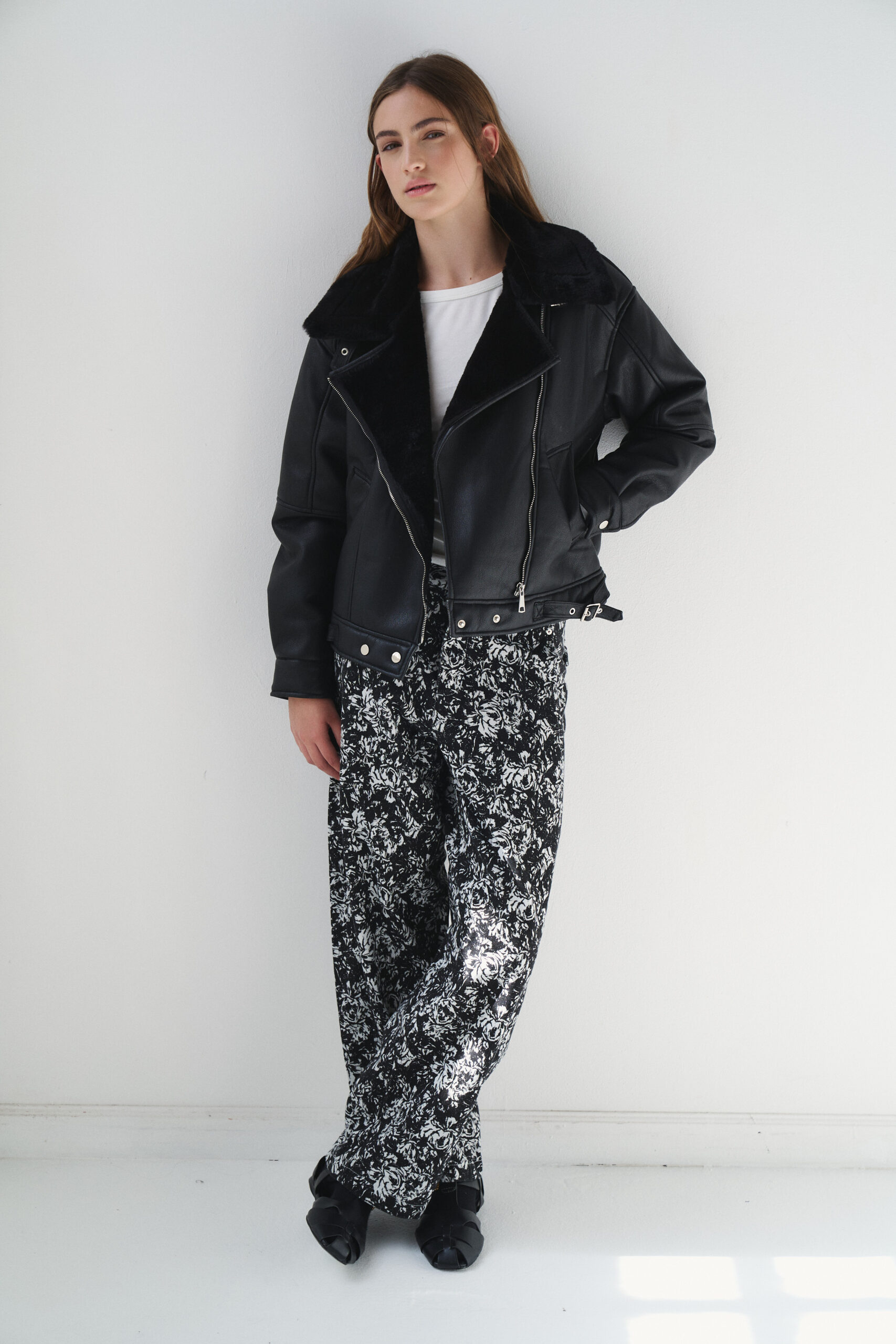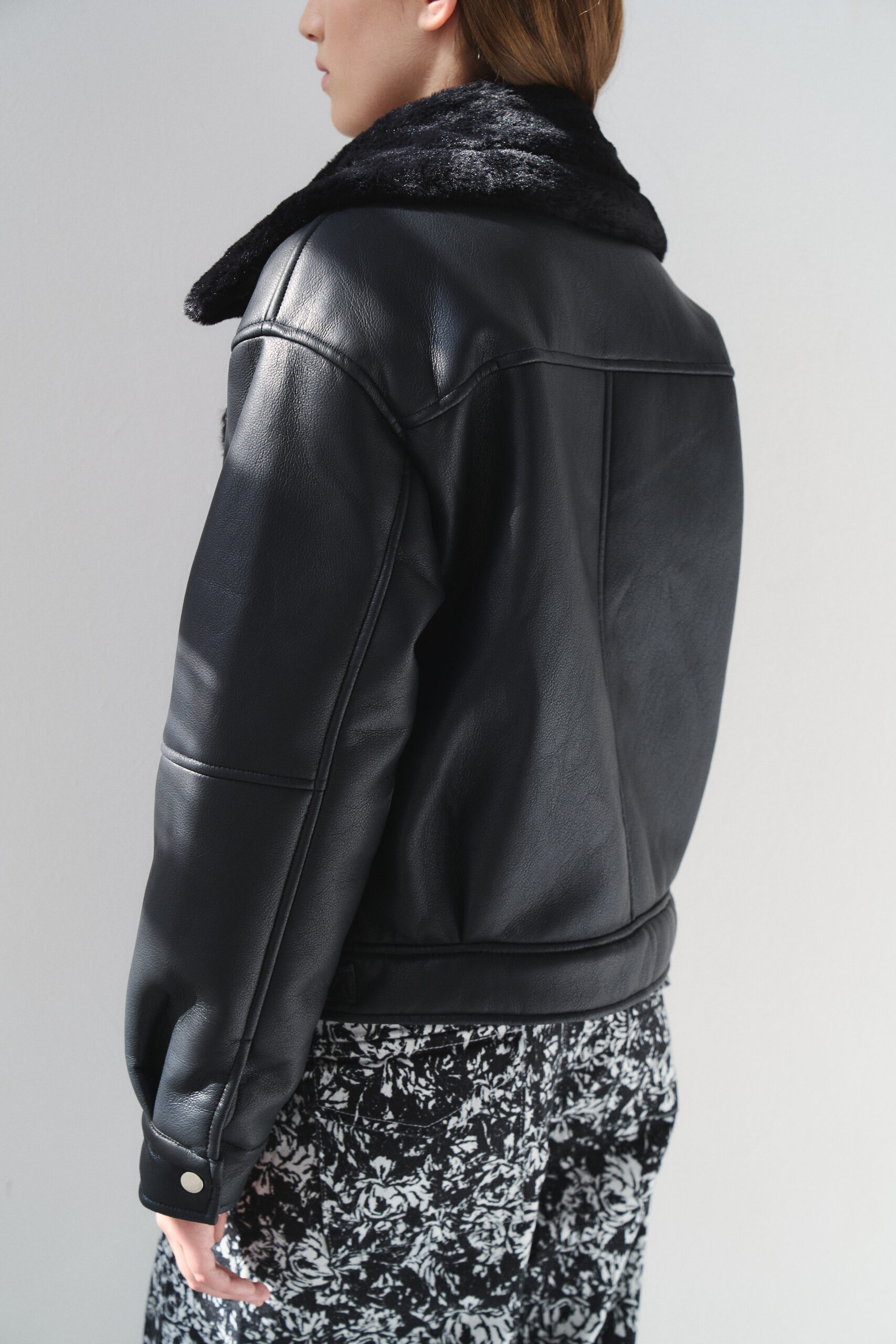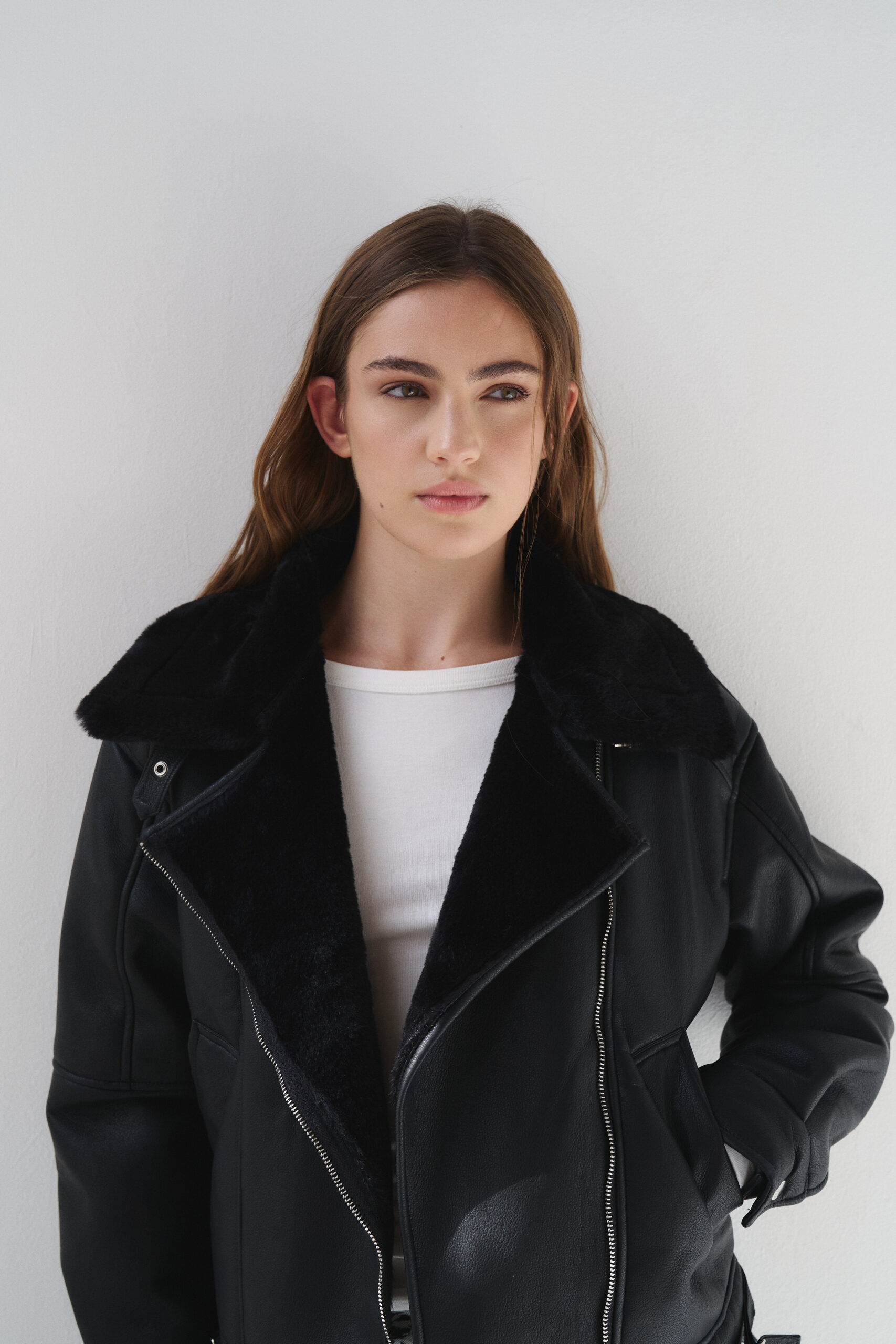 Campera estilo gamulan oversize de ecocuero forrado con suave piel sintética. Detalle de botones a presión y correa regulable en el bajo y cierre metálico en delantero. Bolsillos delanteros.