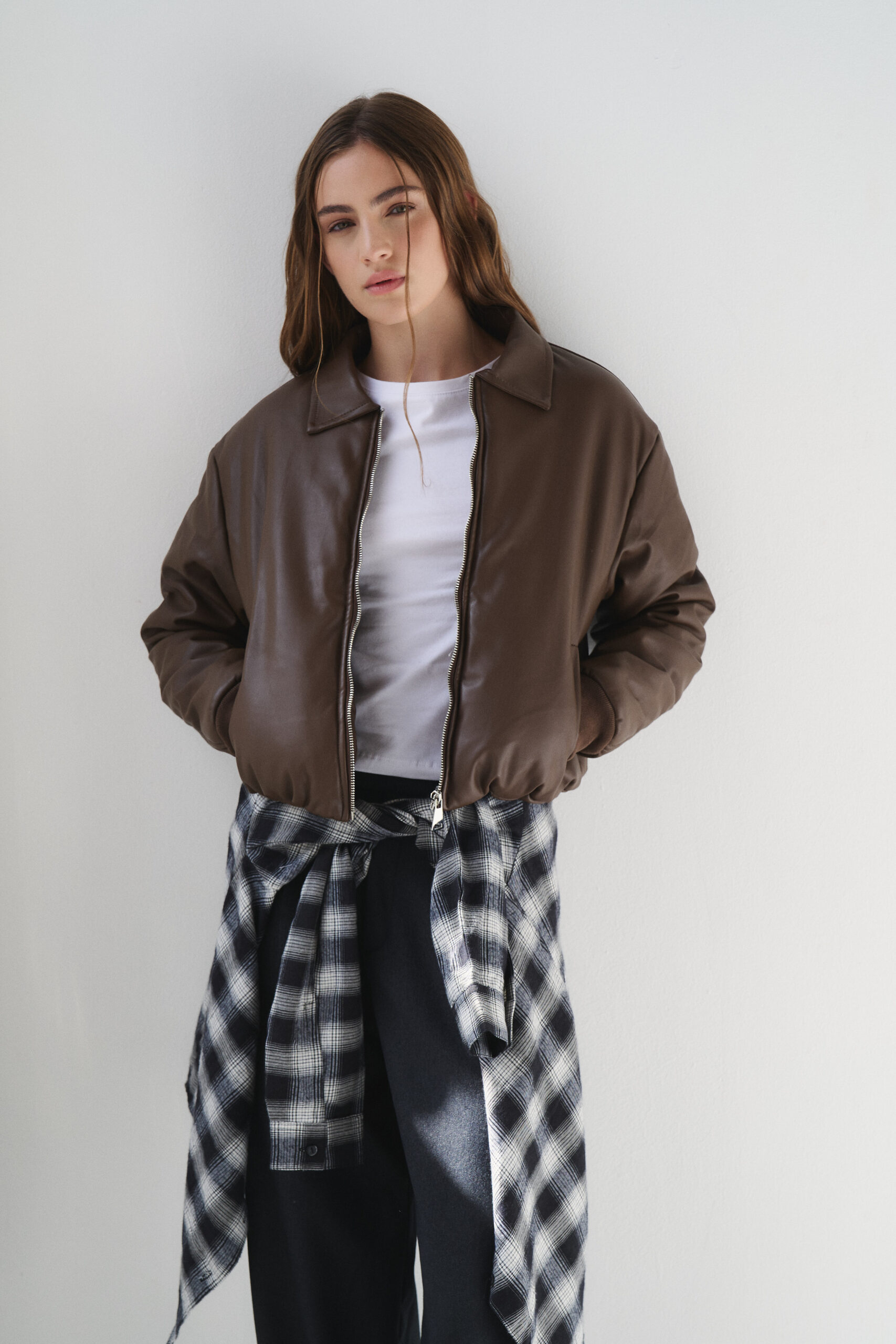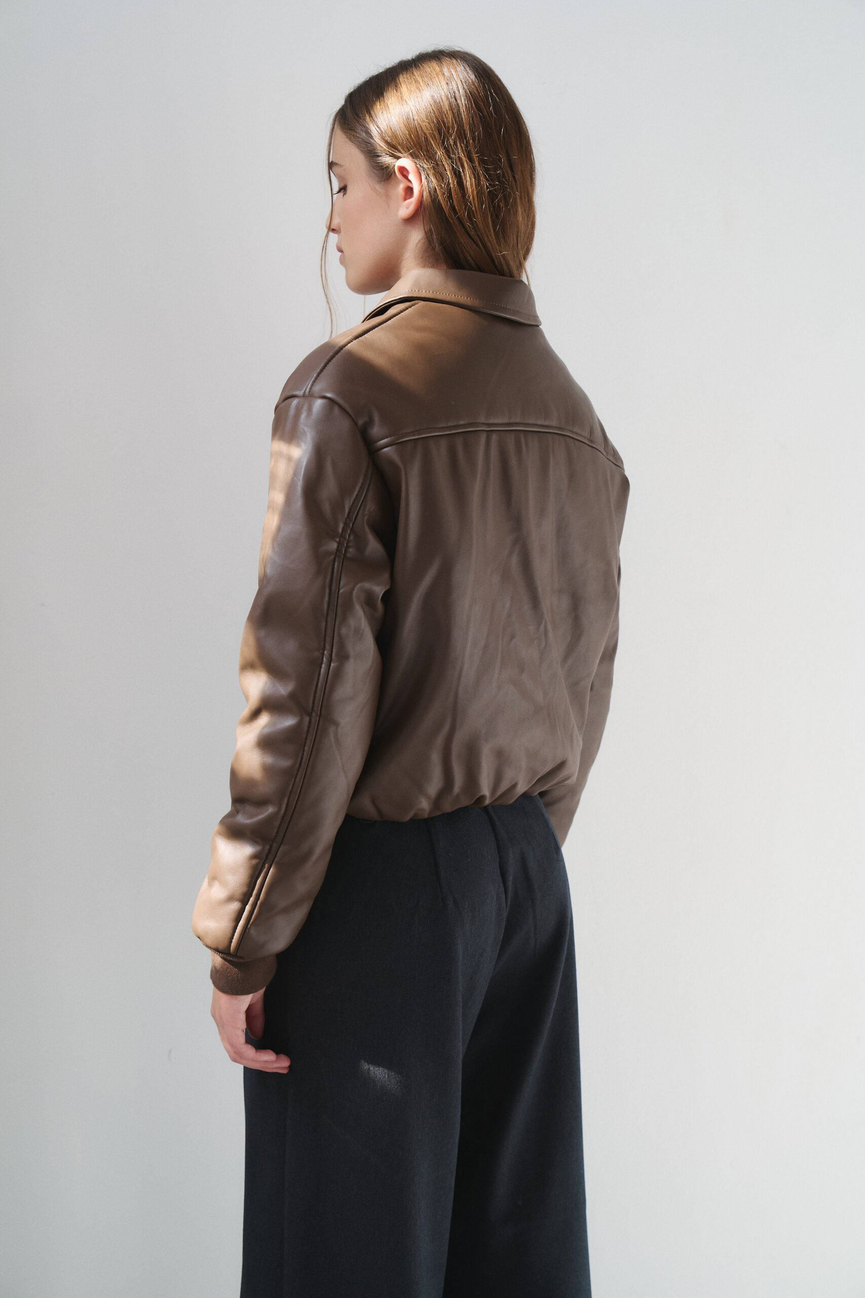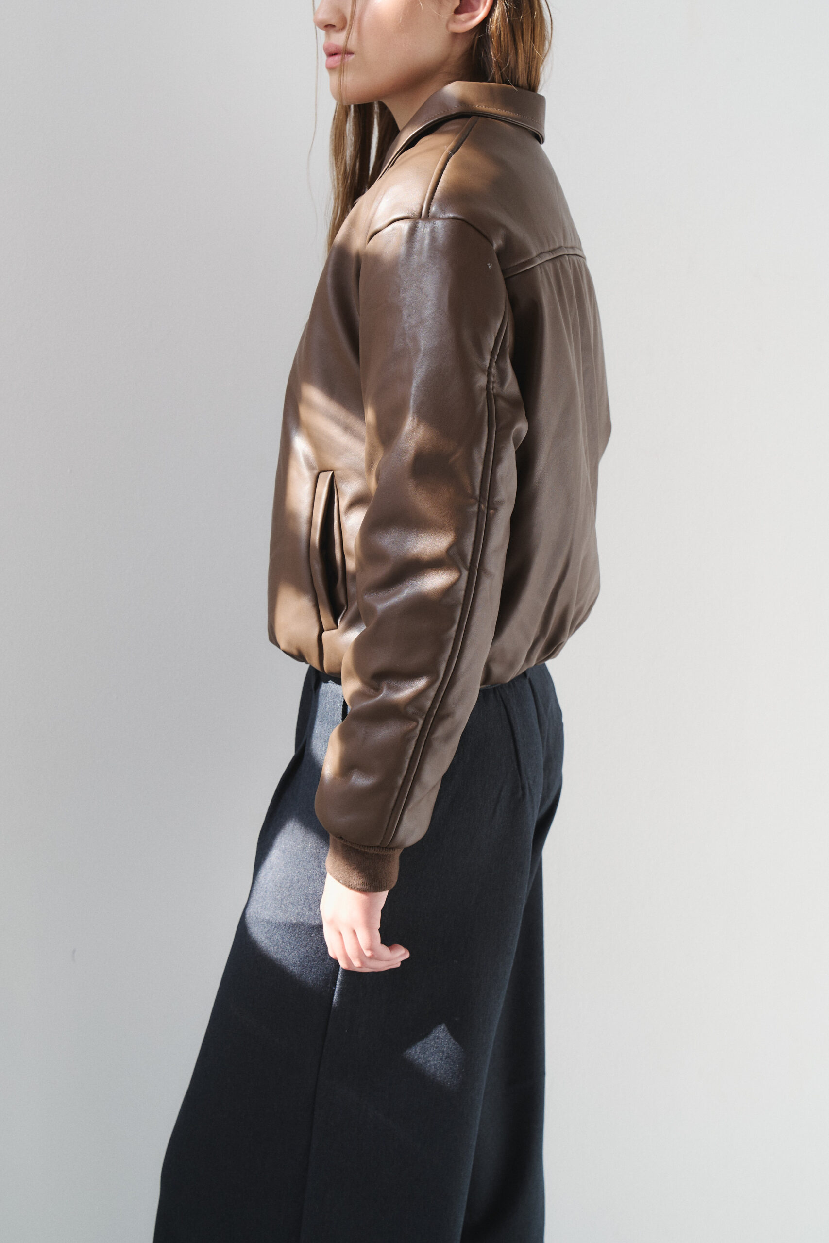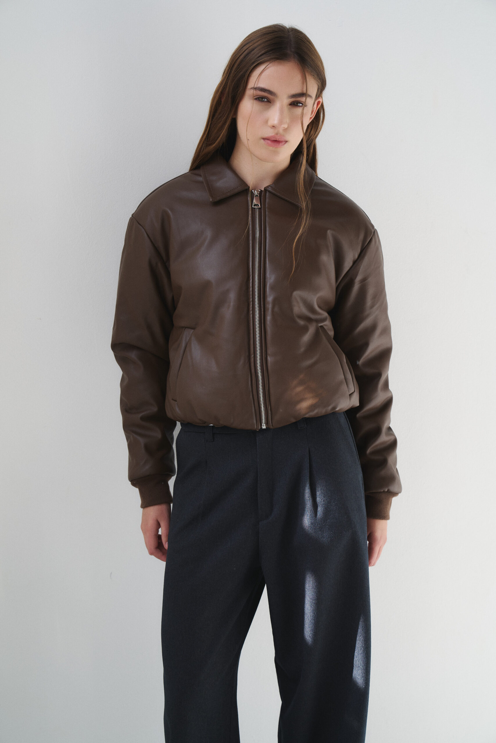 Campera importada de eco cuero estilo puffer. Modelo con elástico fino en la cintura y puños morley. Detalle de cierre metálico y bolsillos delanteros.