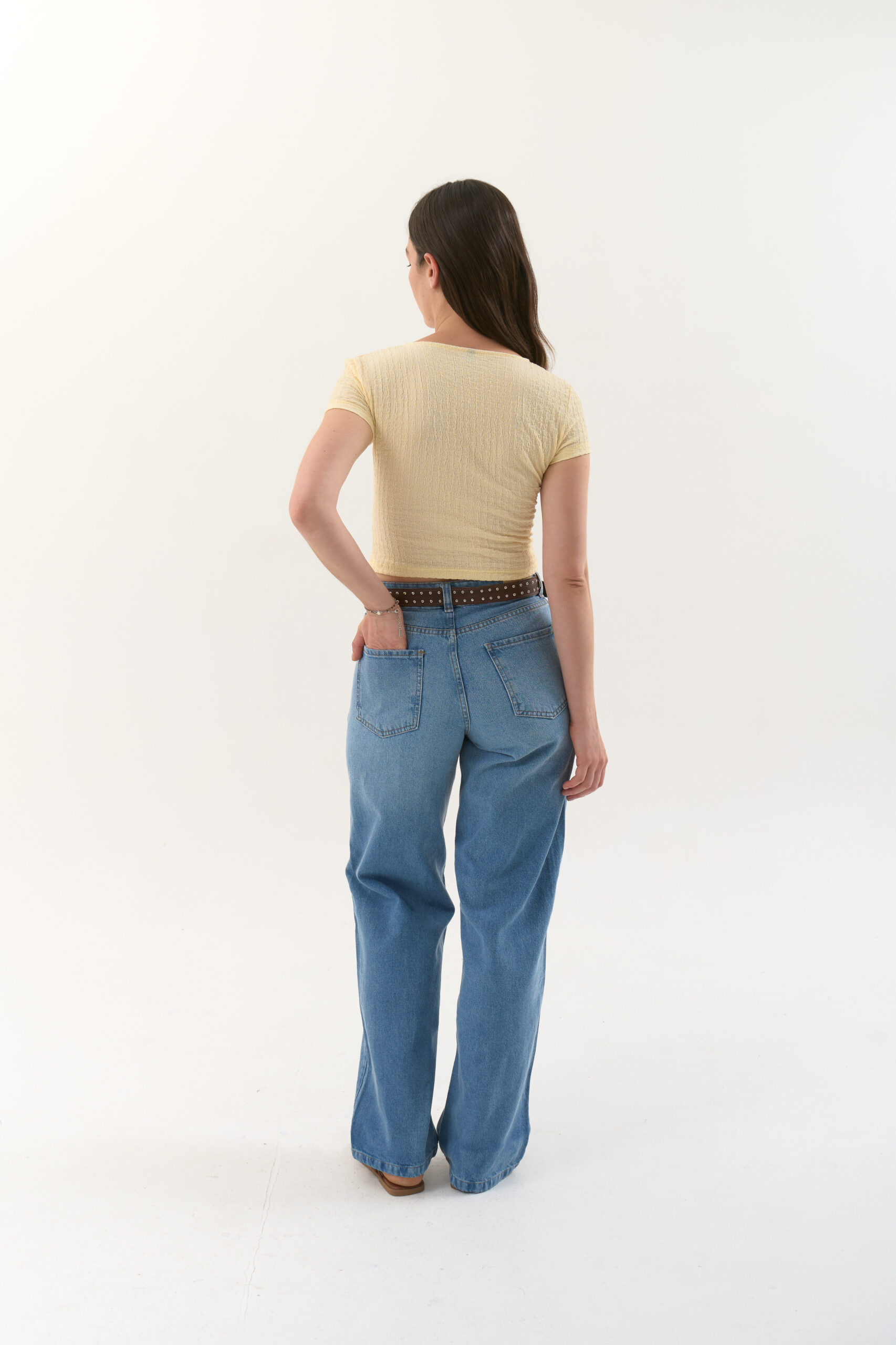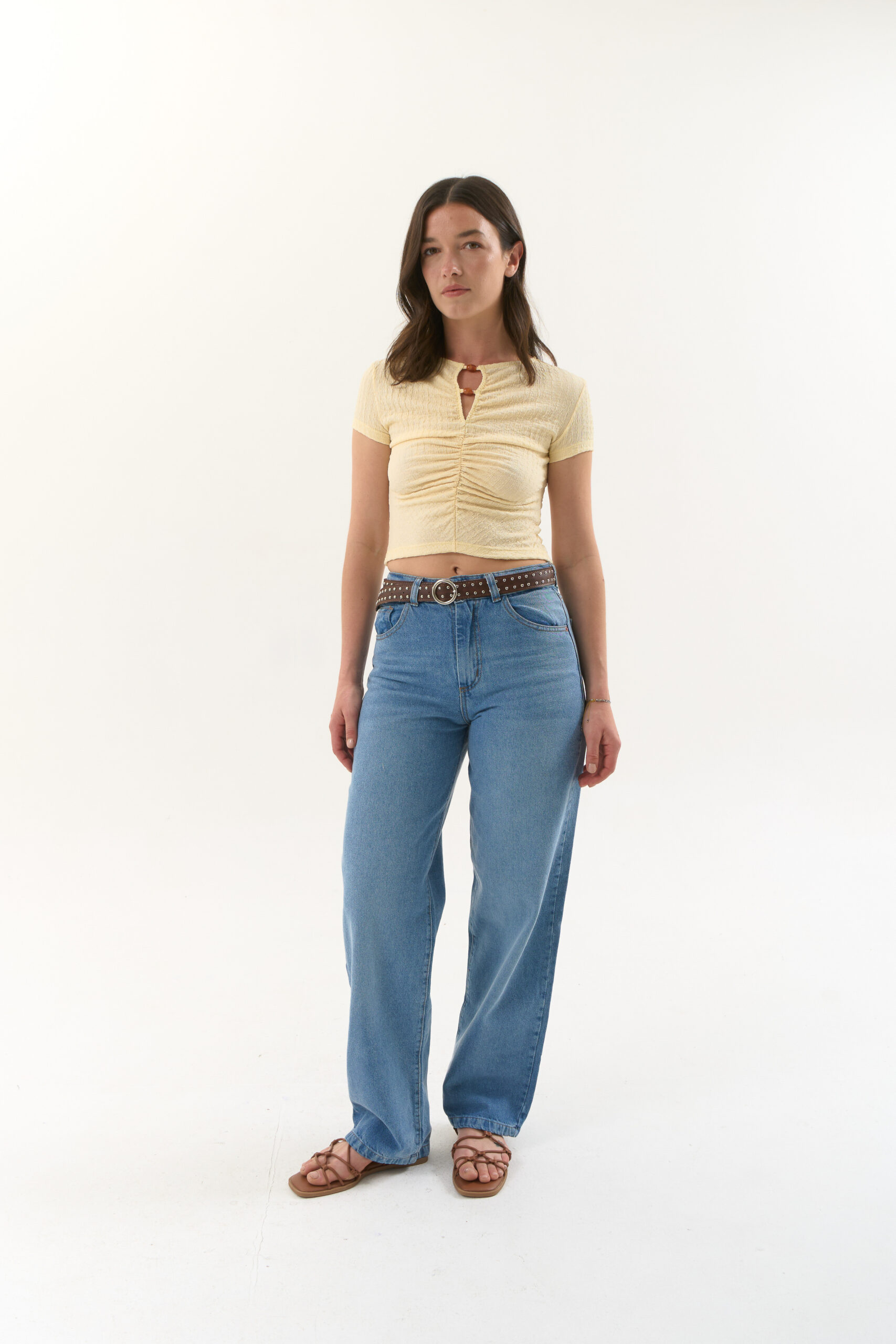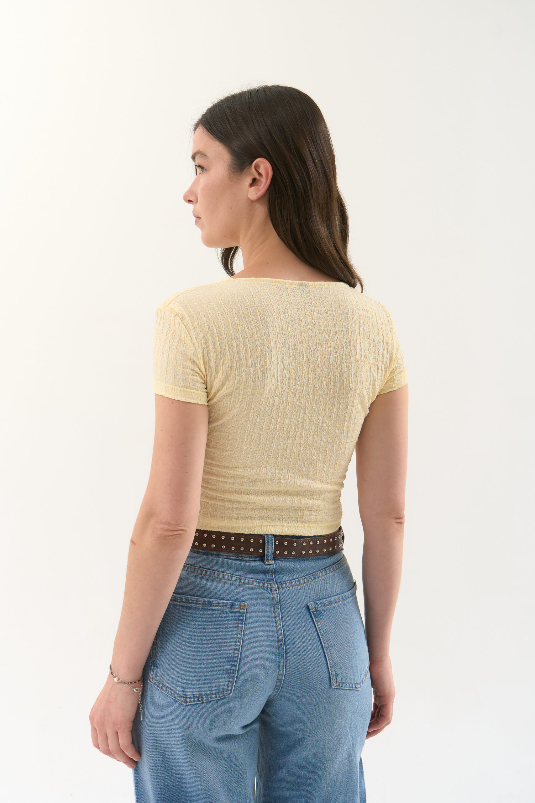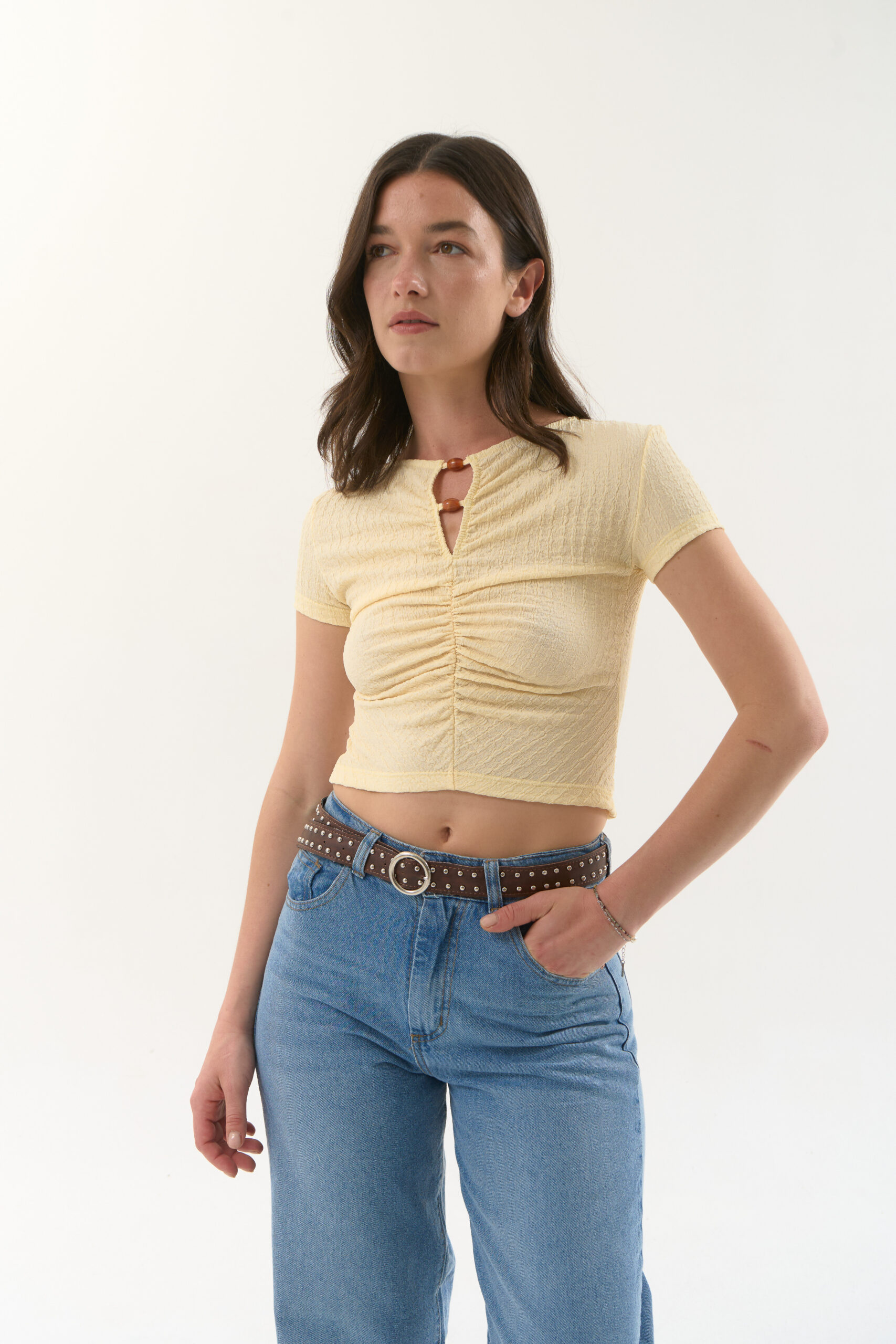 Remera manga corta de crepe texturado. Modelo con frunce en el delantero y detalle de canutillos en el cuello.