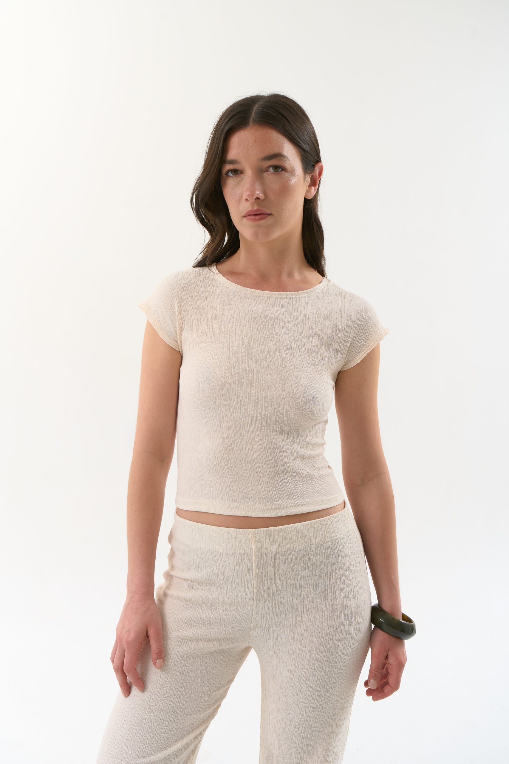 Remera de cuello redondo en bambula con spandex. Modelo sin mangas y con hombros caídos. Conjunto con pantalón ALESSIA
