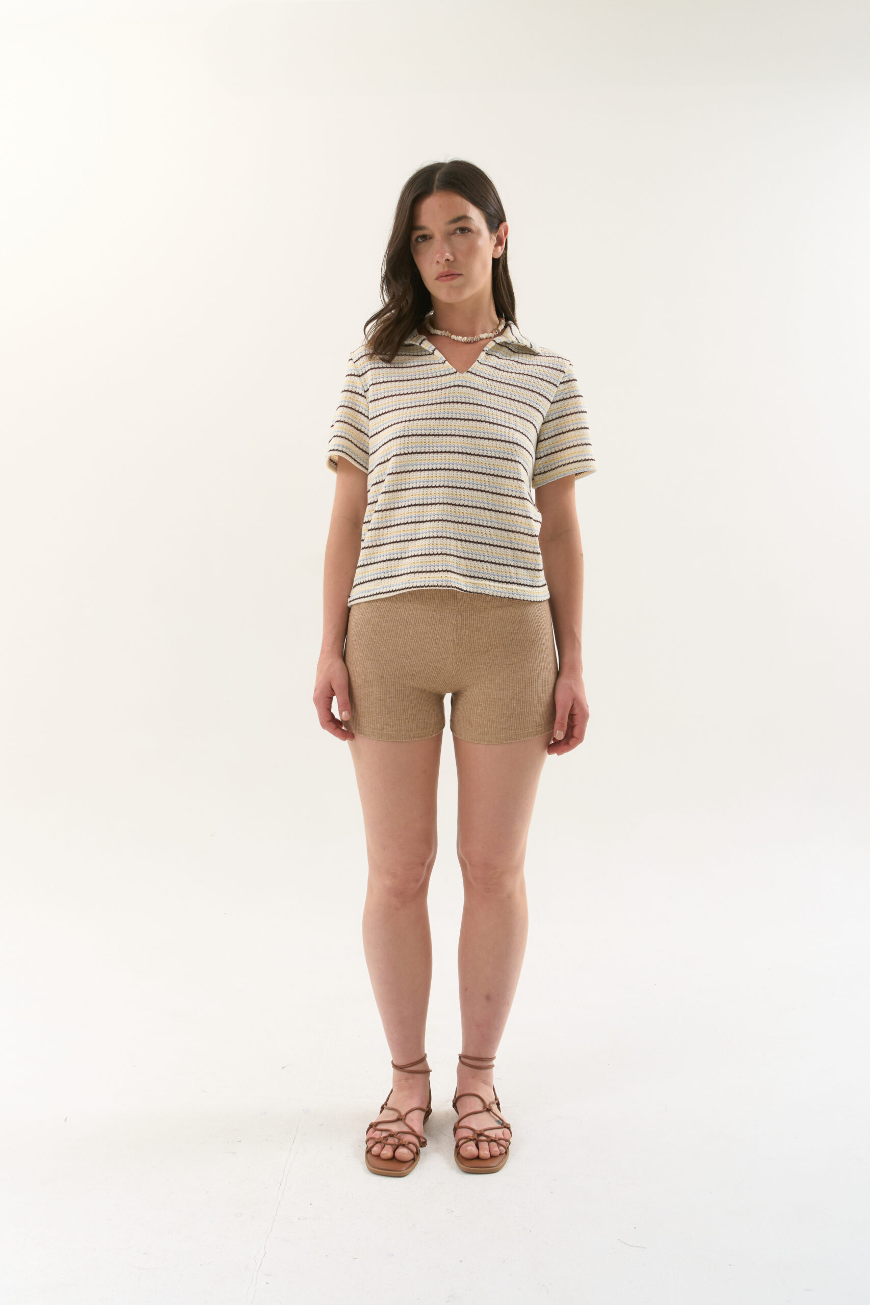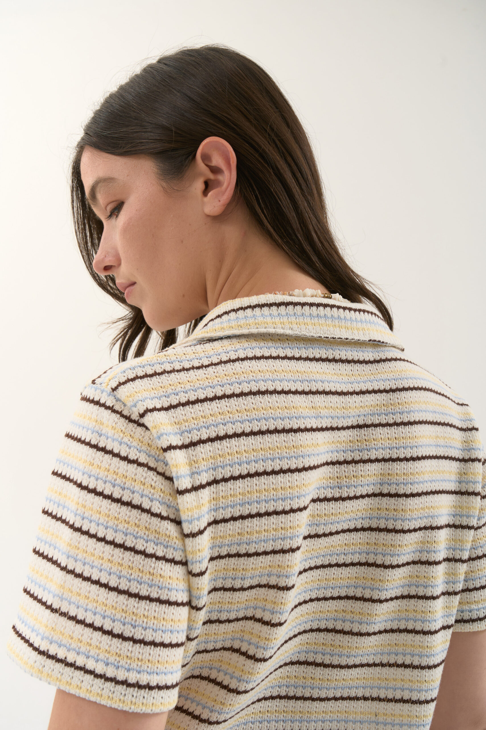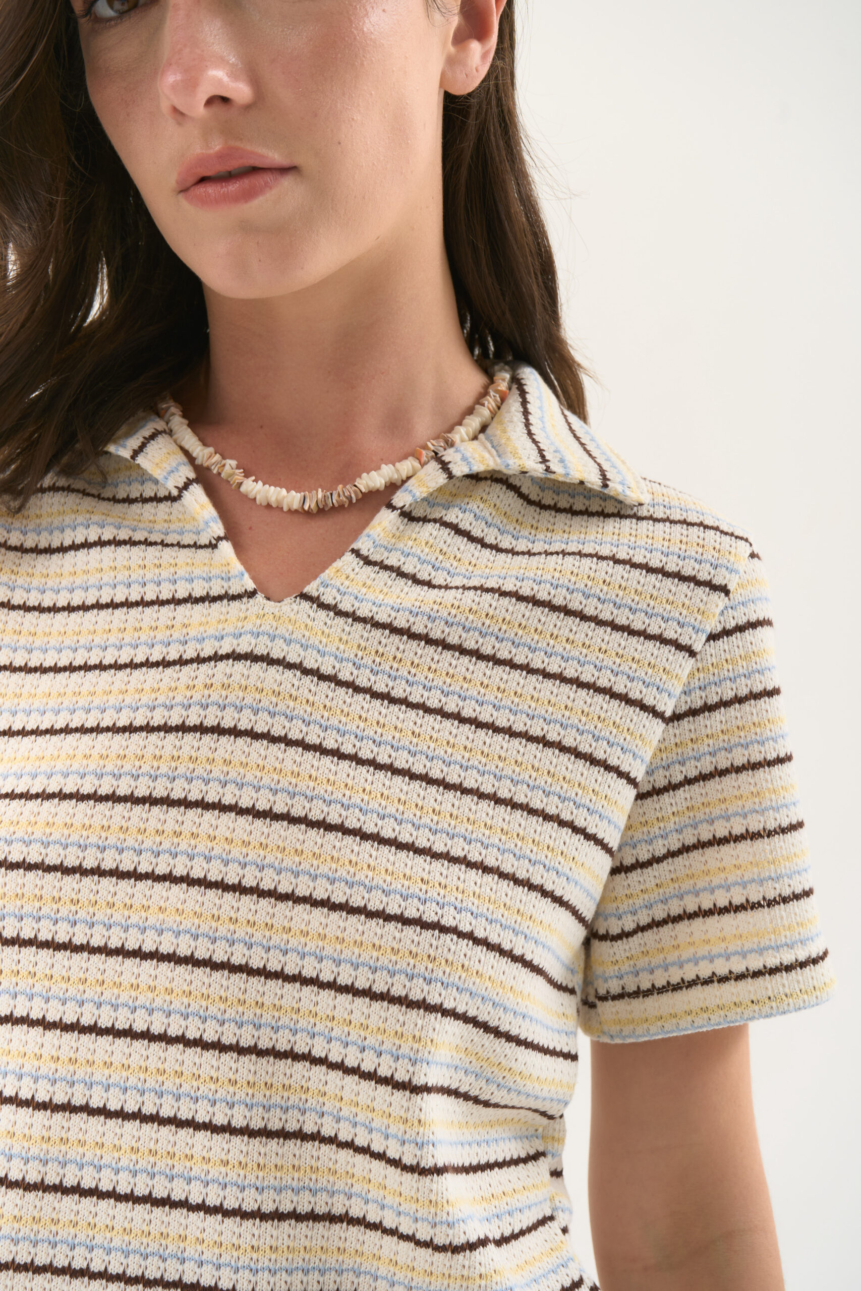 Remera con cuello estilo chomba en tejido rayado. Modelo con escote V terminado con vista interna.
