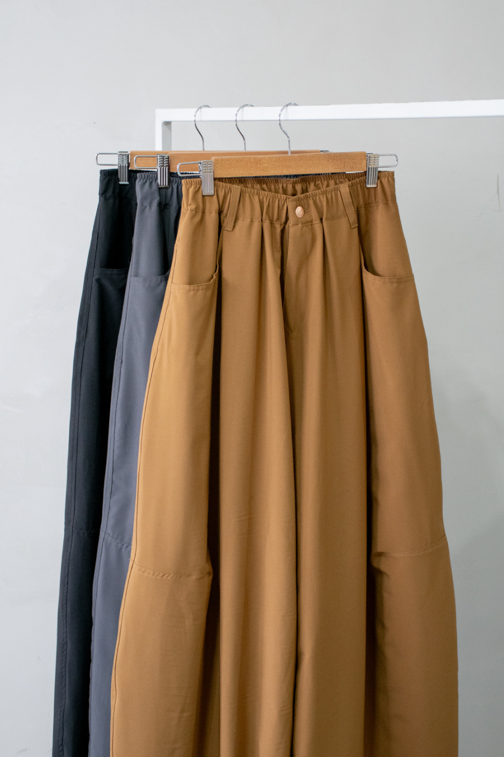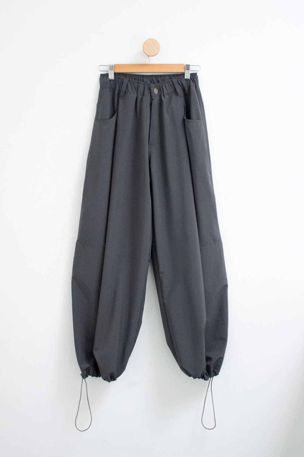 Pantalón liviano de tiro alto con corte holgado. Modelo con pinzas delanteras, cintura elástica y bolsillos. Piernas anchas con cordón elástico y tanca al tono para poder regular su ajuste.