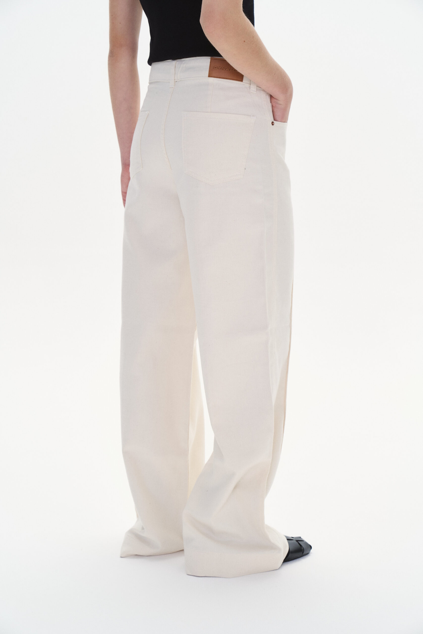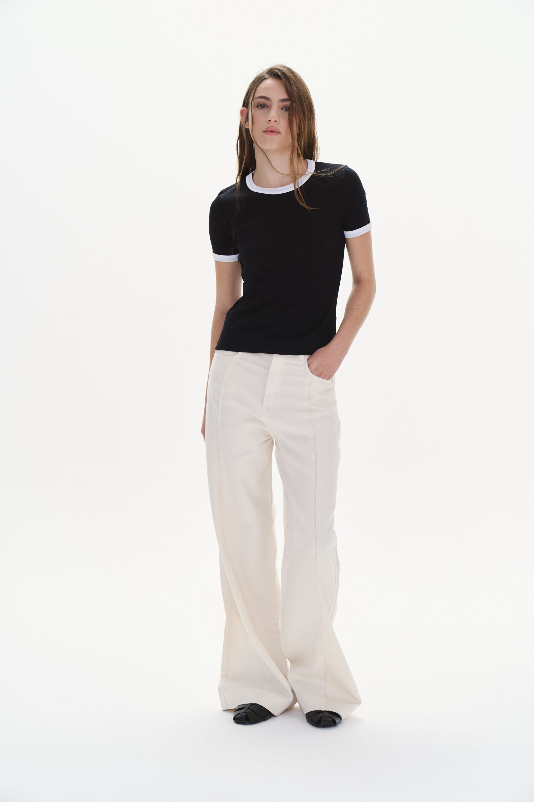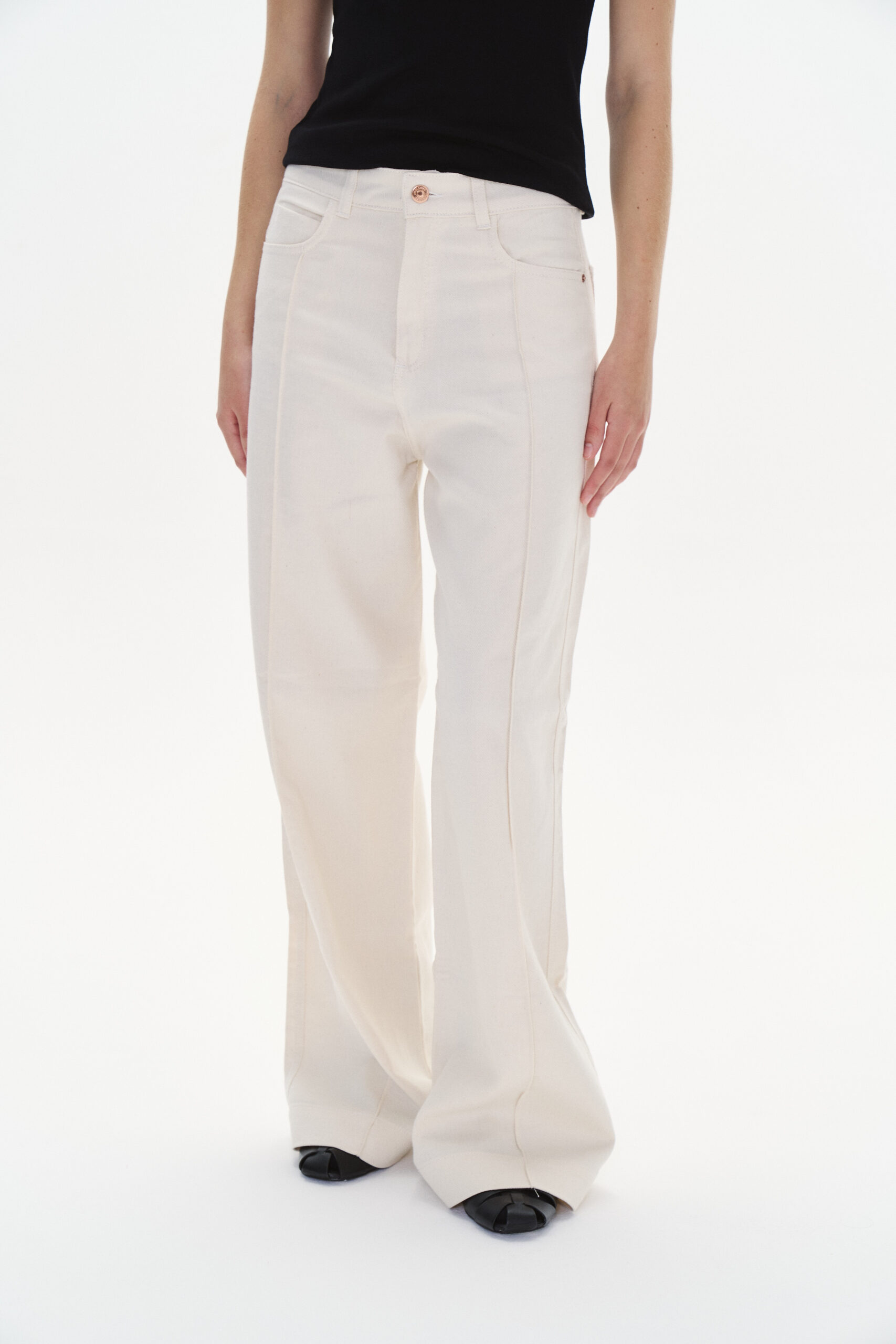 Modelo con piernas anchas y detalle de costura en el delantero. Bajo con ruedo ancho y cinco bolsillos.