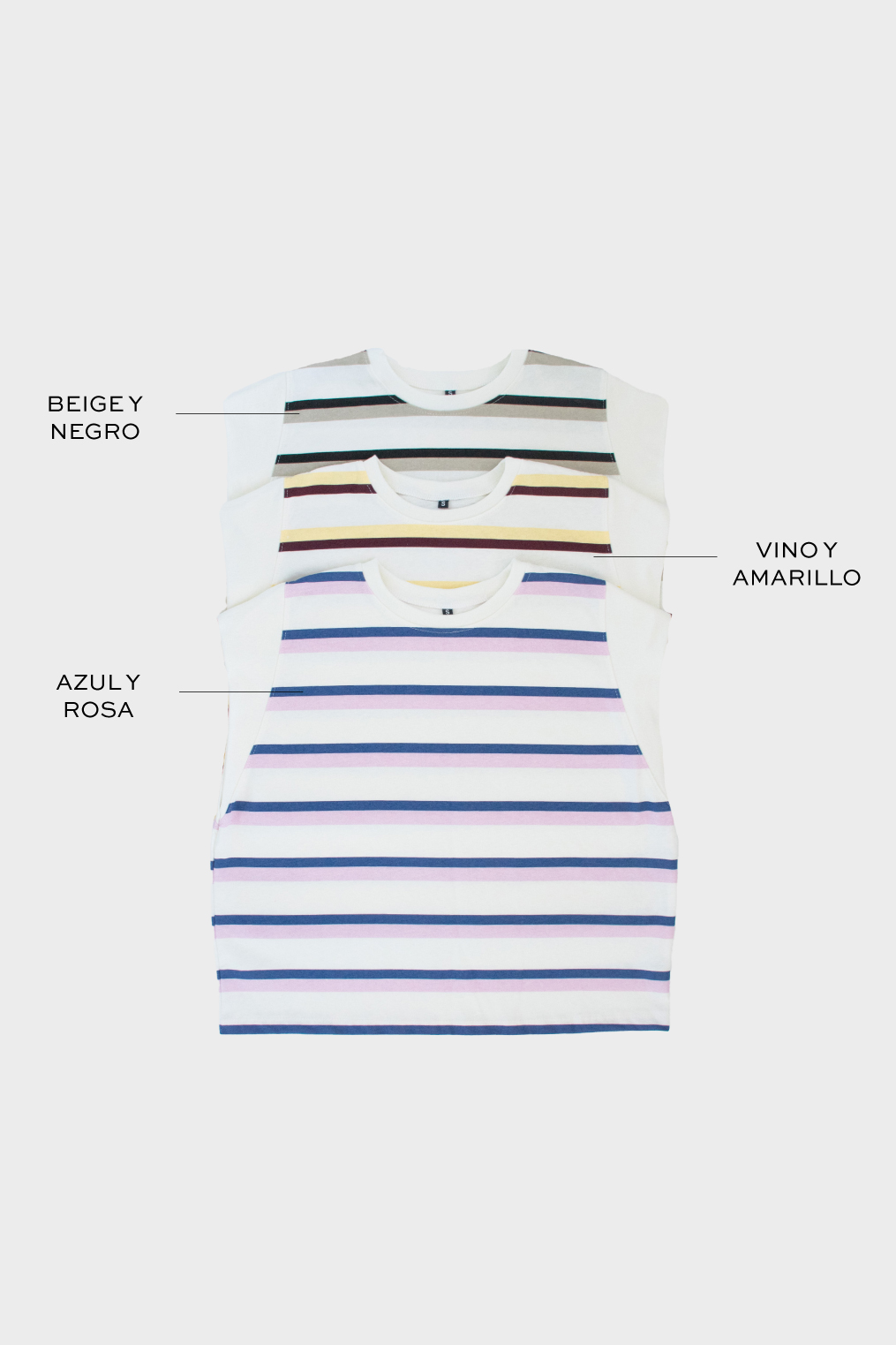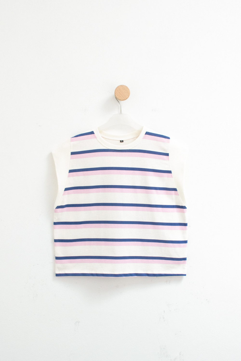 Remera en jersey algodón rayado con cuello redondo y silueta holgada. Modelo con hombros caídos de ribb.