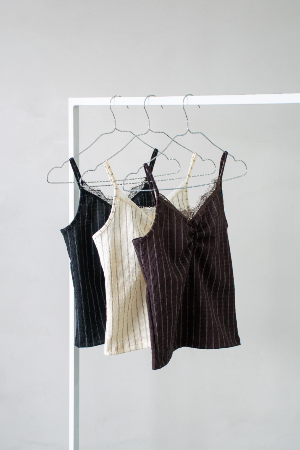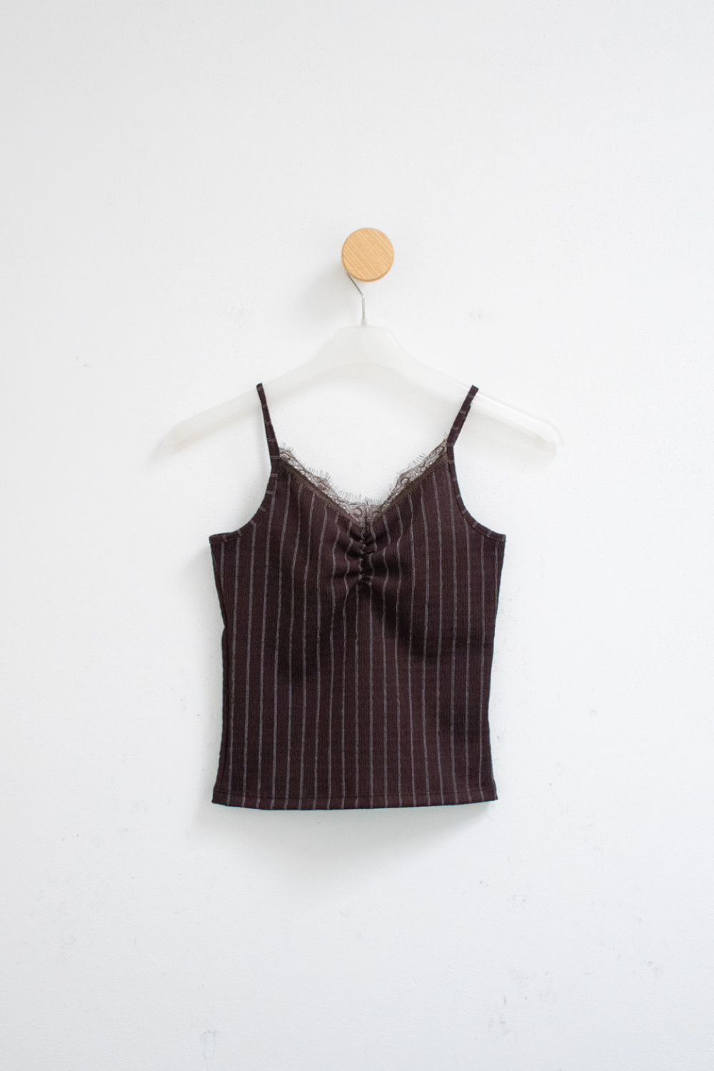 Musculosa de bambula con raya diplomática y escote V. Modelo con breteles finos y detalle de puntilla encaje en el escote.