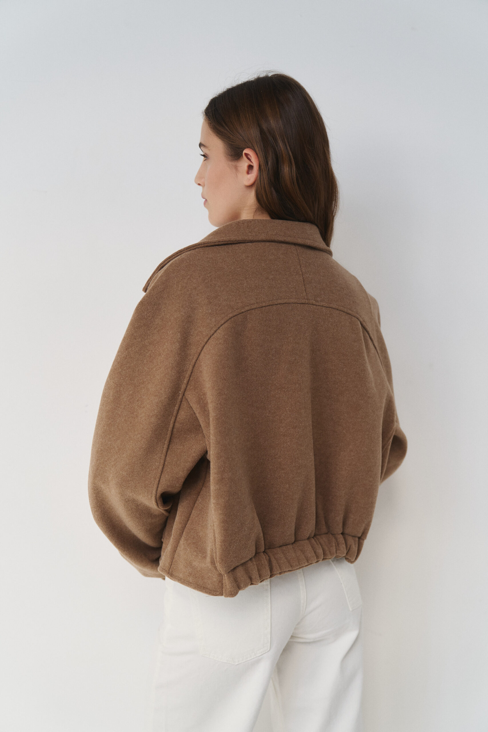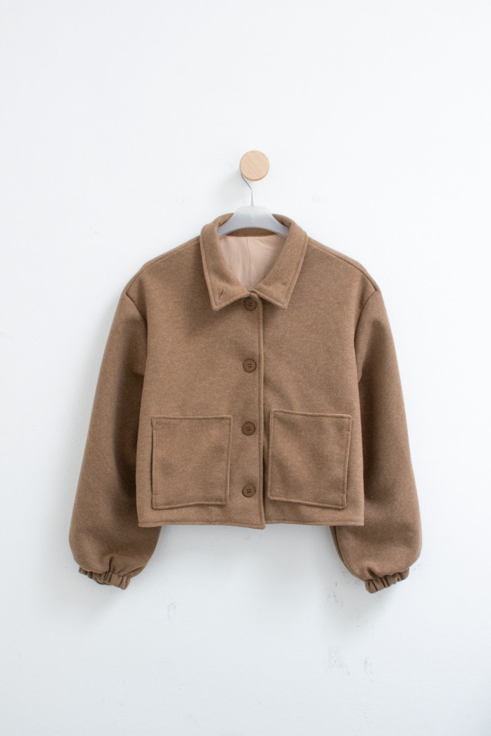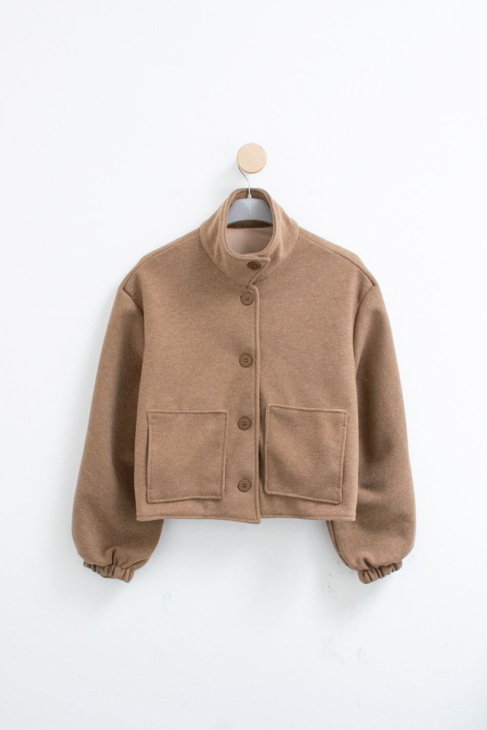 Chaqueta de paño con forro interno. Modelo con cuello, bolsillos delanteros y cierre de prenda con botones. Detalle de elástico en puños y bajo espalda.