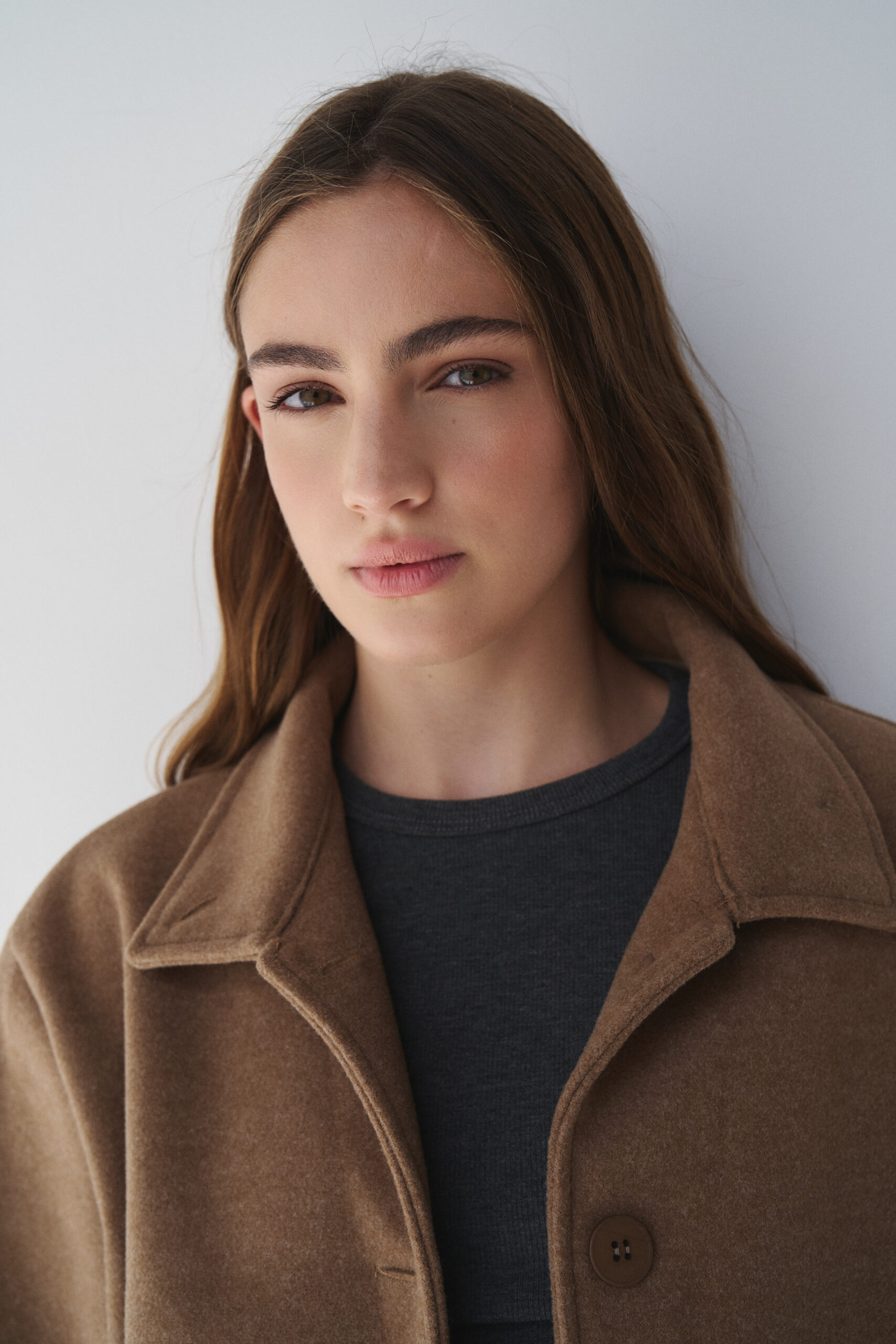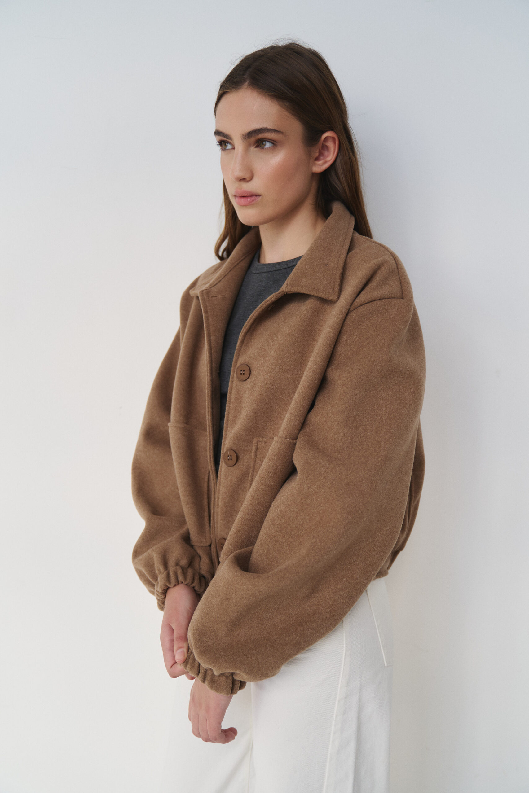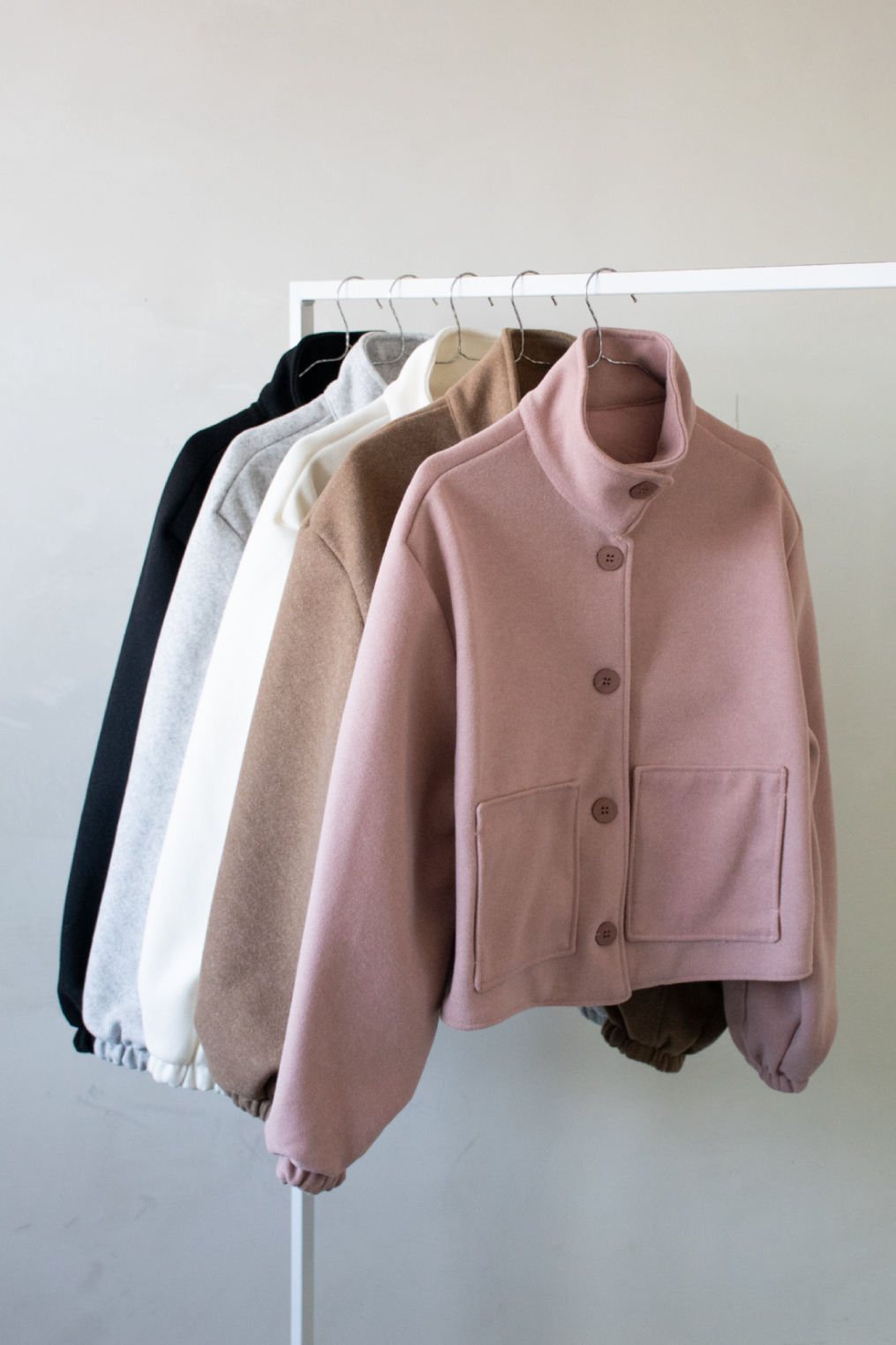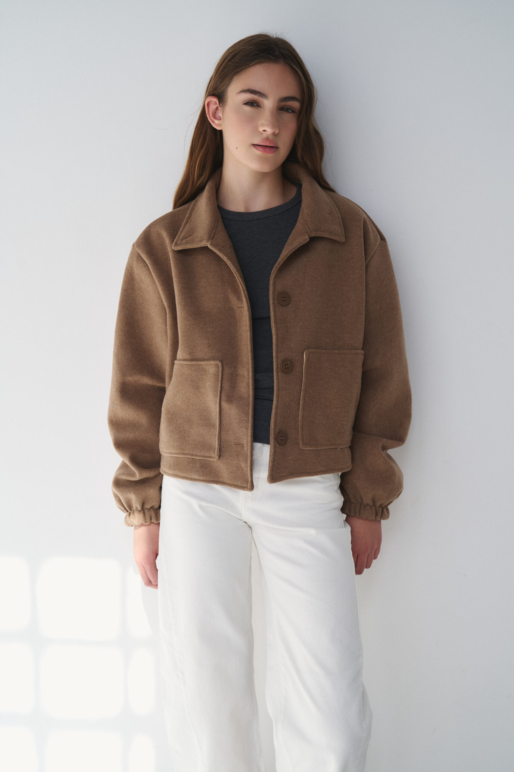Chaqueta de paño con forro interno. Modelo con cuello, bolsillos delanteros y cierre de prenda con botones. Detalle de elástico en puños y bajo espalda.