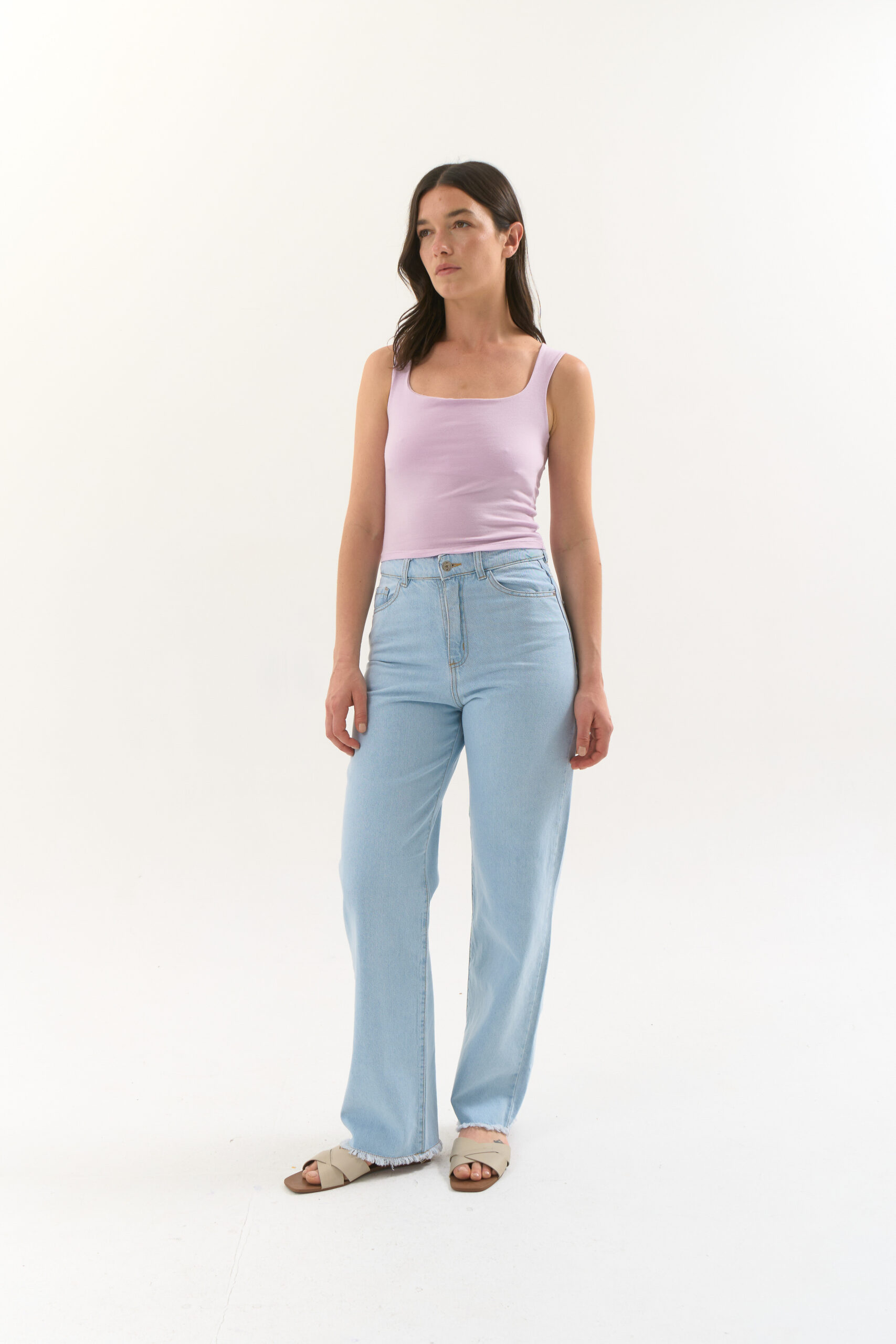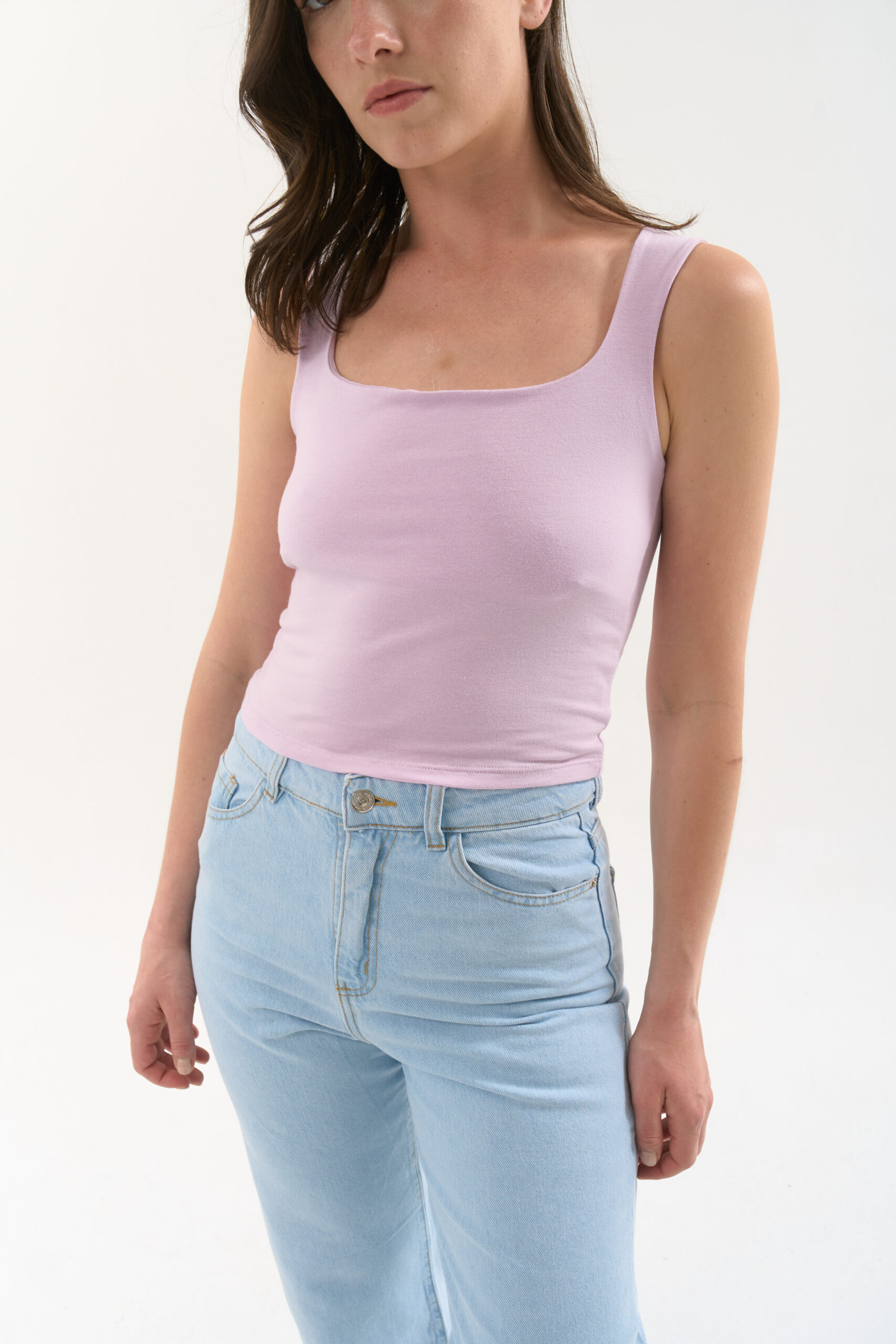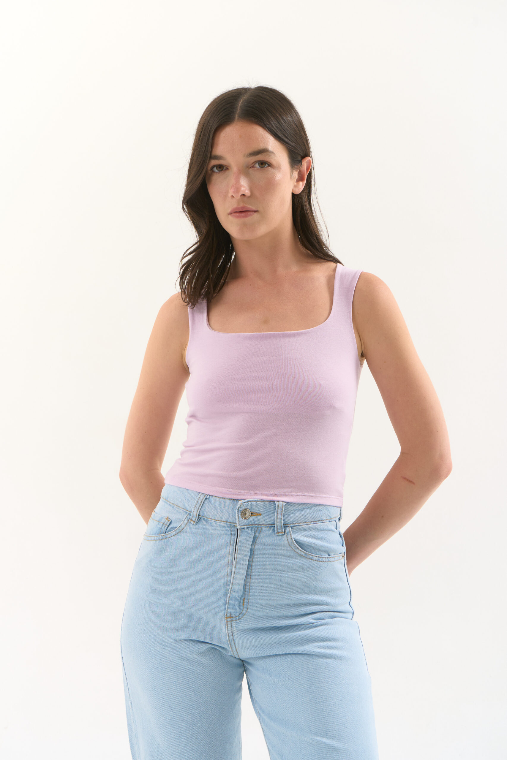 Top sin mangas de algodón con lycra con escote cuadrado en delantero.