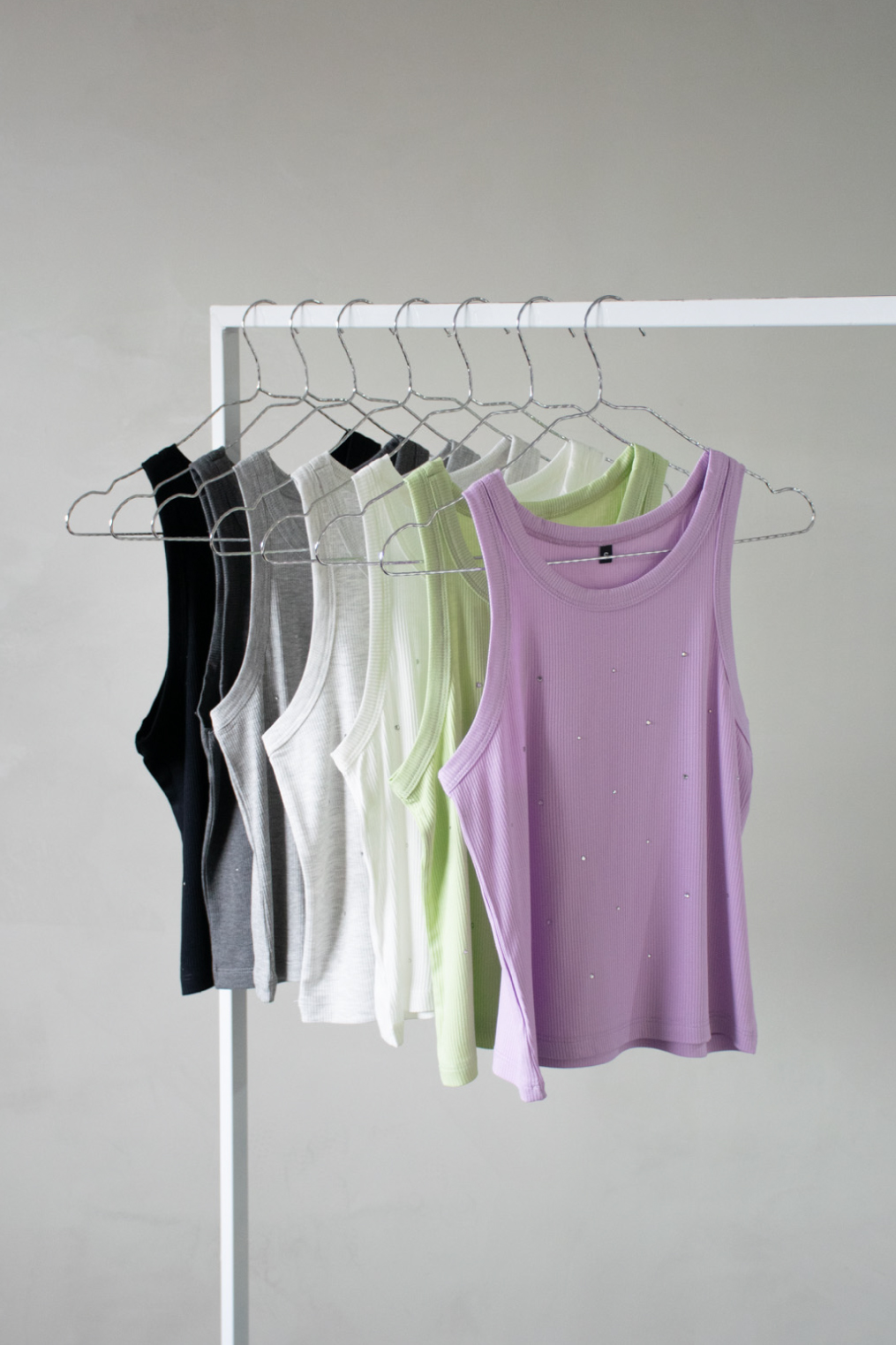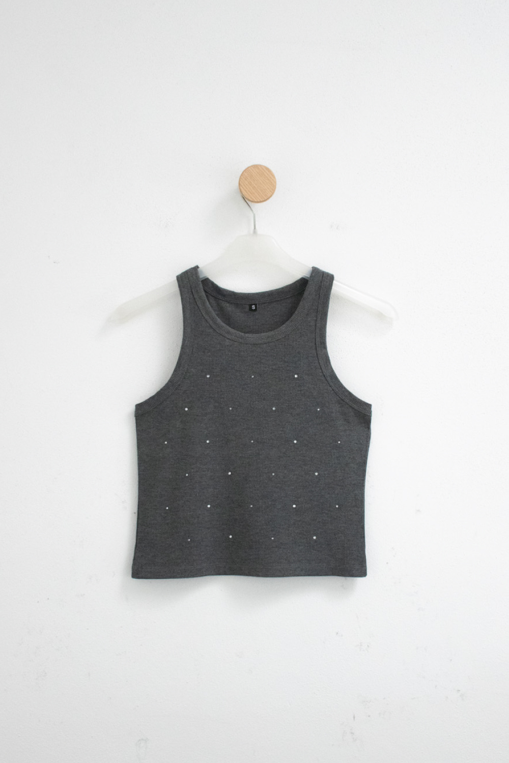 Top de morley viscosa baston ancho y detalle de hotfix. Modelo de cuello redondo. Sin mangas.