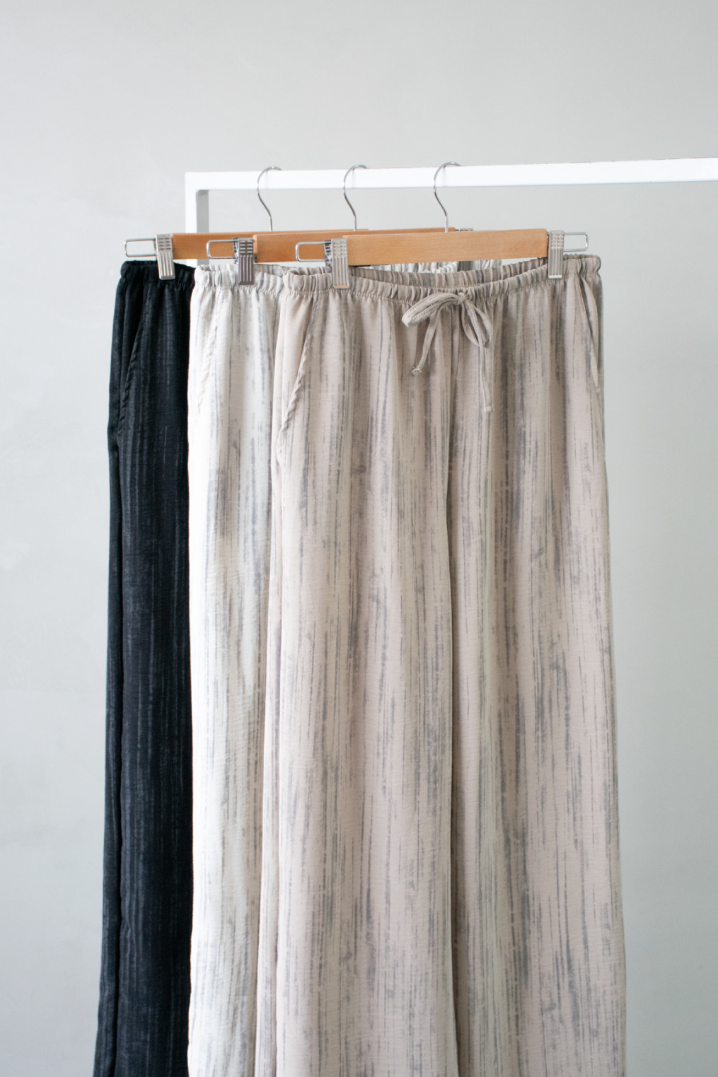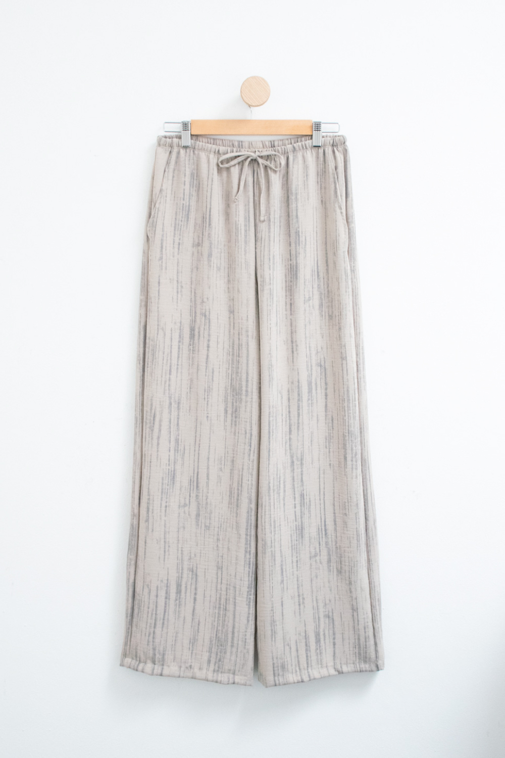 Pantalón sastrero estampado con piernas rectas anchas y tiro medio/alto. Modelo con bolsillos laterales. Cintura con cordón regulable de la misma tela.