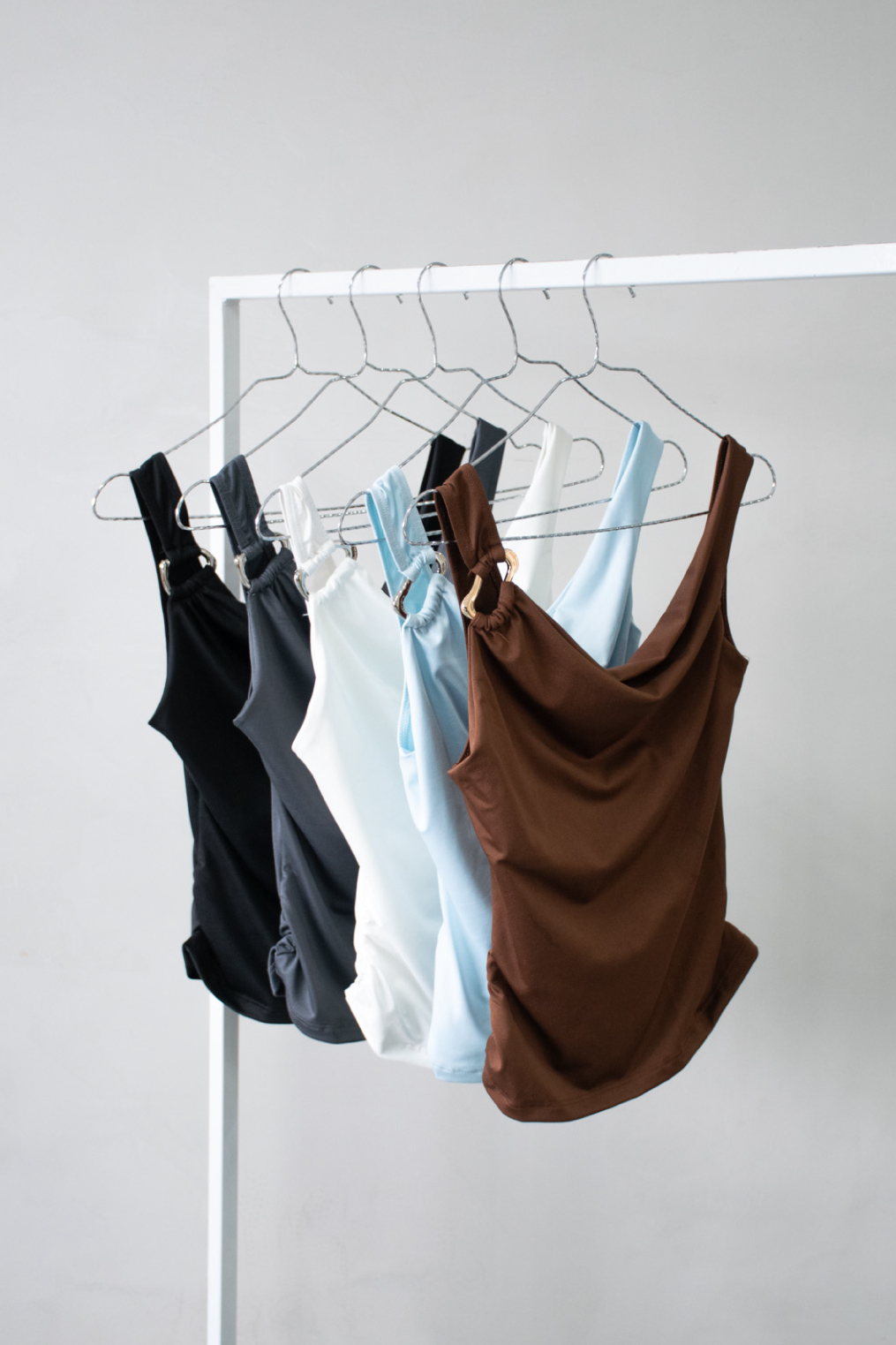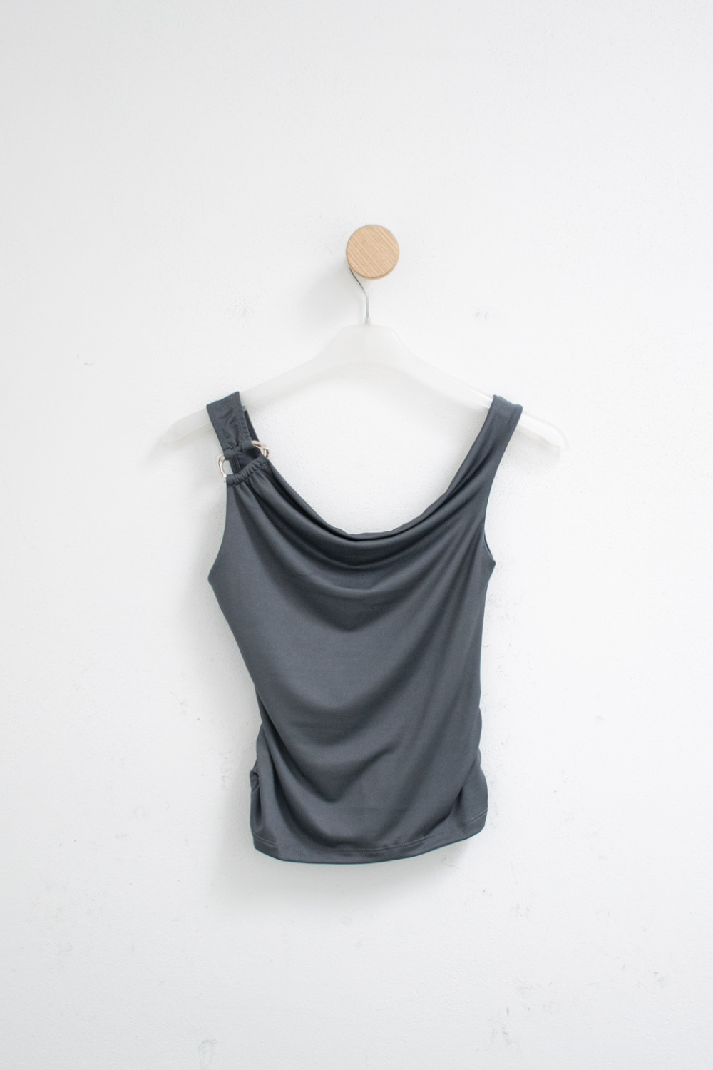 Top de microfibra con un hombro caído y frunce en laterales. Detalle de pasador metálico.