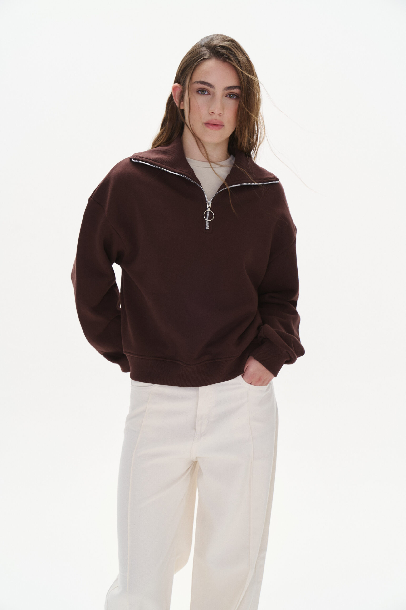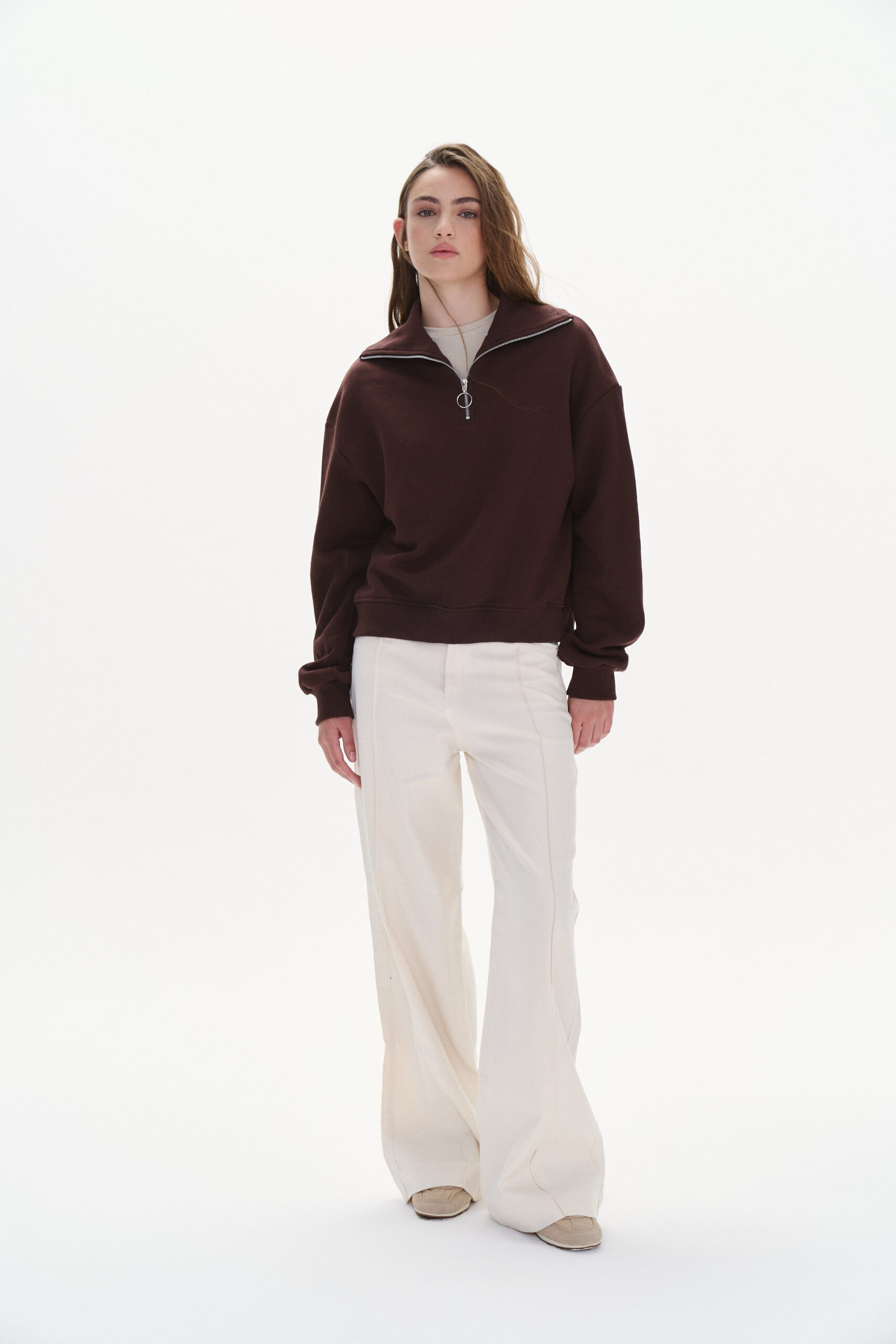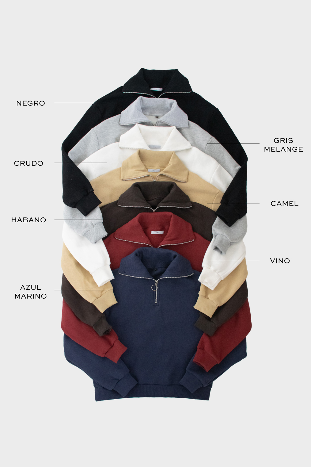Buzo oversize en suave frisa invisible. Modelo con cierre en el delantero superior y terminación con complemento morley.