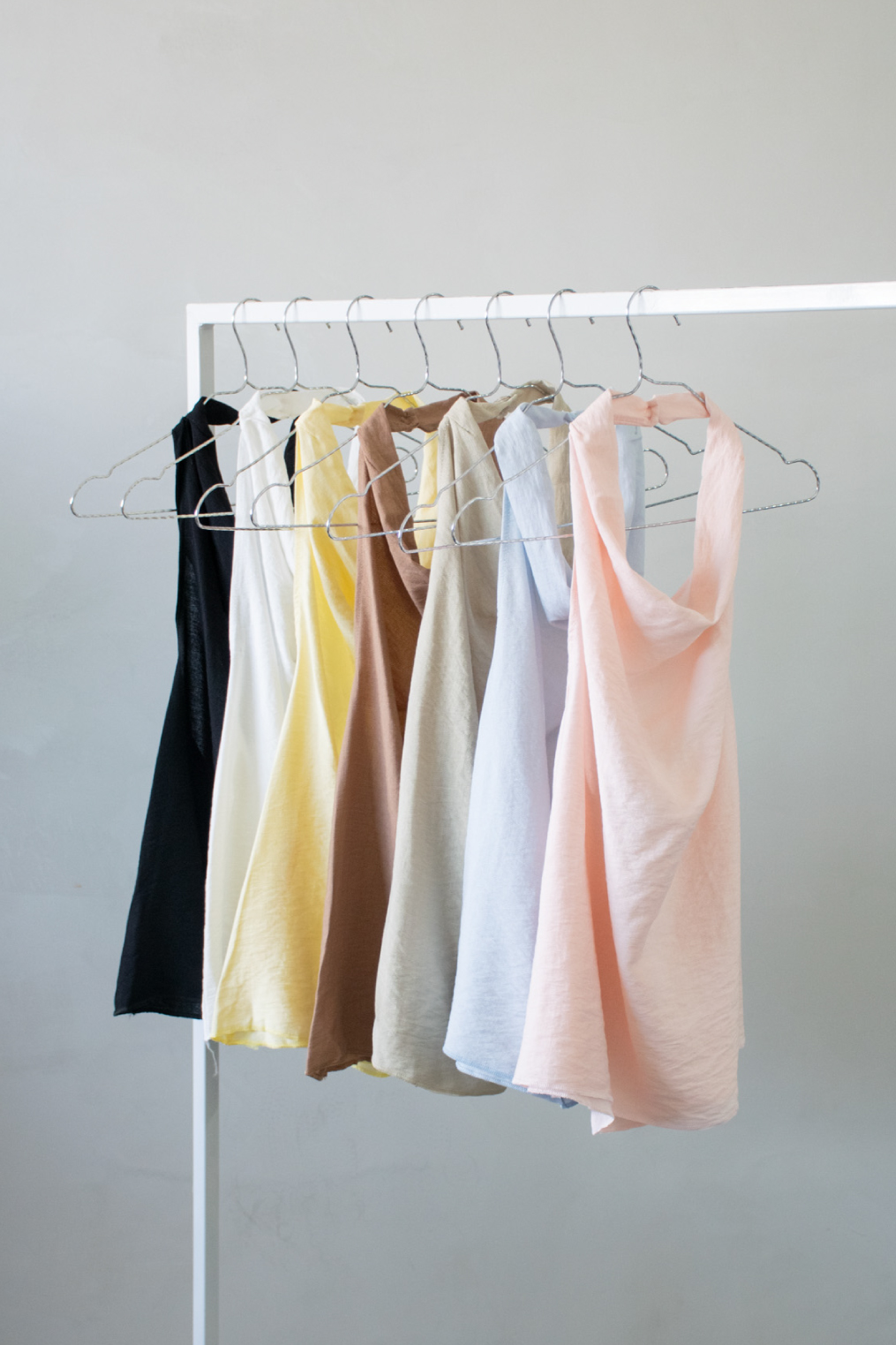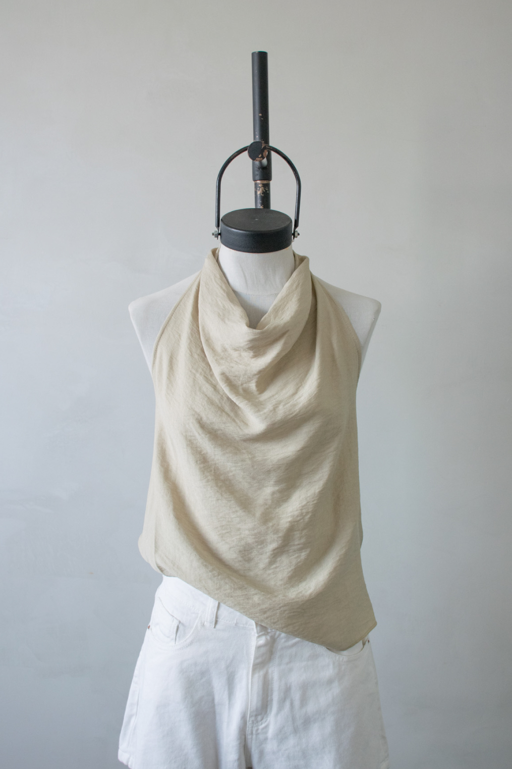 Top de lino rayón con caída suave y diseño halter cruzado.