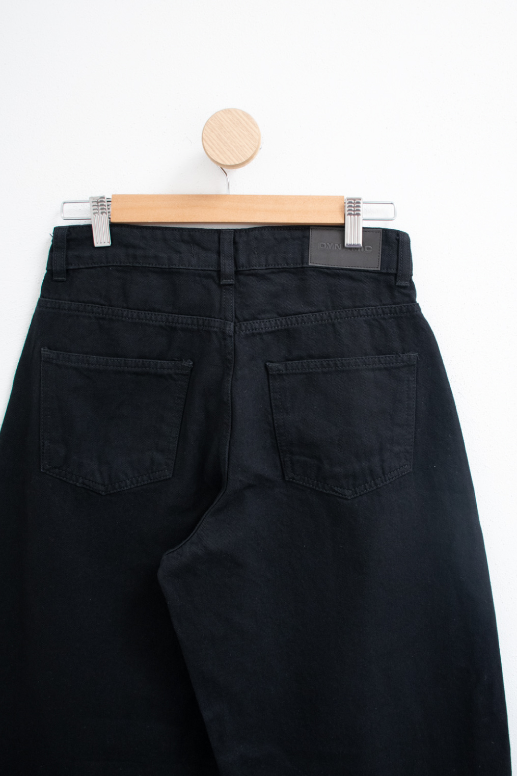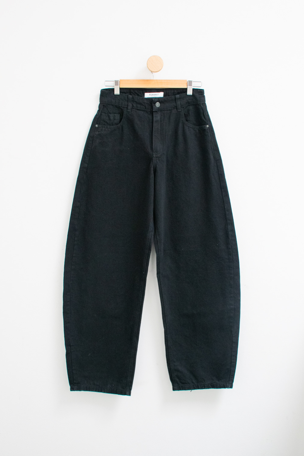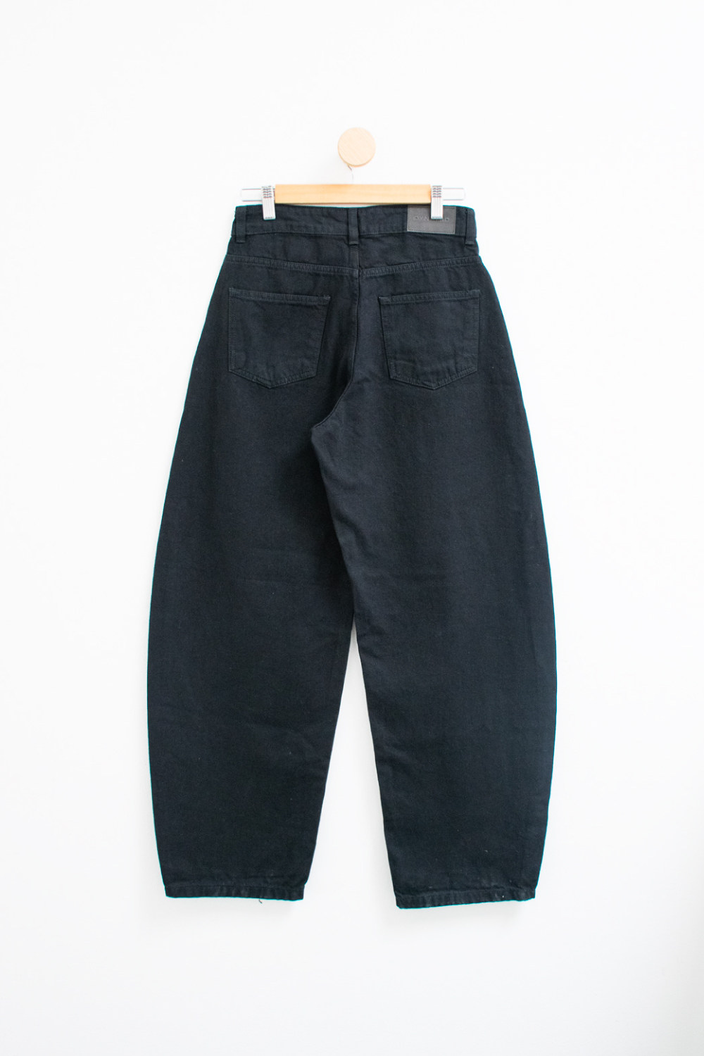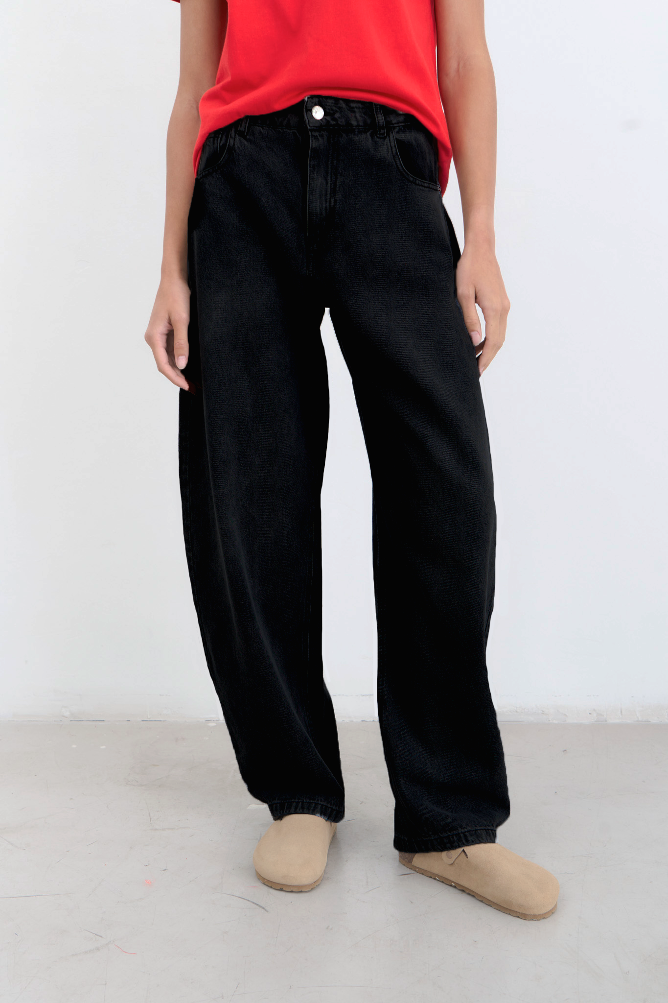 Jean rígido 100% algodón con piernas anchas estilo balloon y tiro medio/alto.