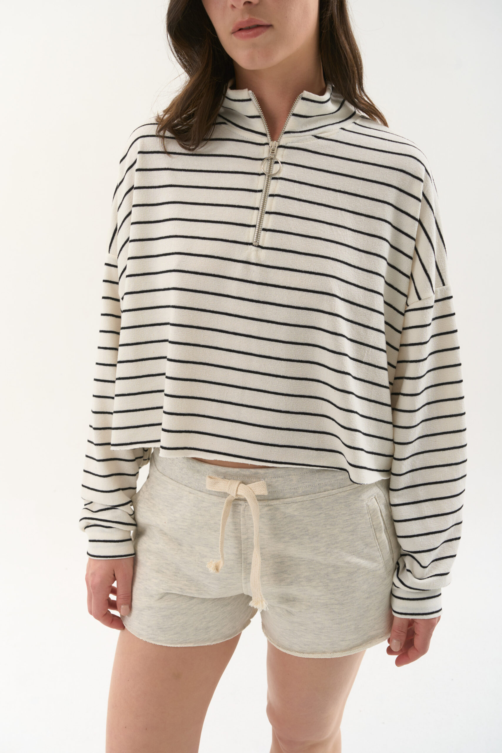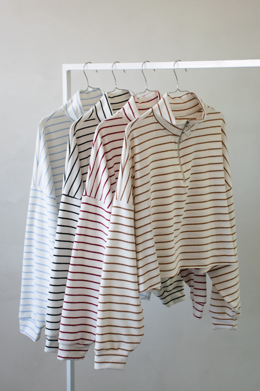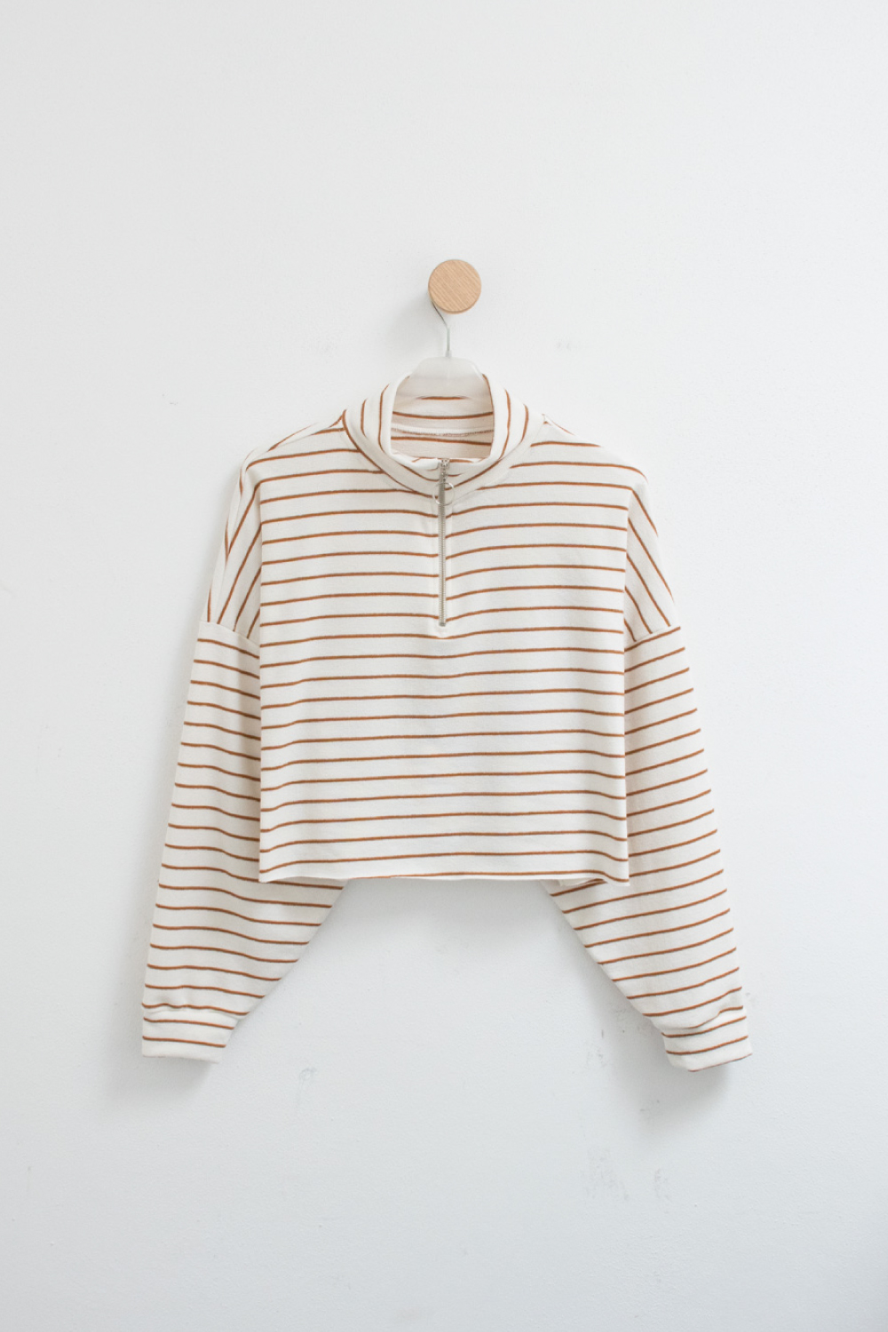 Buzo rústico rayado con cuello subido y cierre en el delantero.