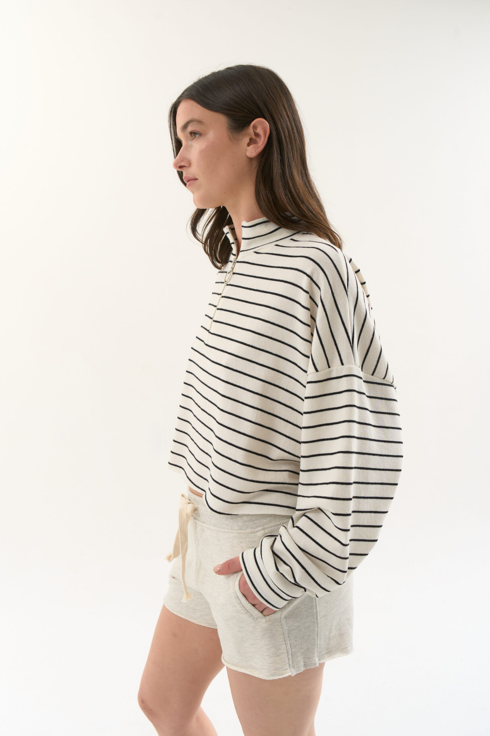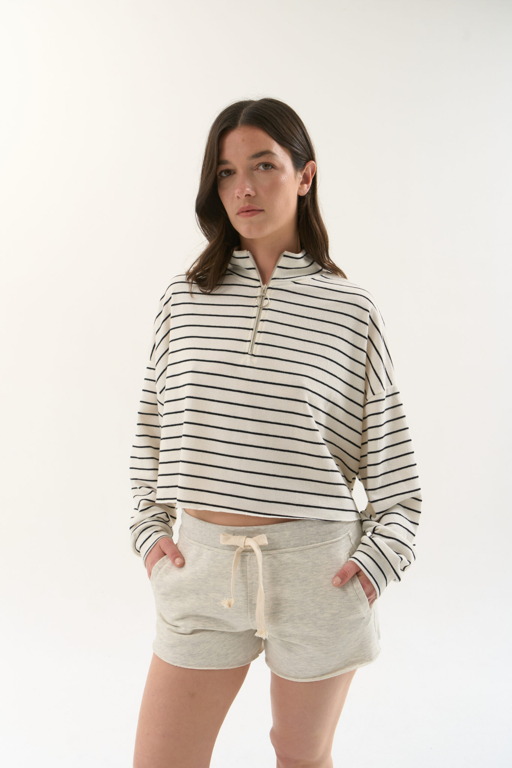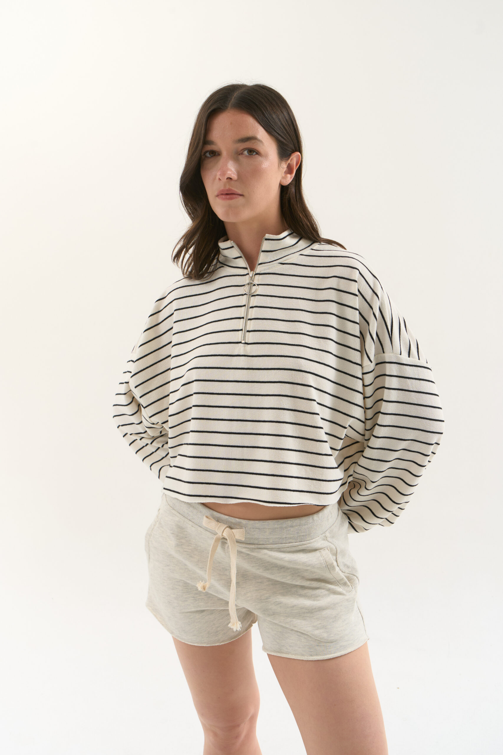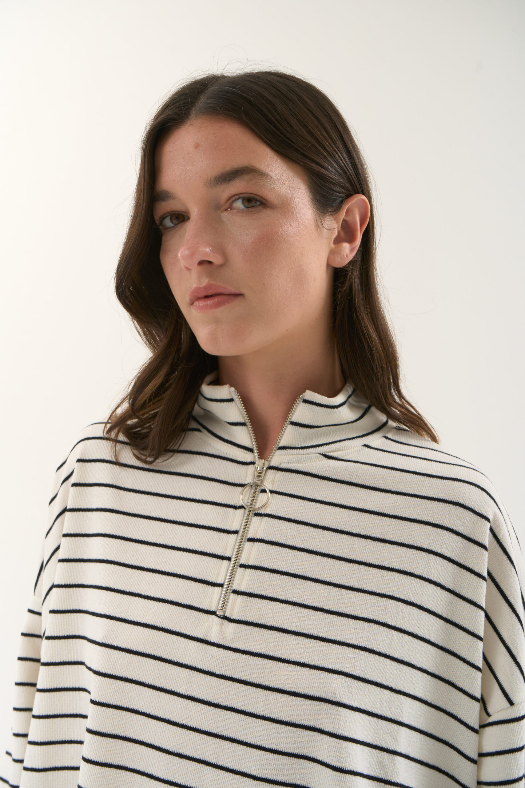 Buzo rústico rayado con cuello subido y cierre en el delantero.