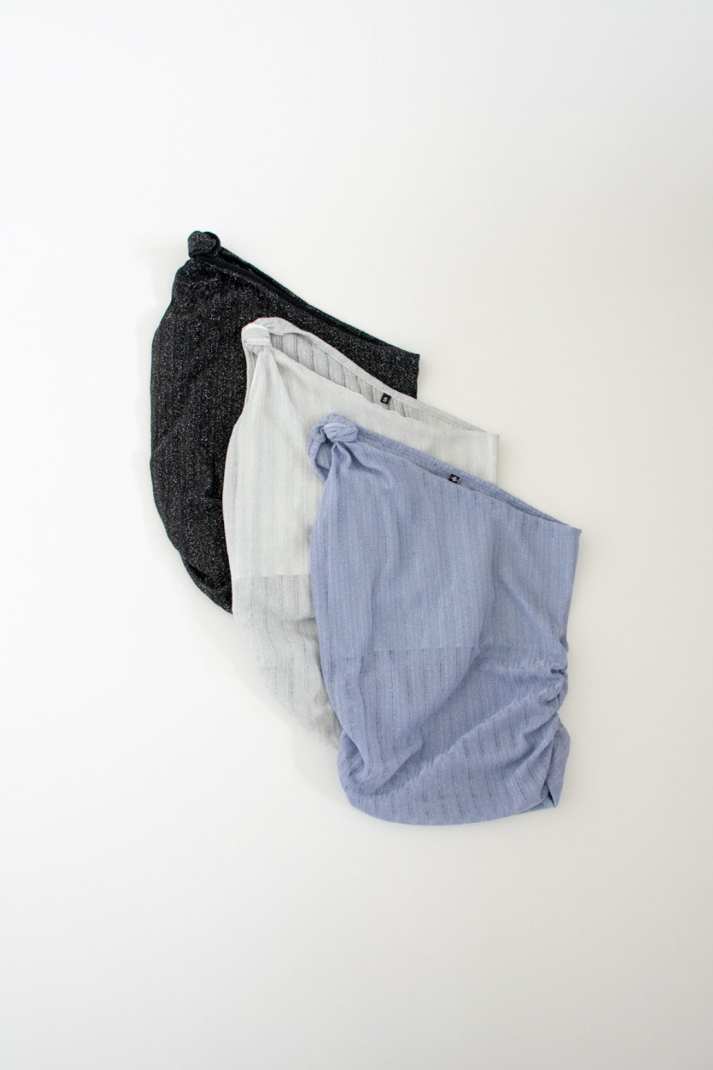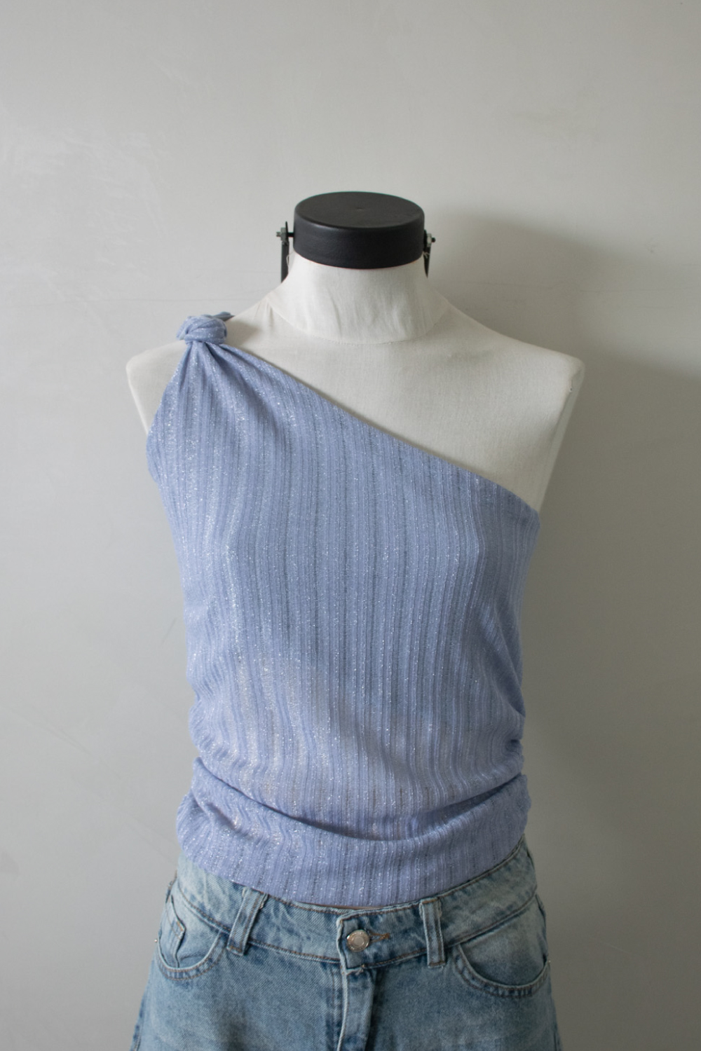 Top con un hombro fabricado en morley con lurex. Modelo con forro interno en el delantero hasta el busto y detalle de nudo en la parte superior derecha.