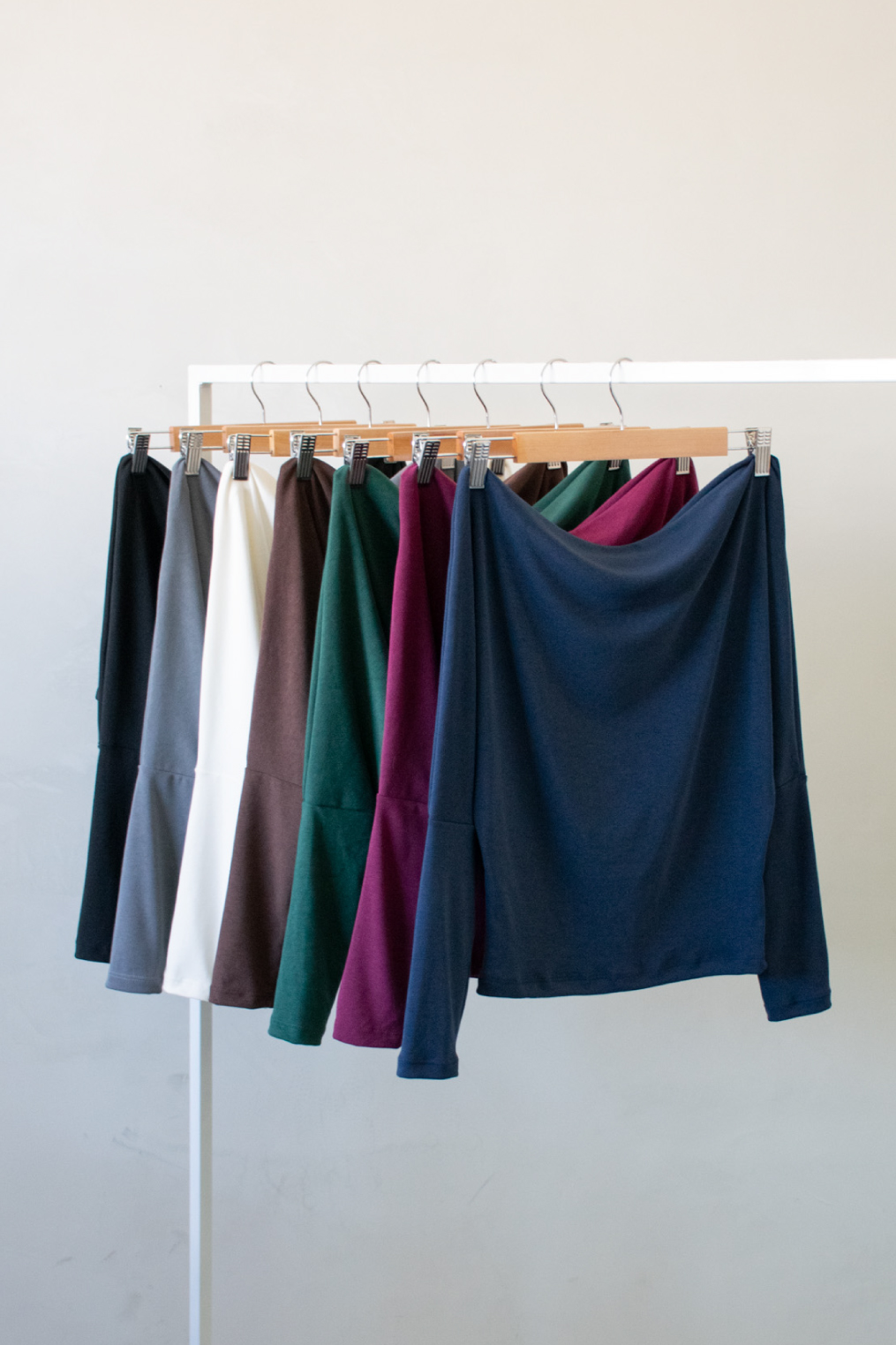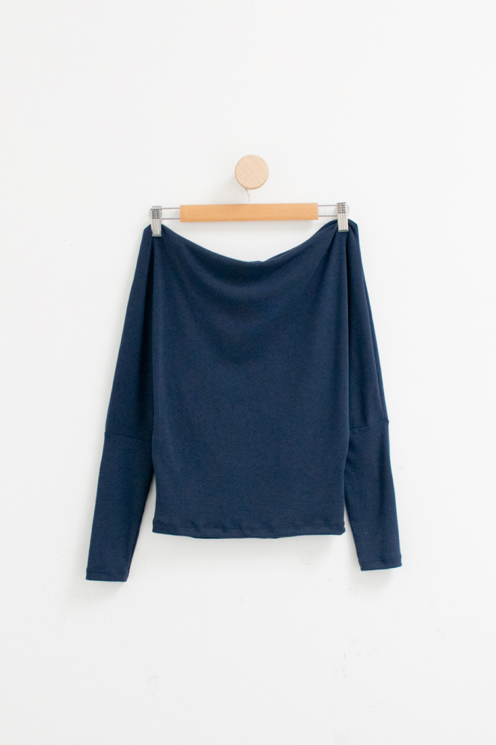 Remera manga larga de viscosa pesada con spandex. Modelo holgado con cuello bote ceñido en la cintura.
