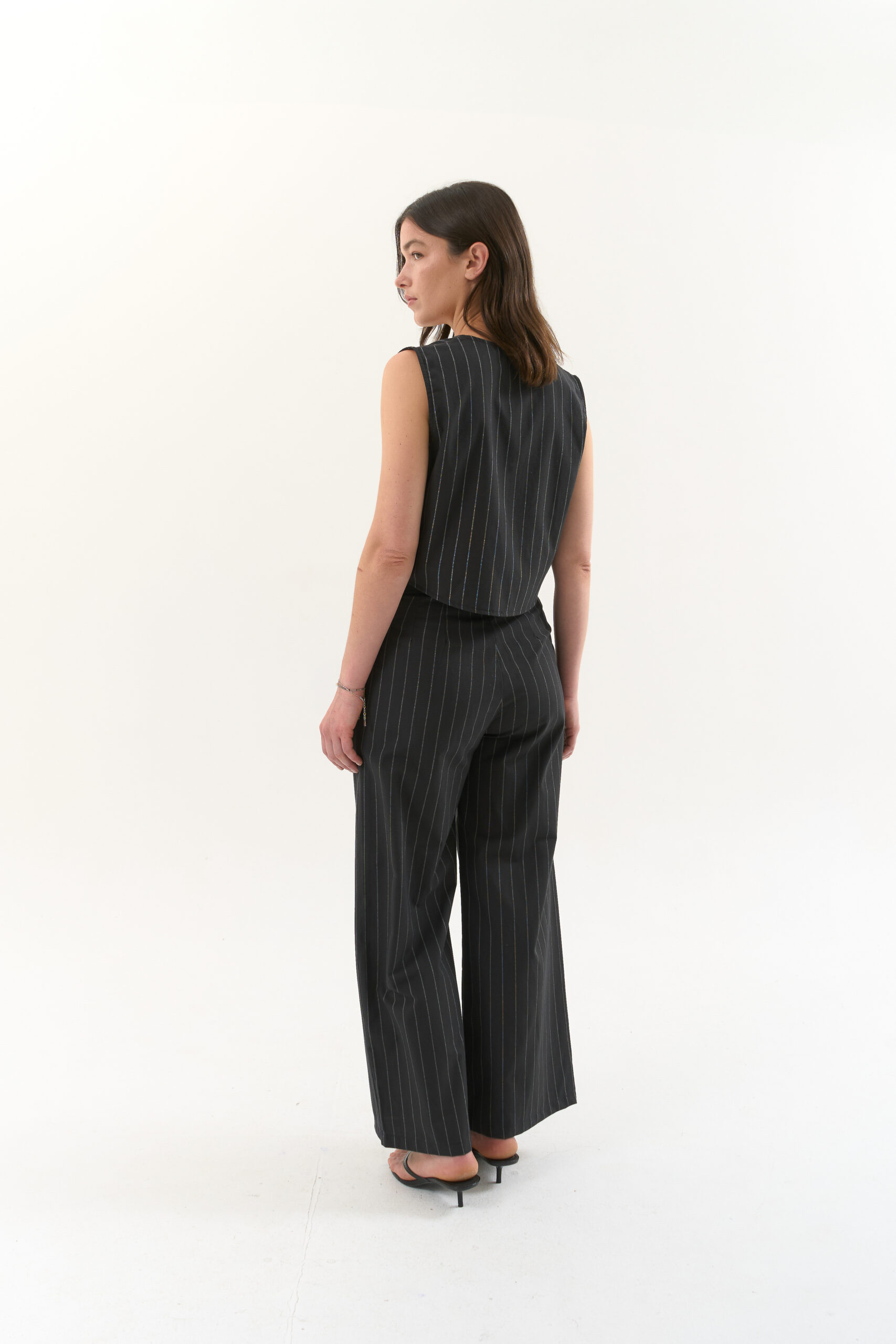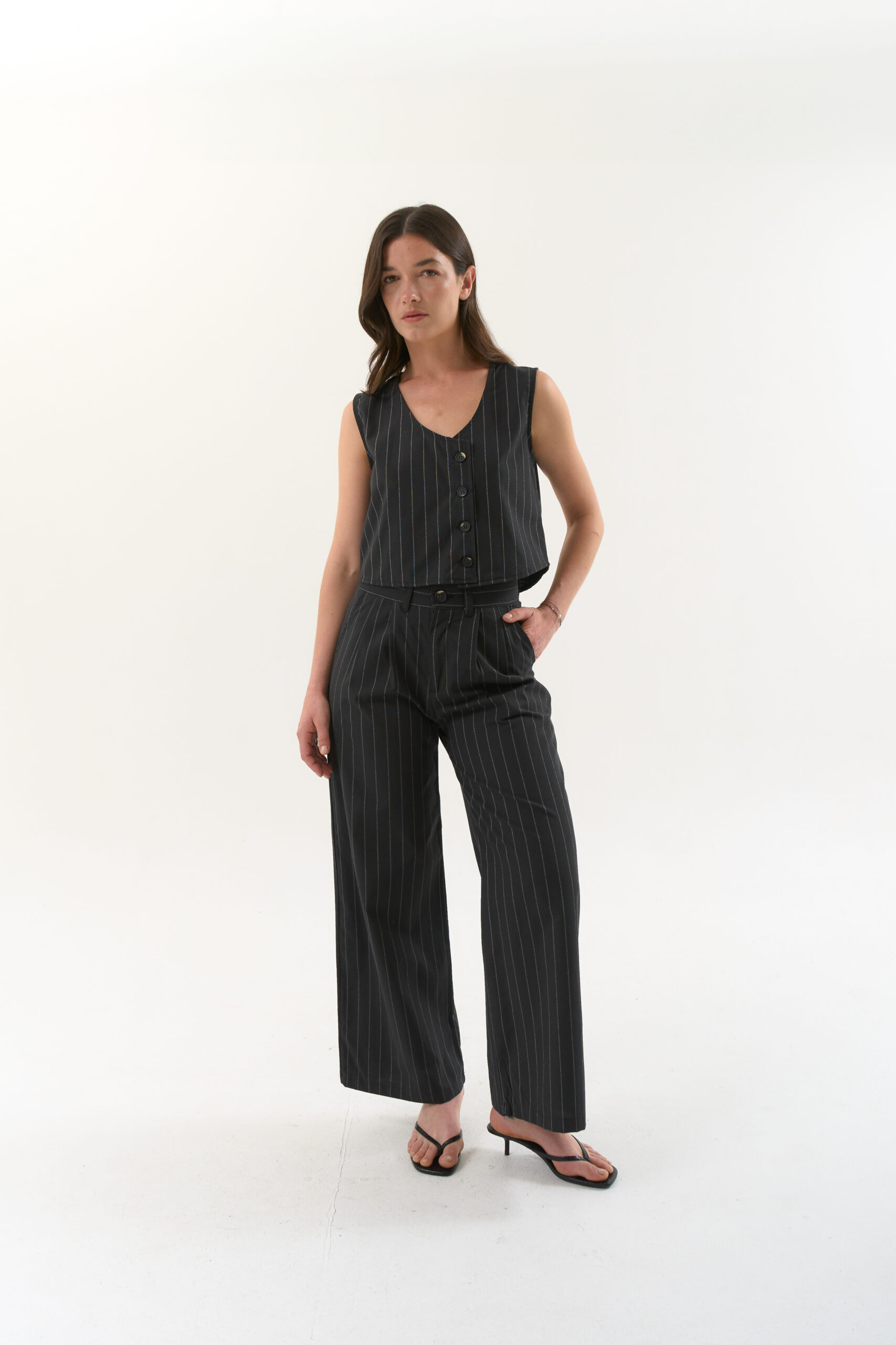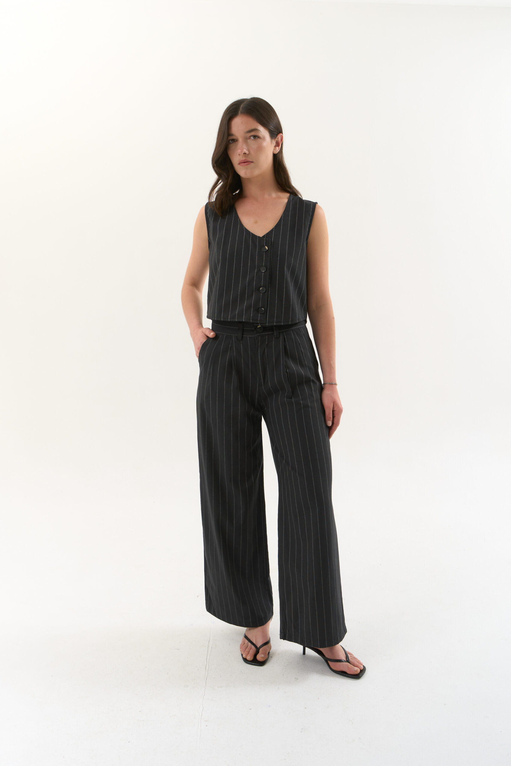 Pantalón sastrero tiro alto rayado. Modelo de piernas anchas con pinzas en delantero y trasero. Acceso prenda botón y cierre. Bolsillos laterales en delantero.