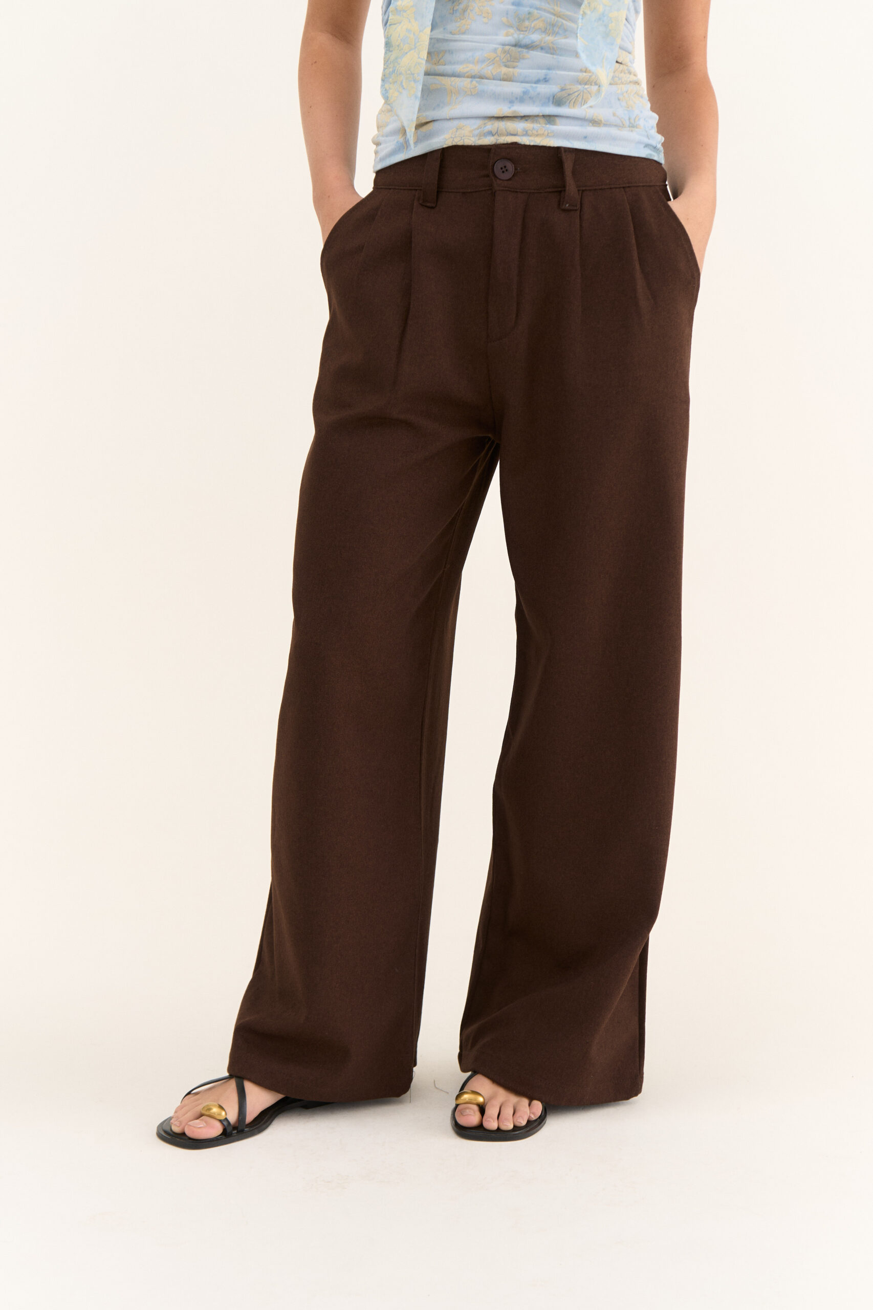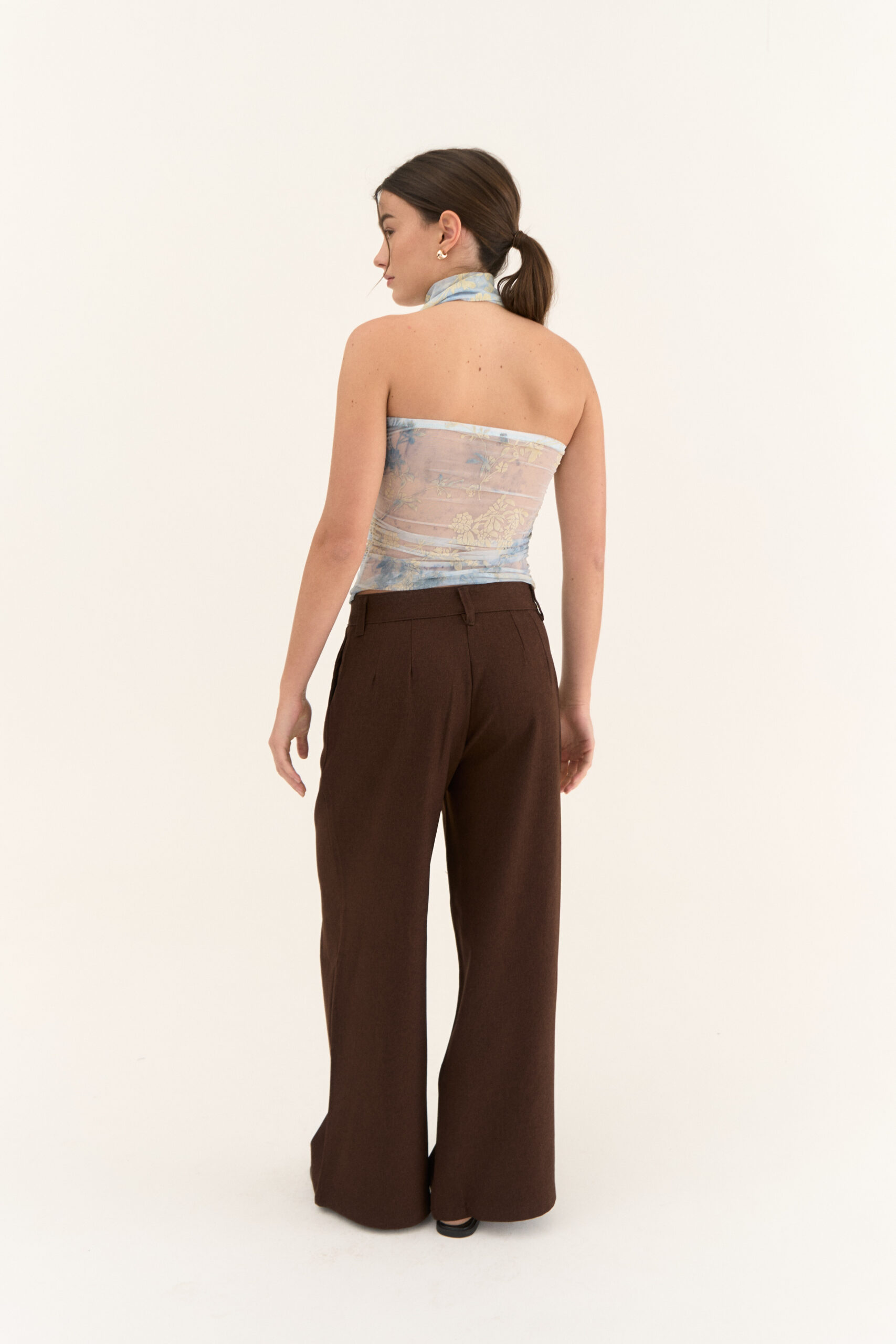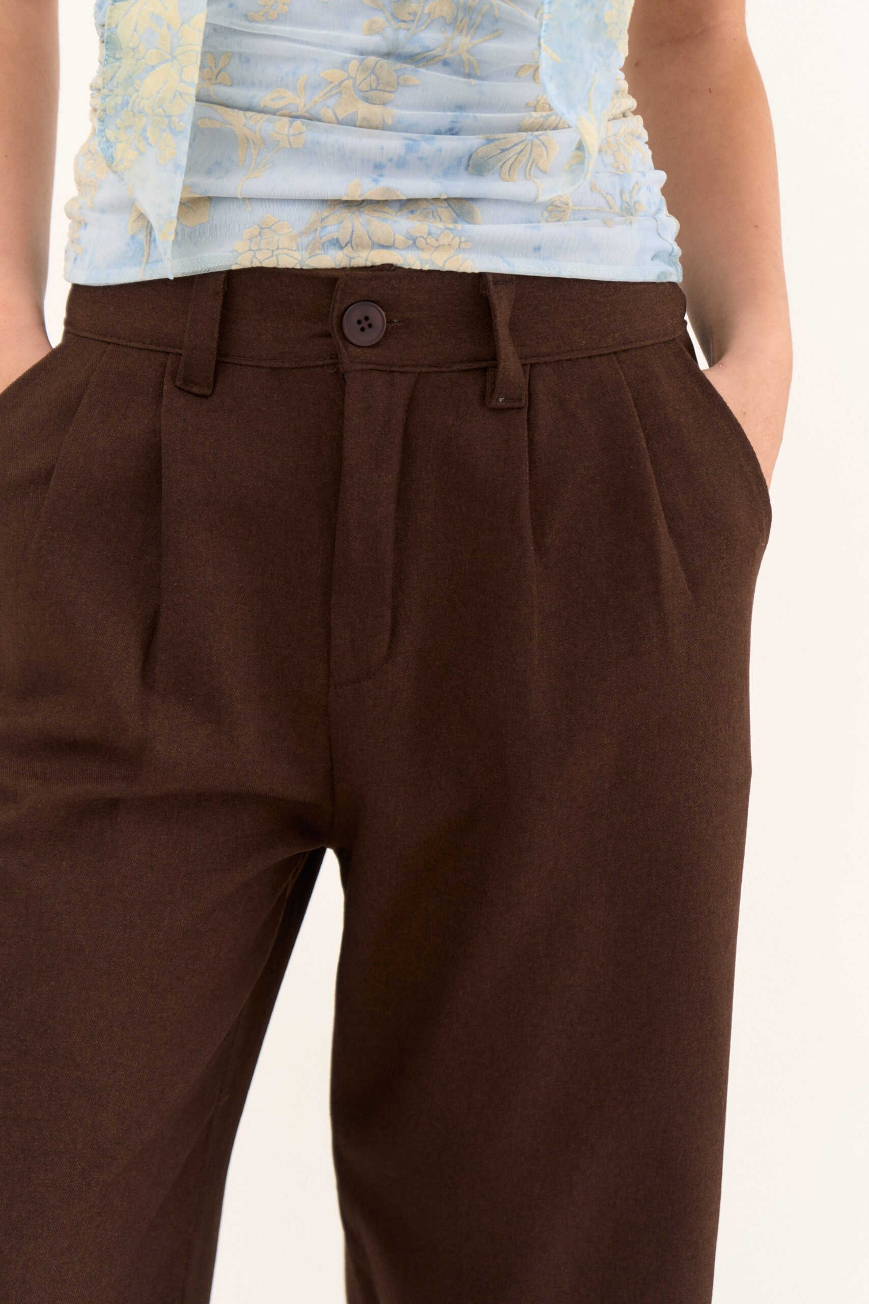 Pantalón sastrero tiro alto de twill con poliester. Modelo de piernas anchas con pinzas en delantero y trasero. Acceso prenda botón y cierre. Bolsillos laterales en delantero.