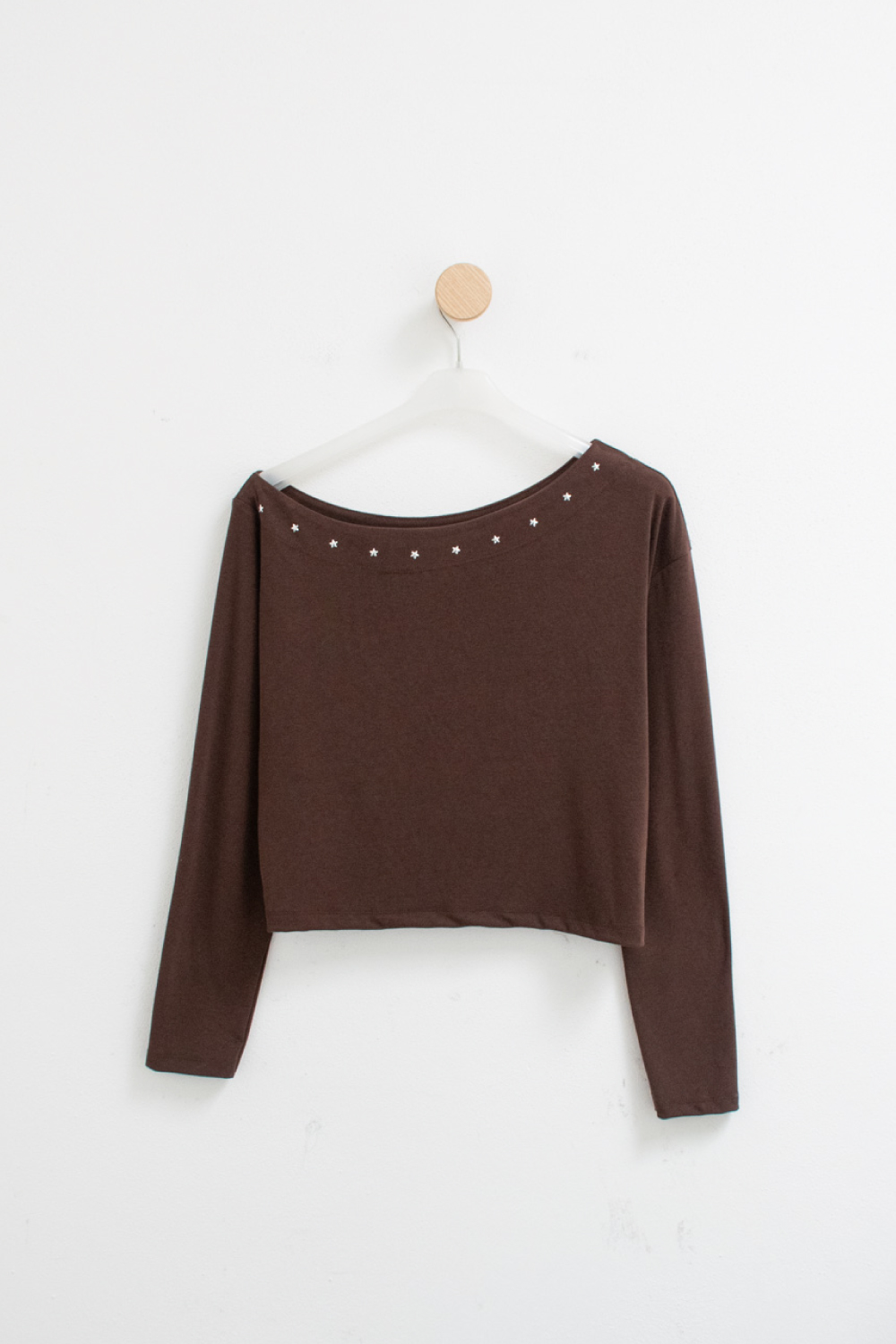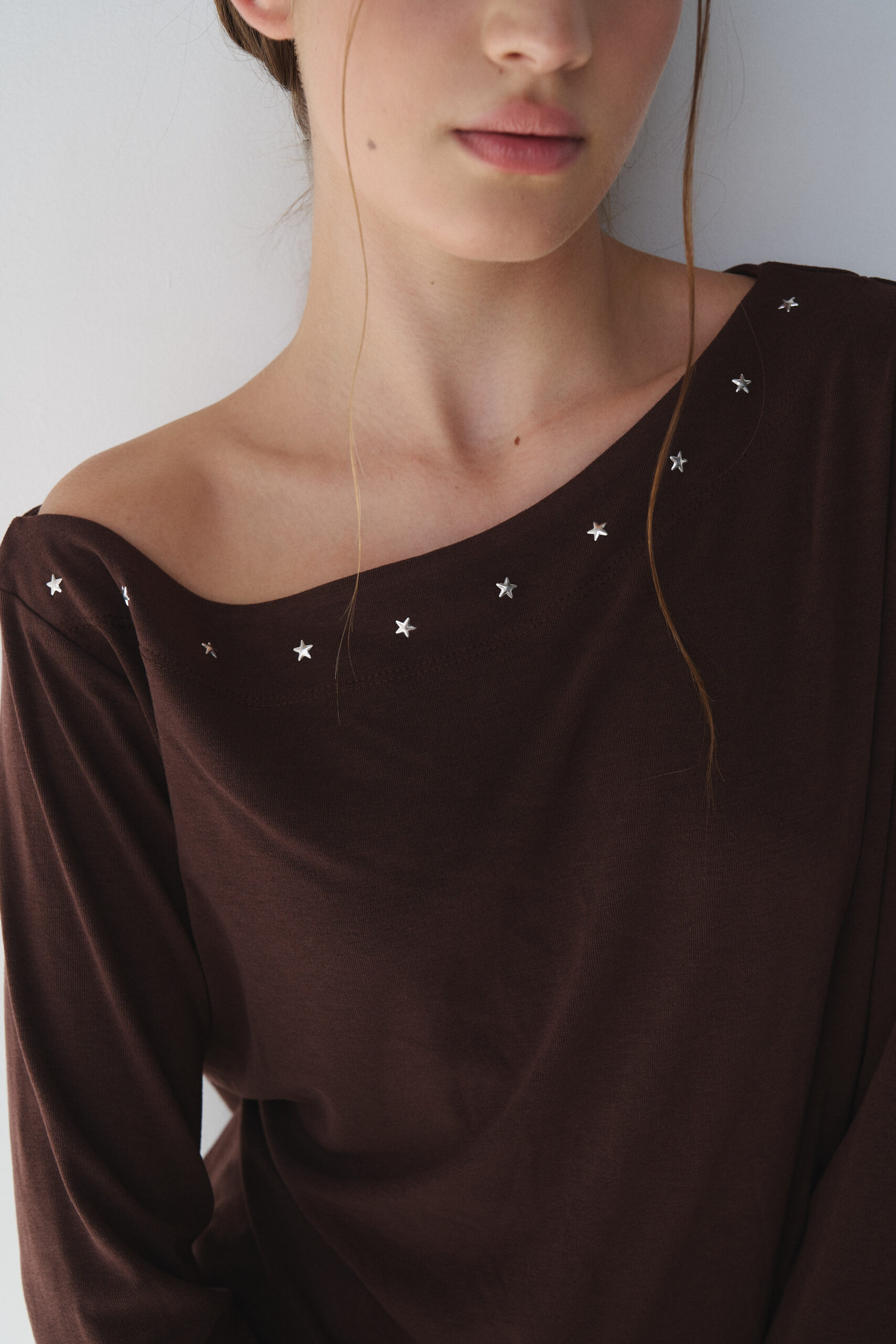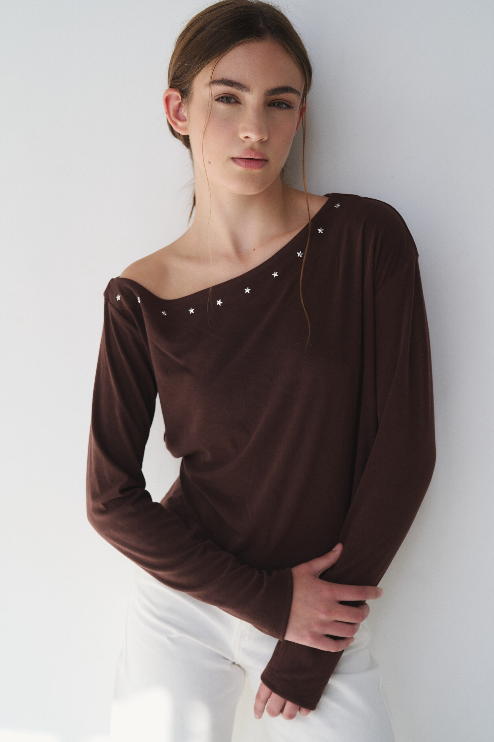 Remera manga larga de escote asimétrico con un hombro descubierto. Modelo holgado con detalle de hotfix en el delantero.
