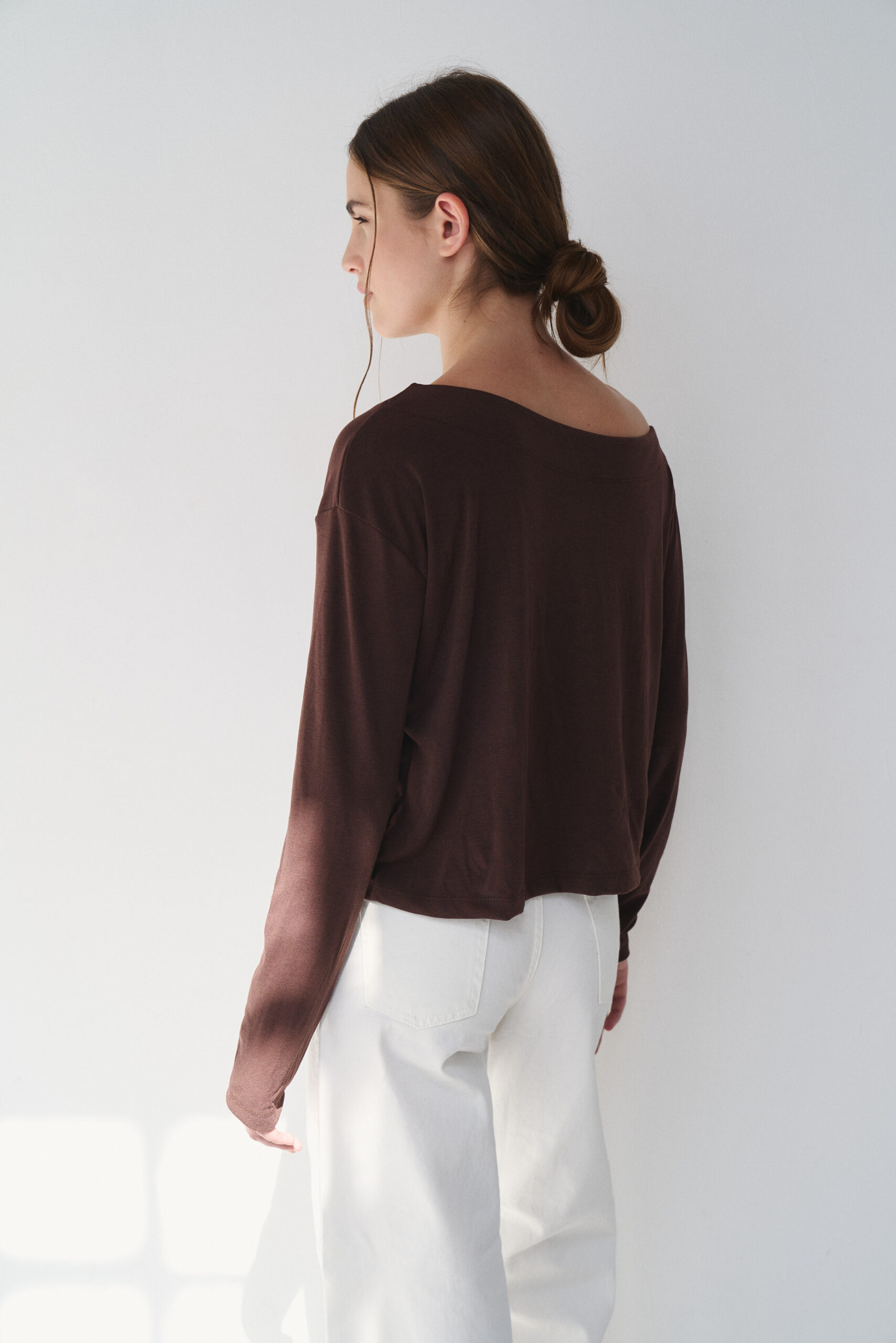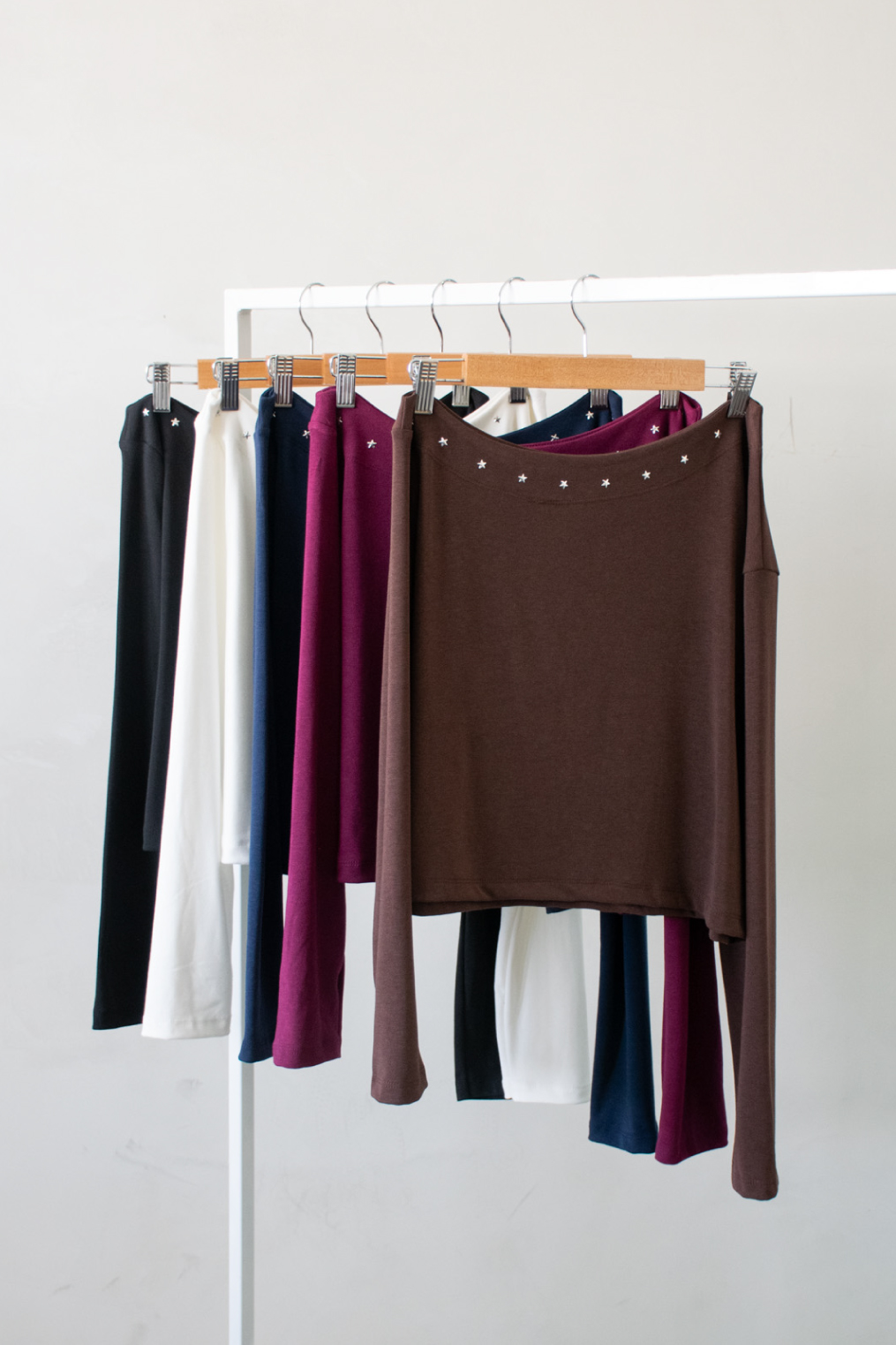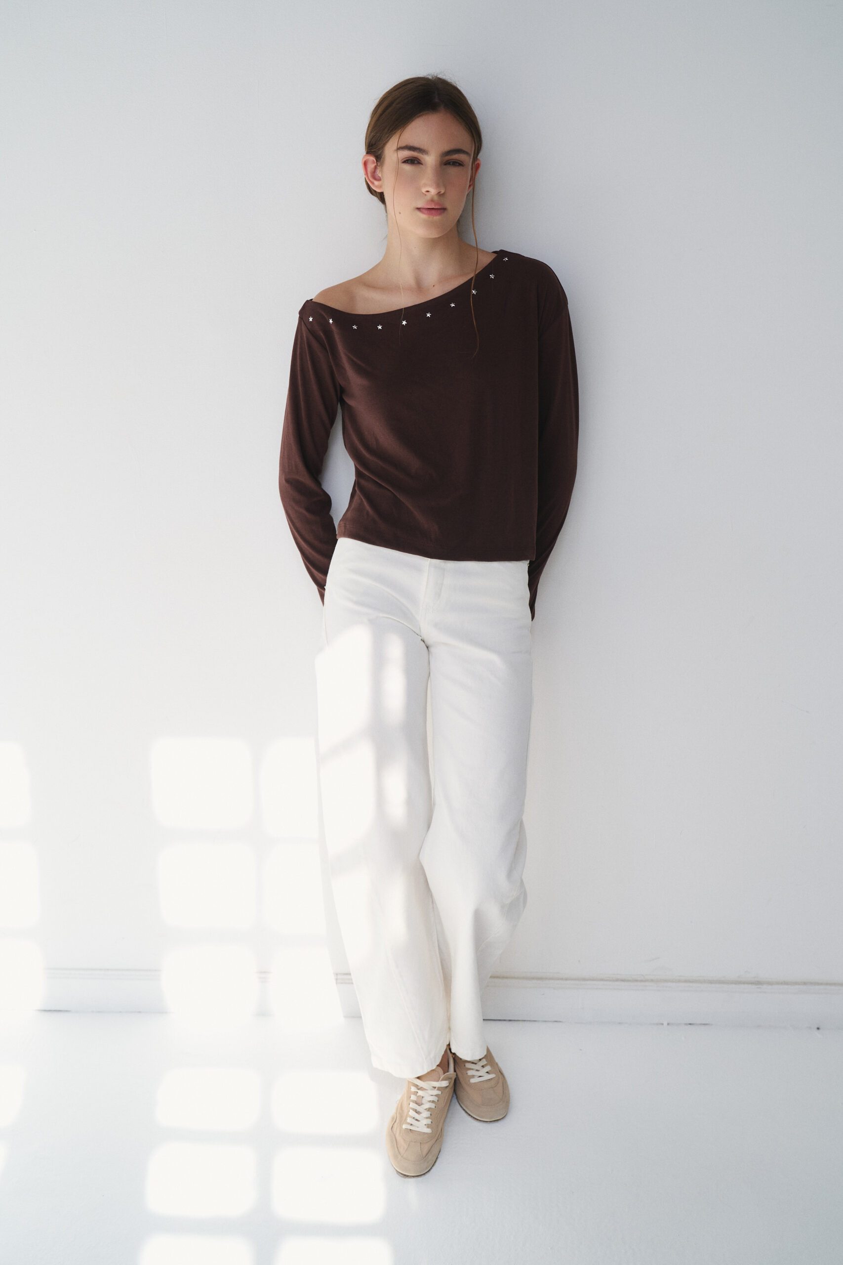 Remera manga larga de escote asimétrico con un hombro descubierto. Modelo holgado con detalle de hotfix en el delantero.