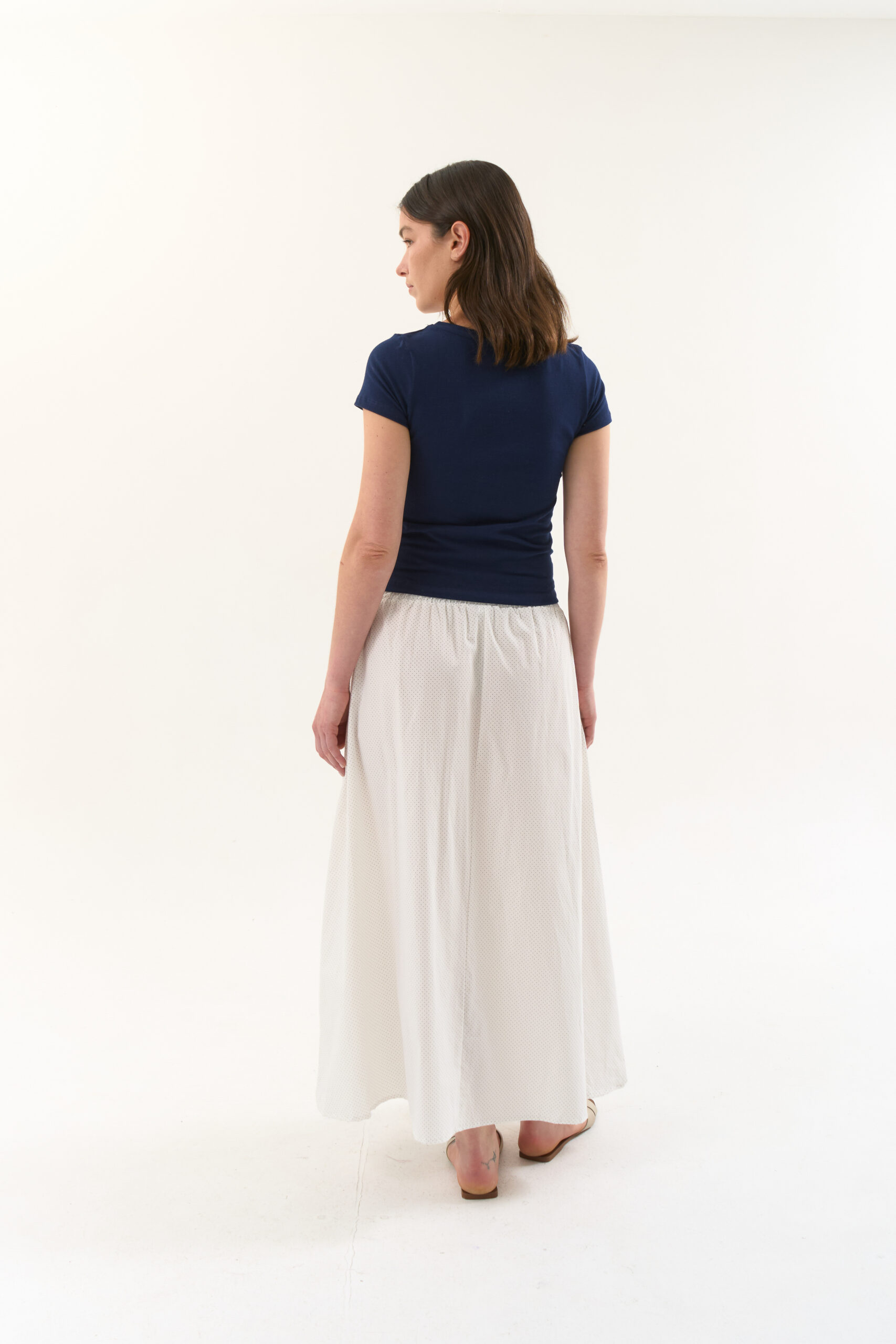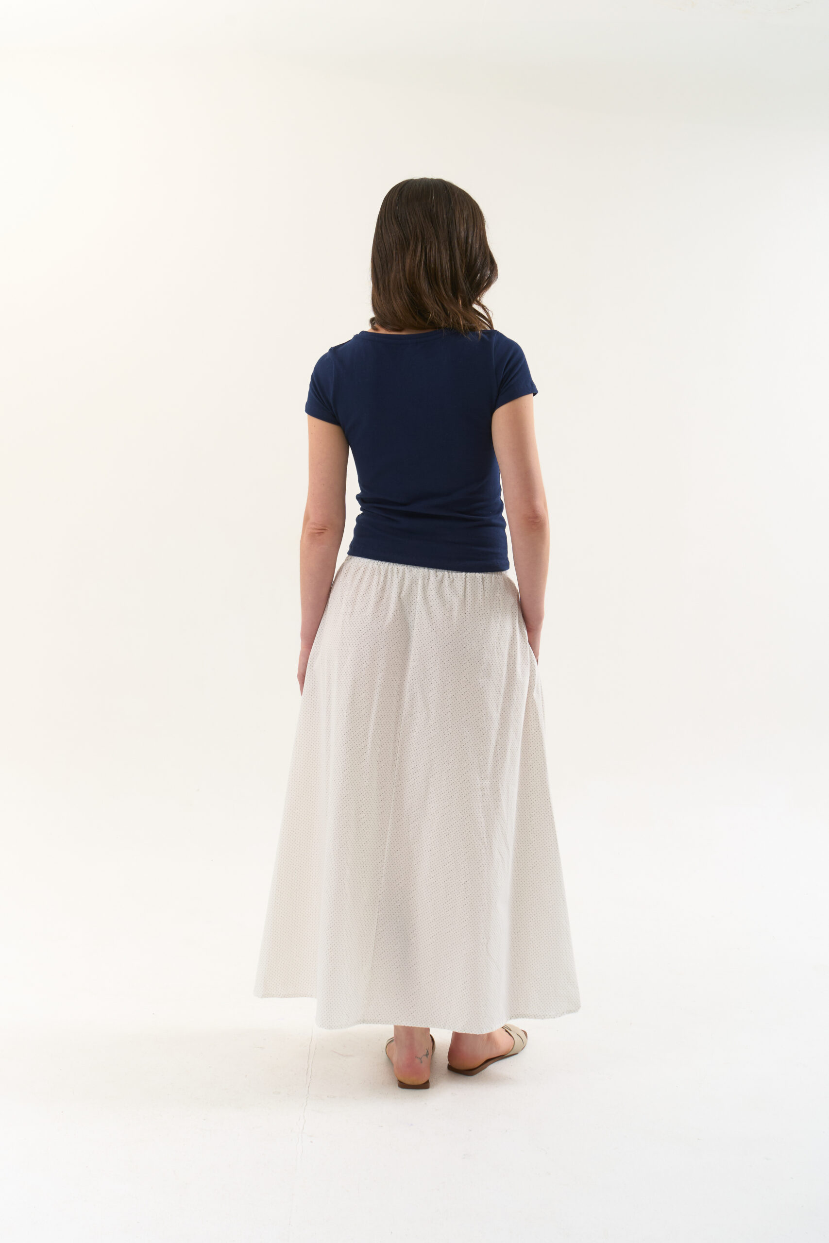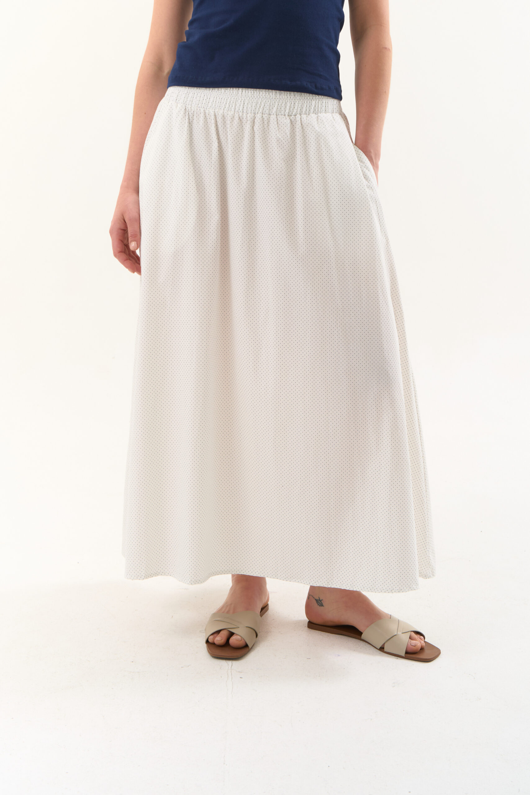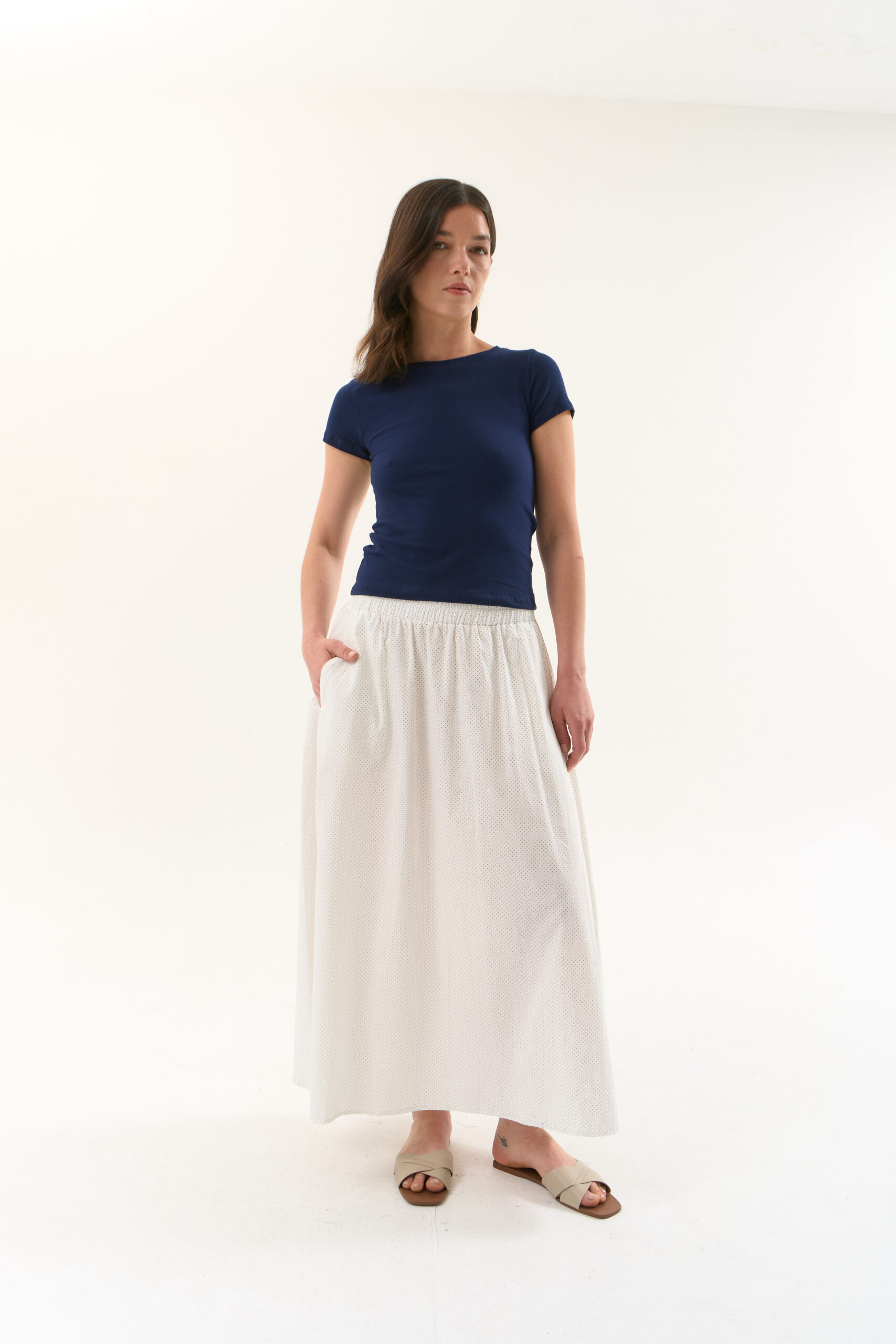 Falda larga de poplin est. con spandex con elástico en la cintura. Modelo con bolsillos escondidos en los laterales.