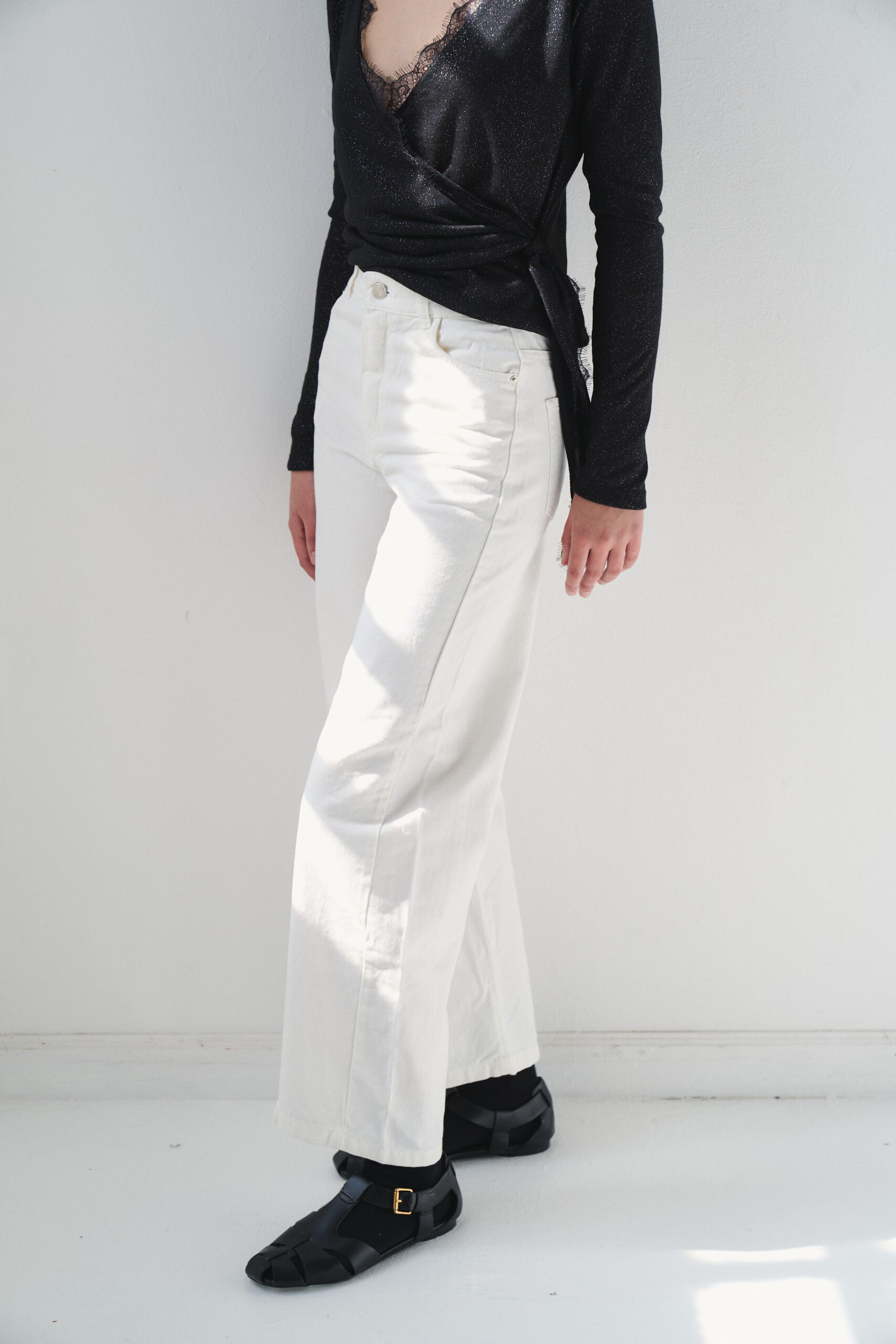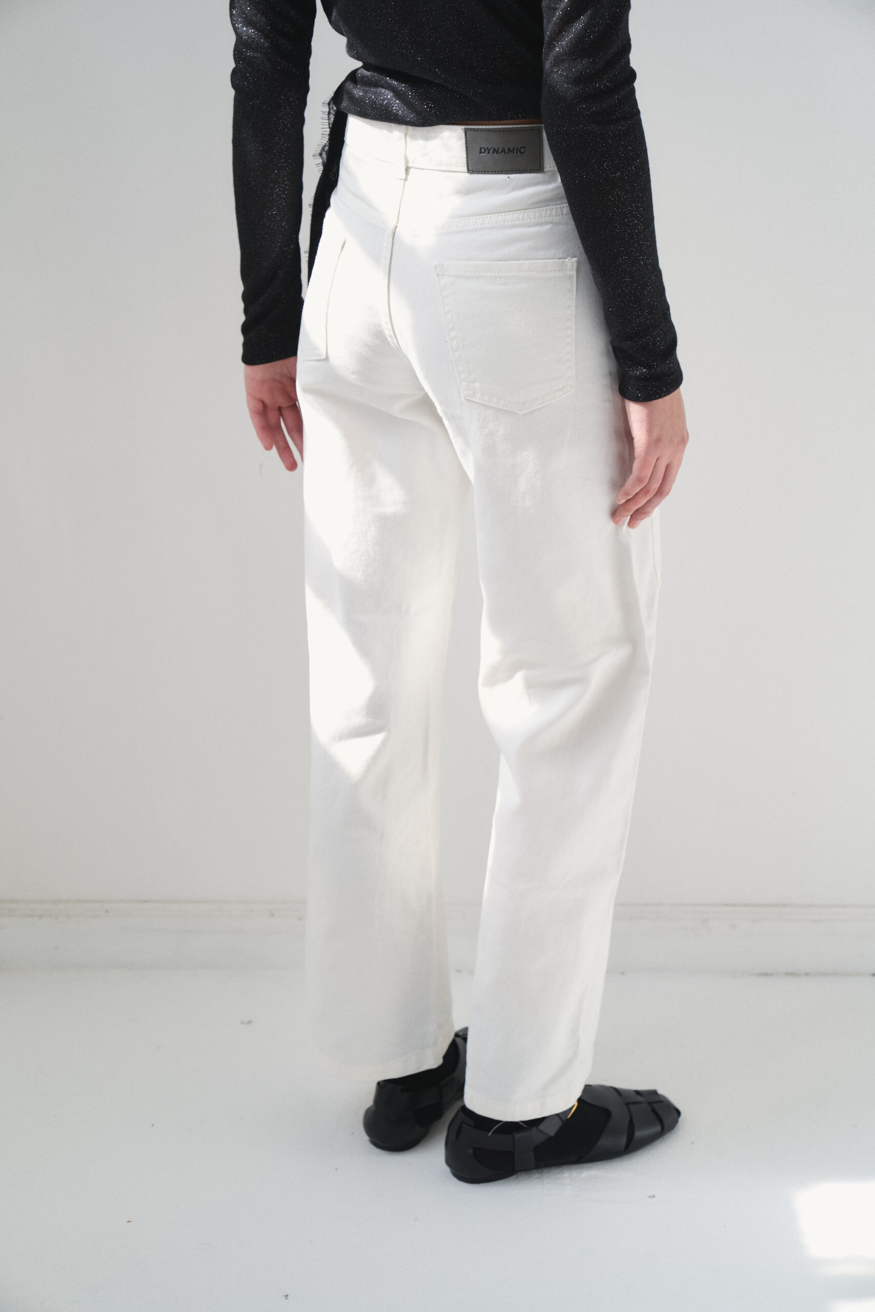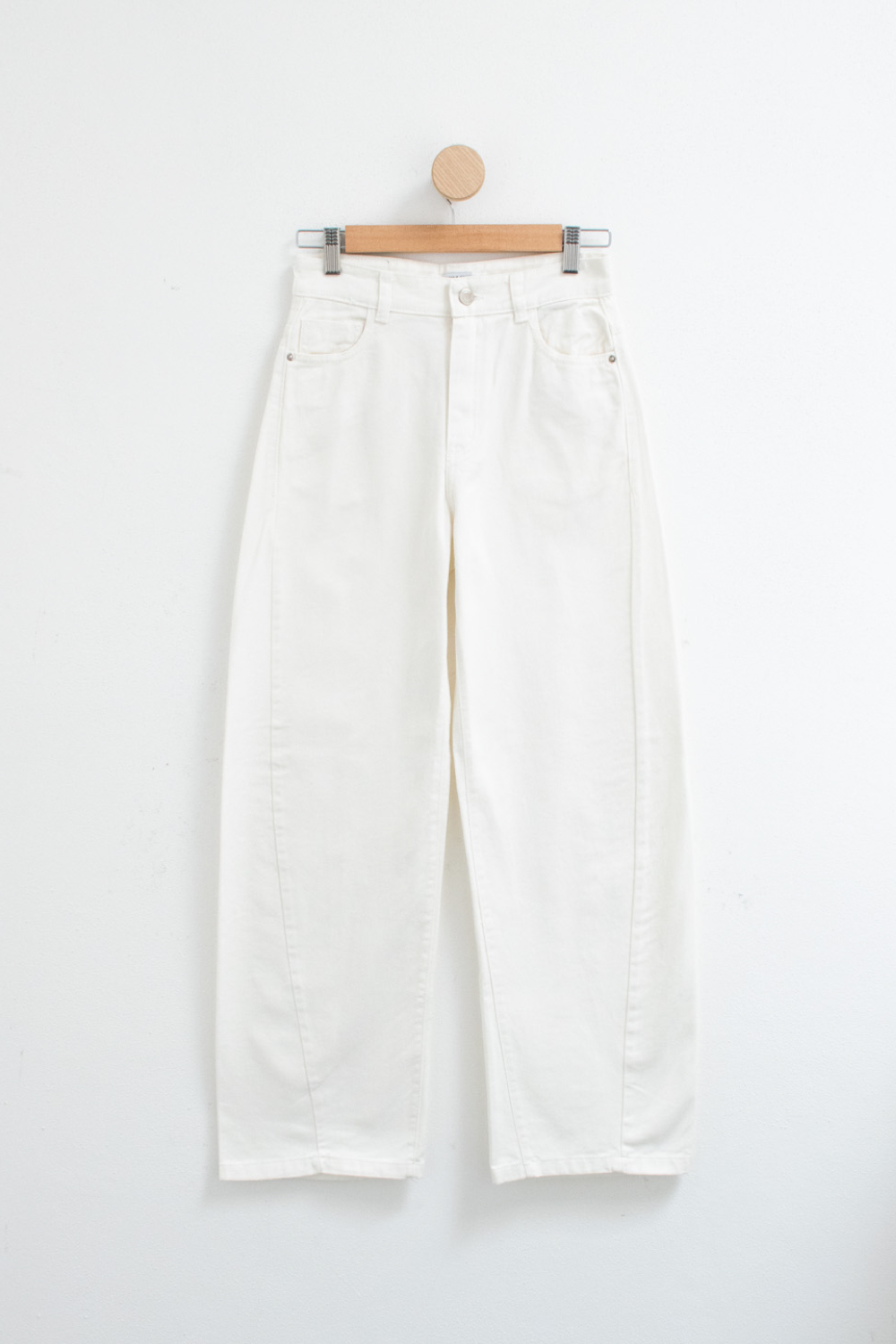 Pantalón tiro alto con corte balloon fabricado en tela 100% algodón. Modelo con costura lateral corrido hacia adelante y cinco bolsillos. Proceso de prelavado suavizado.