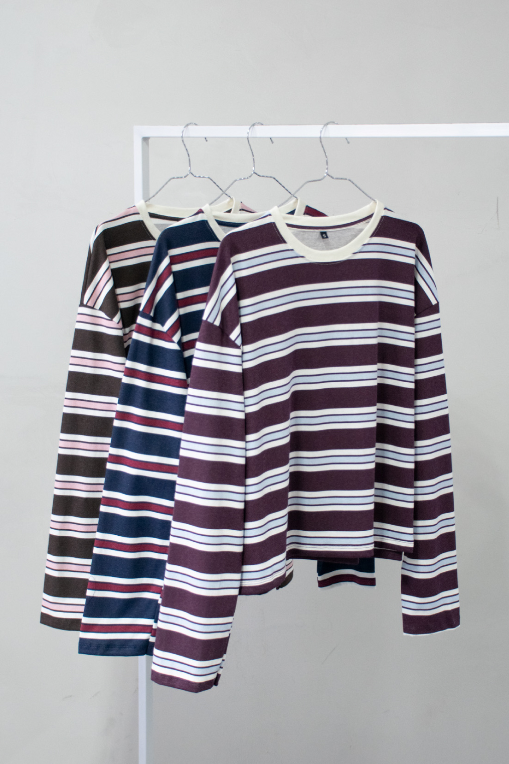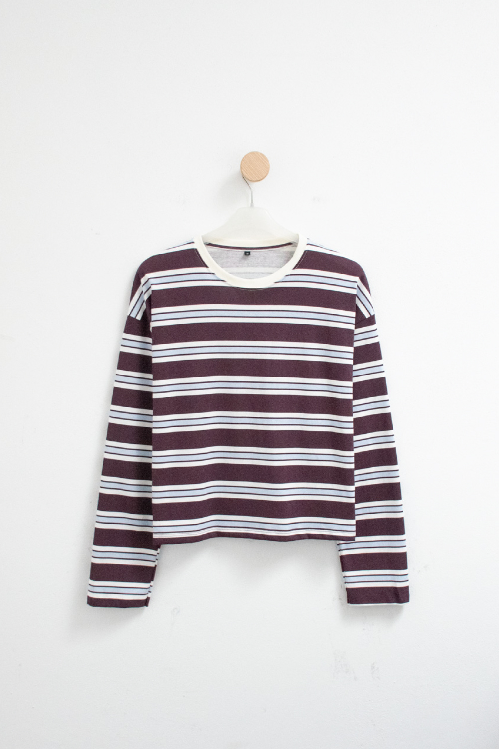 Remera oversize en jersey rayado 100% algodón. Modelo con cuello redondo y mangas largas. Detalle de cuello combinado en ribb.