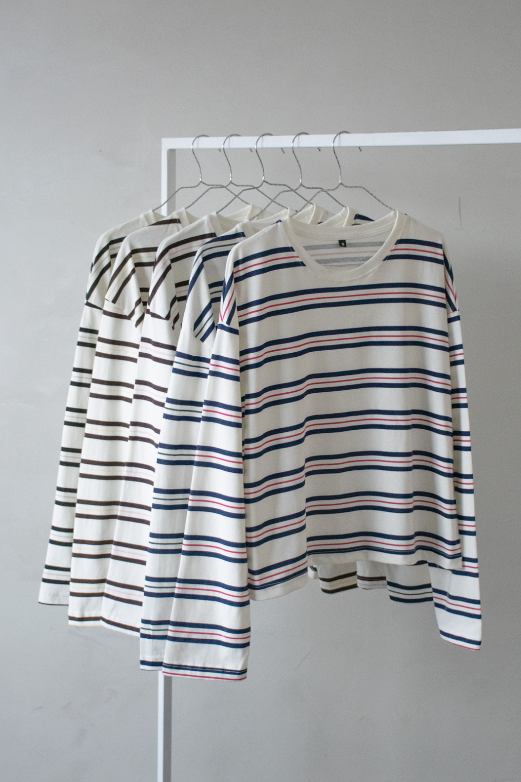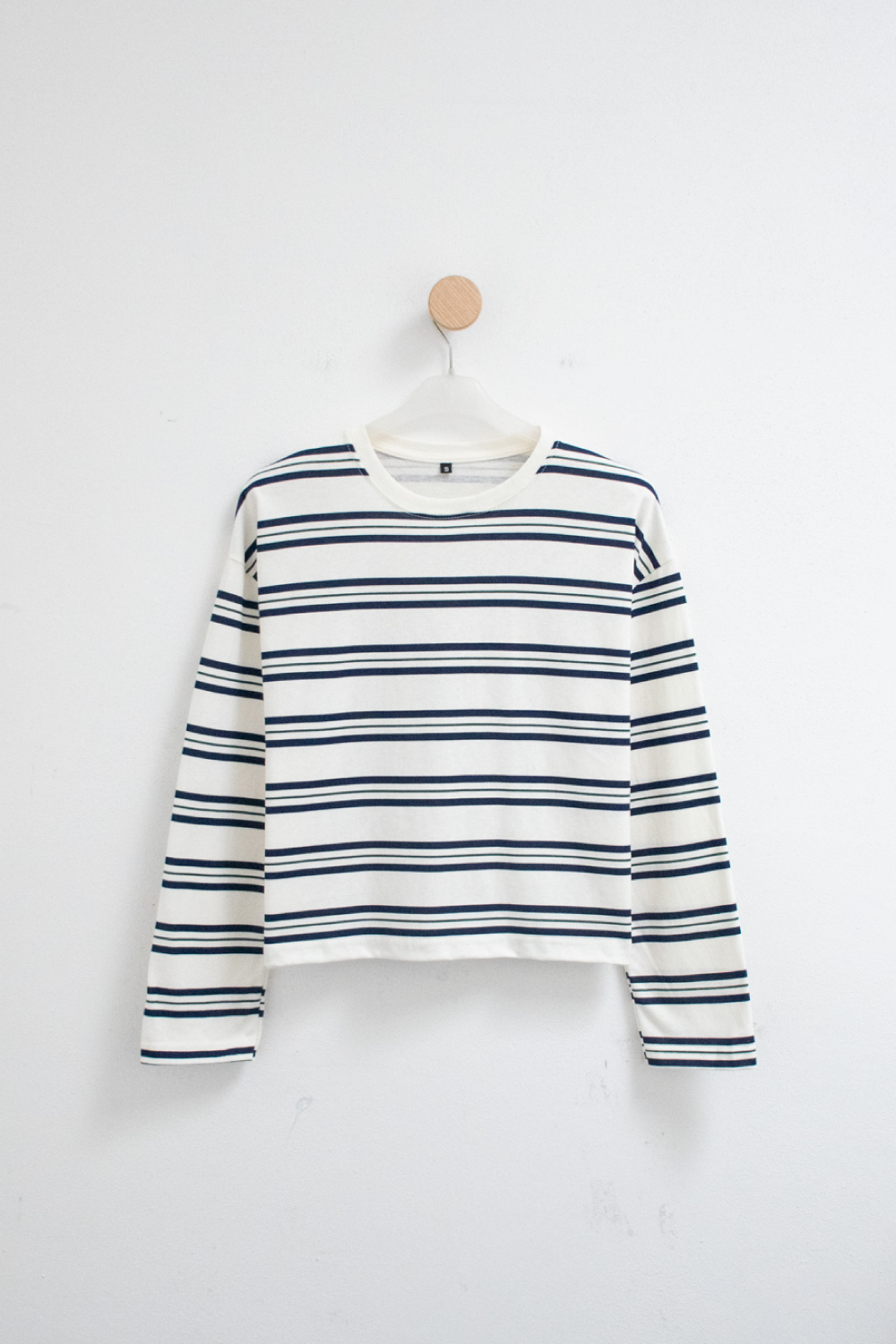 Remera oversize en jersey rayado 100% algodón. Modelo con cuello redondo y mangas largas. Detalle de cuello combinado en ribb.
