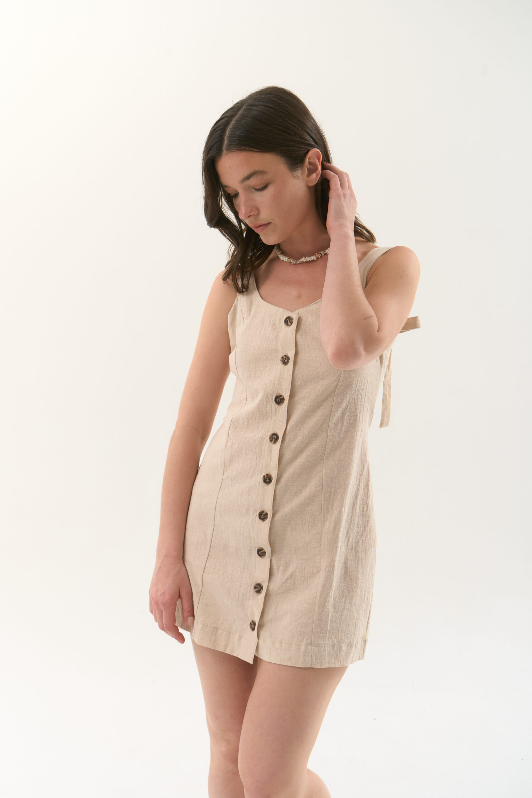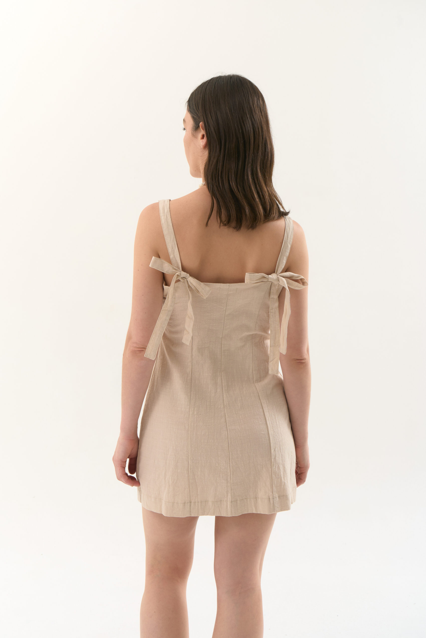 Vestido entallado en camisero 100% algodón. Cierre de prenda con botones en el delantero y breteles para atar.