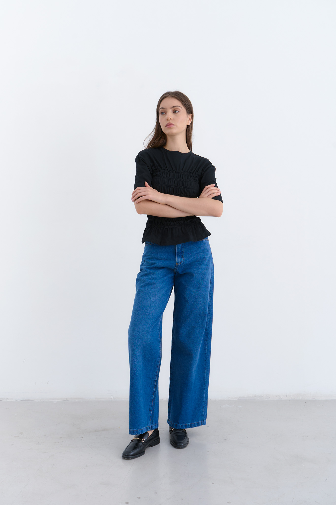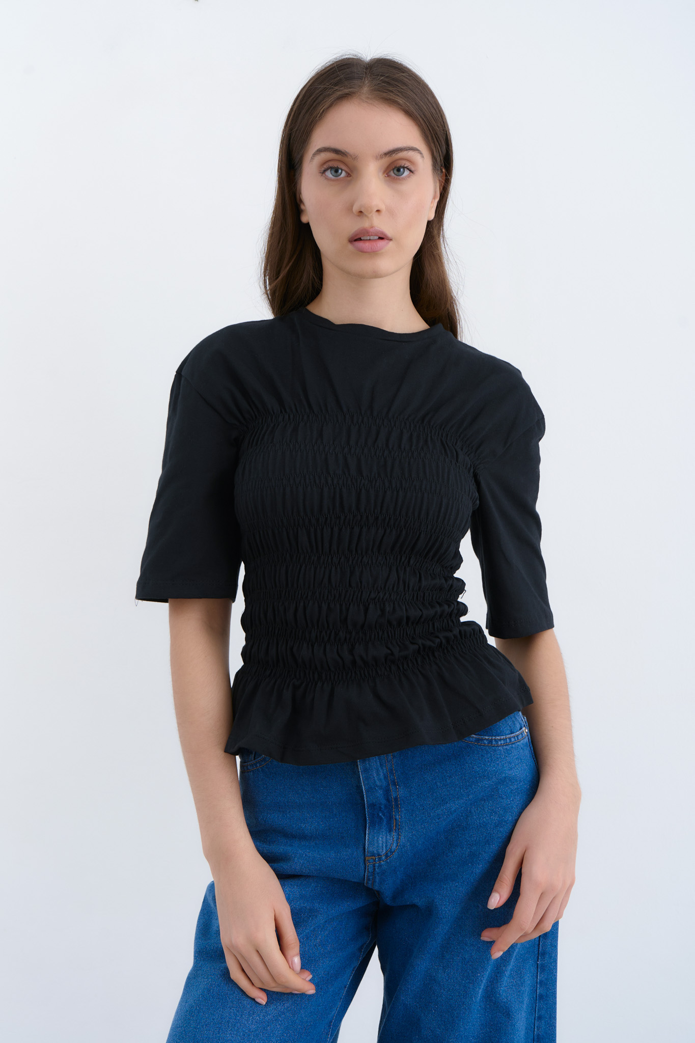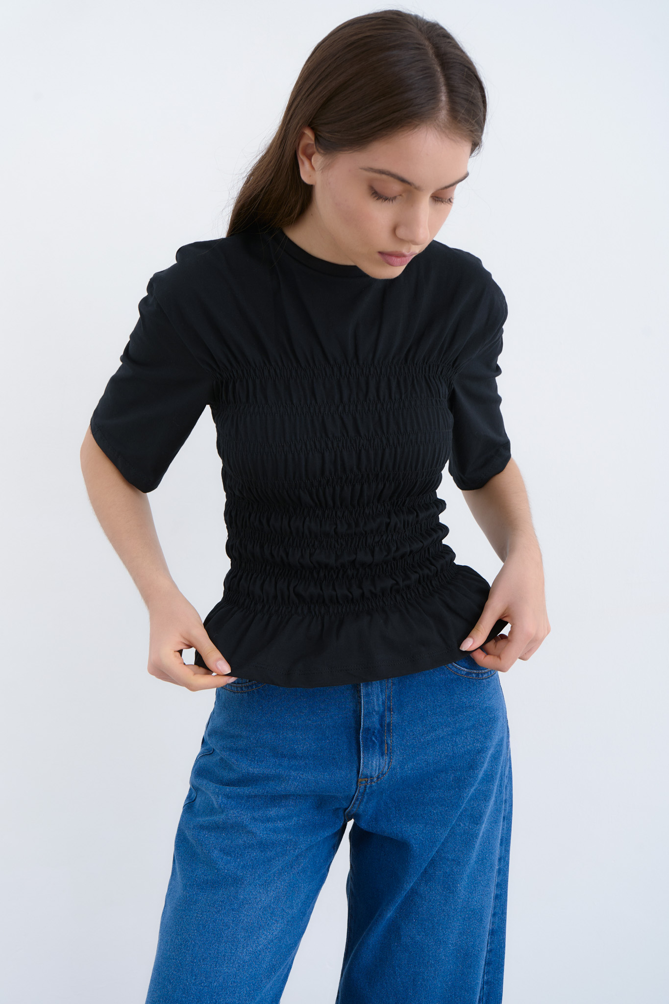 Remera en jersey 24/1, 100% algodón. Modelo con cuello redondo y pasada con hilo elástico en el cuerpo delantero y espalda.
