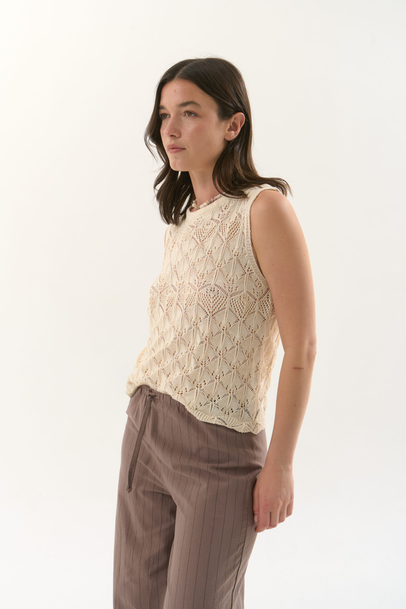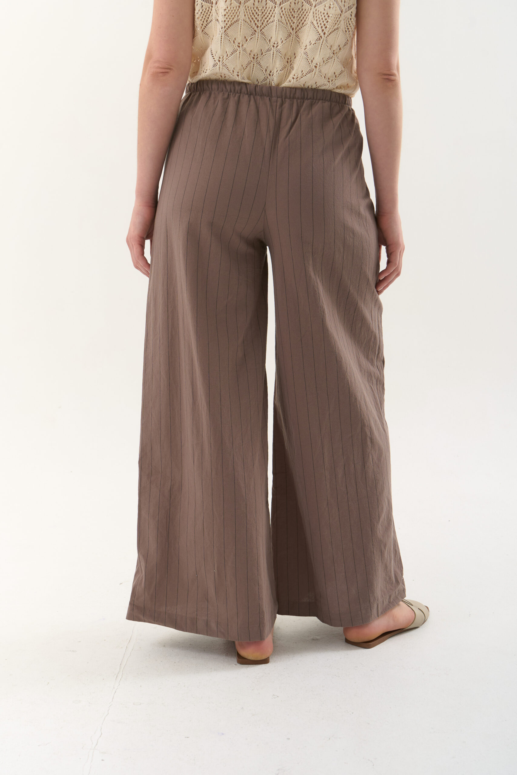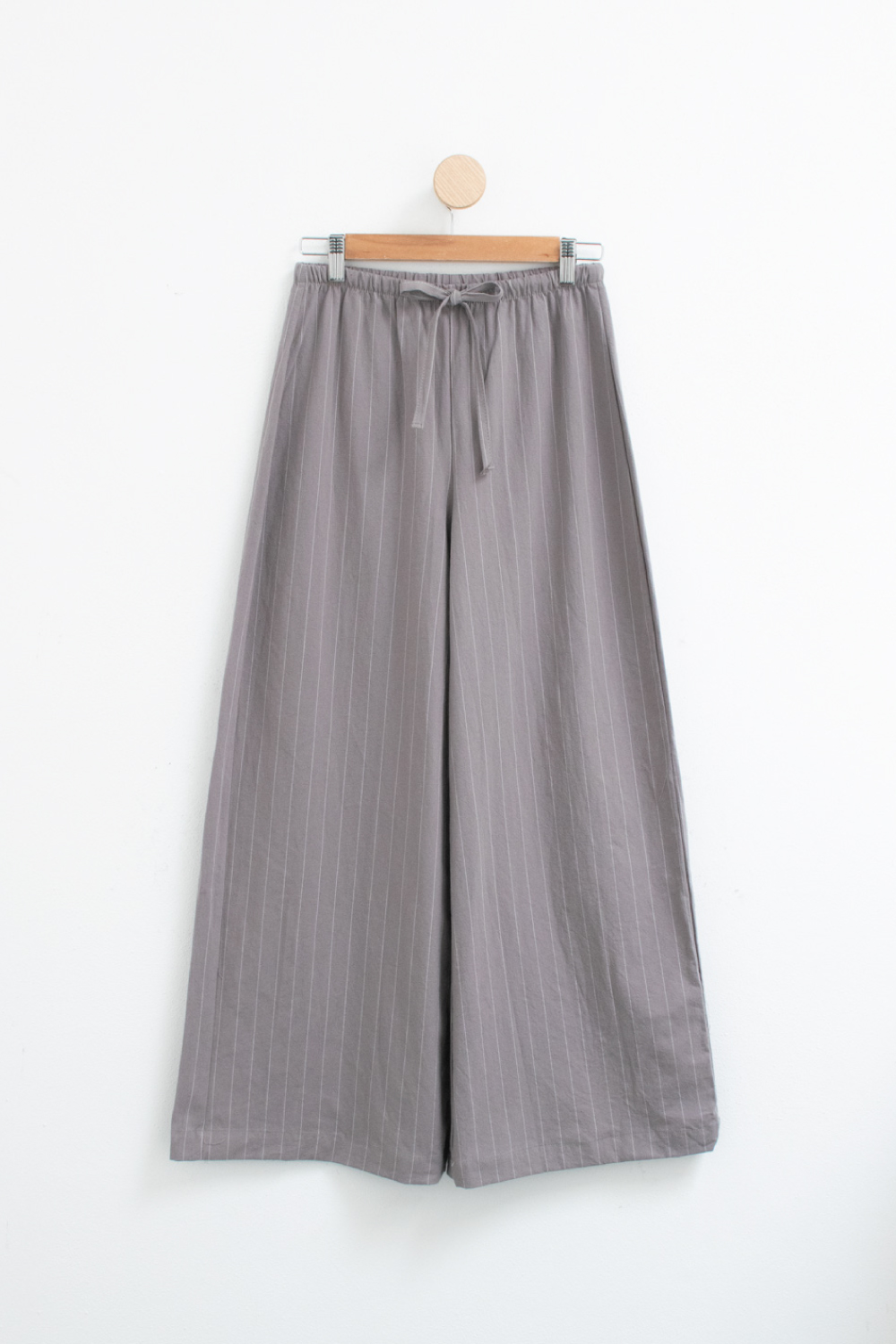Pantalón de piernas anchas en Lino rayón rayado. Modelo de cintura fina con elástico y cordón ajustable.