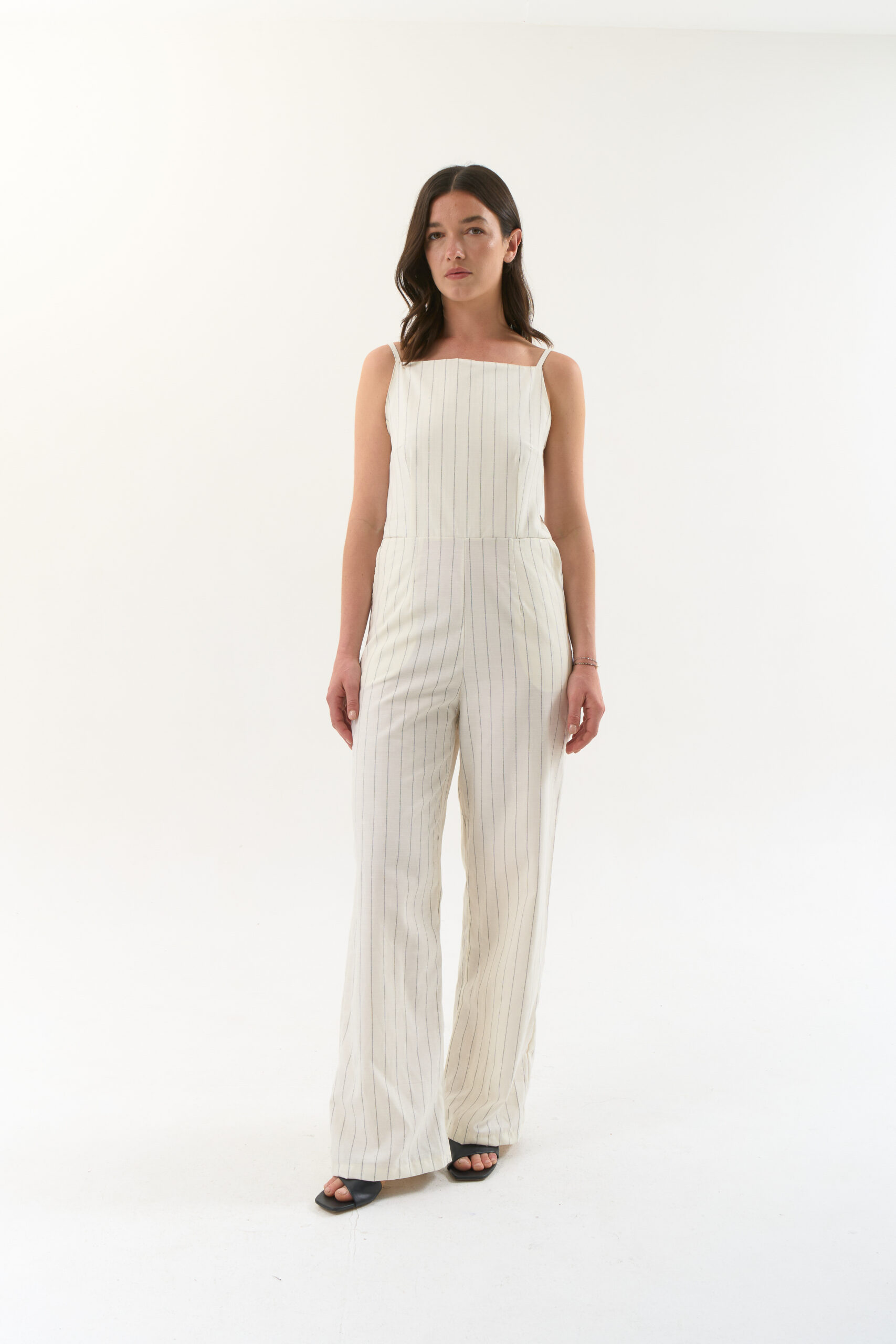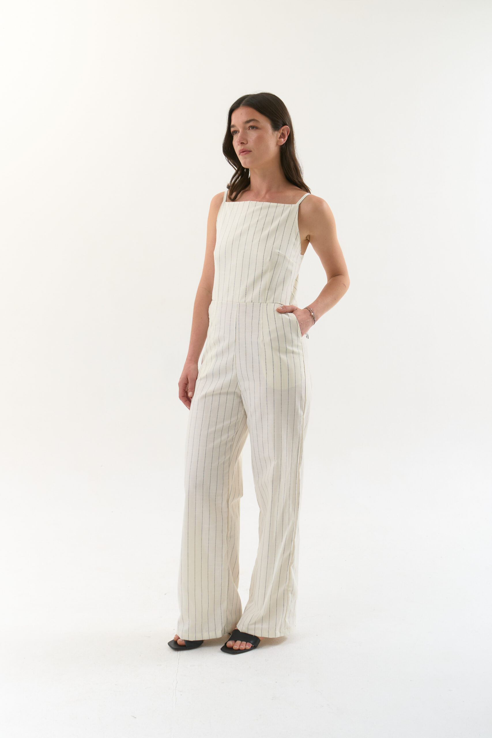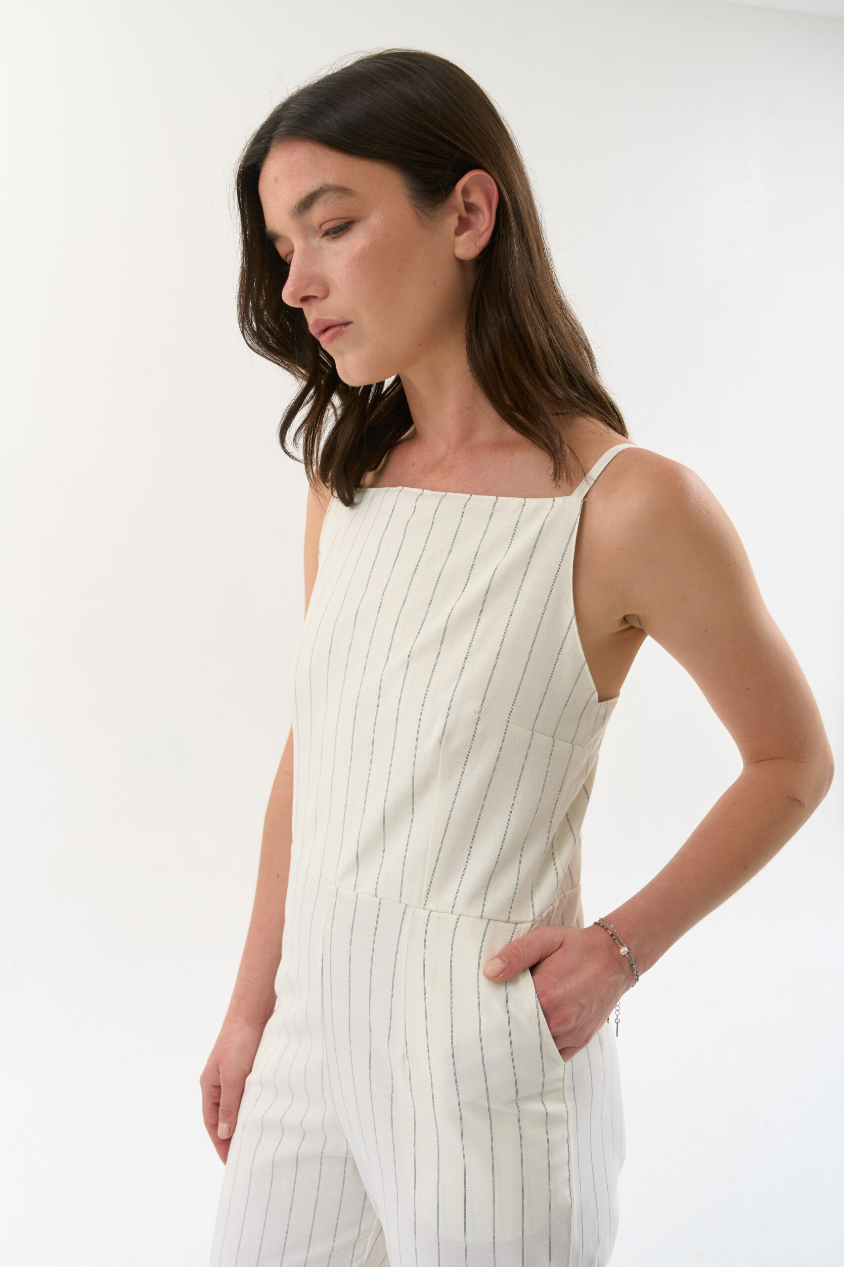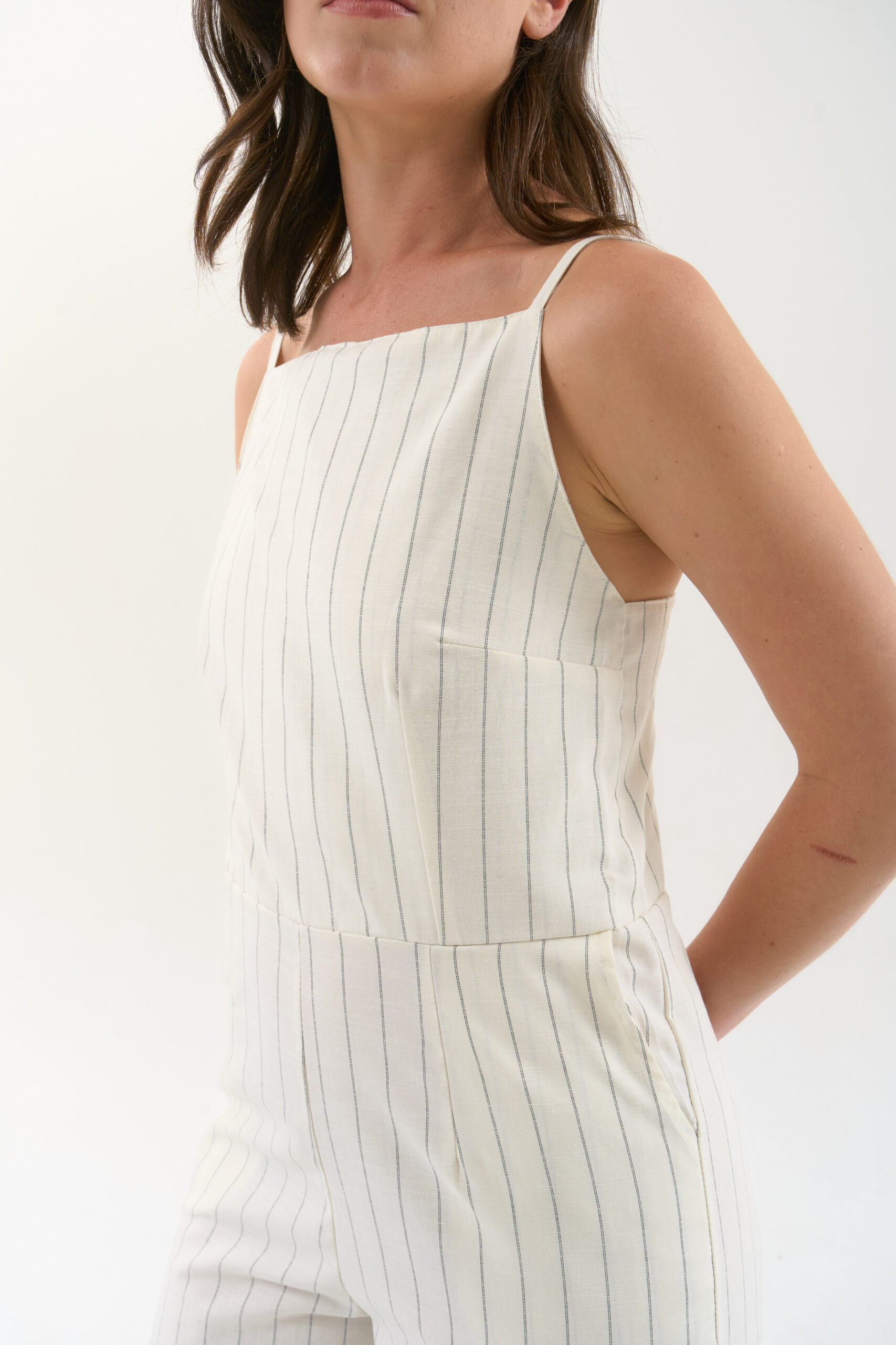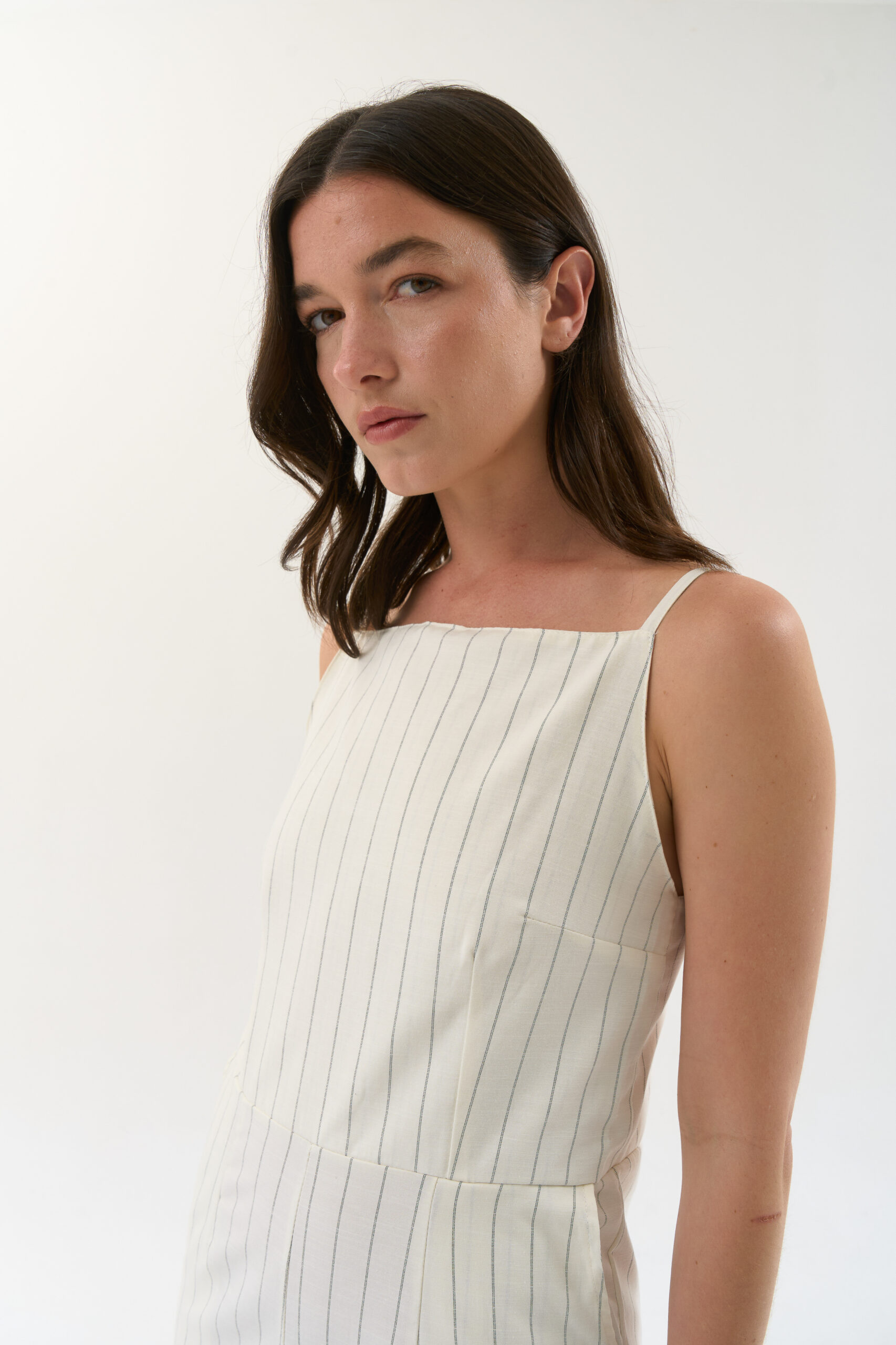 Monoprenda de sastrero rayado con breteles finos y pinzas en busto. Modelo con bolsillos delanteros y cierre invisible en la espalda.