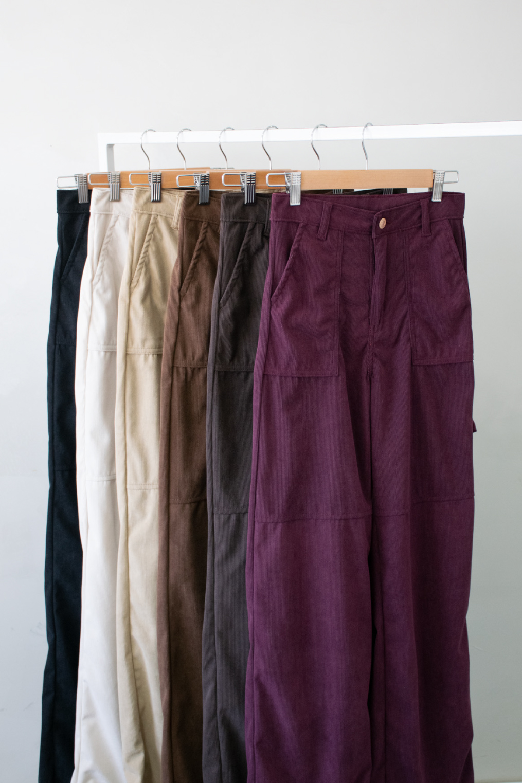 Pantalón de corderoy, tiro alto y piernas anchas. Detalle de bolsillos en laterales y tira decorativa en pierna.