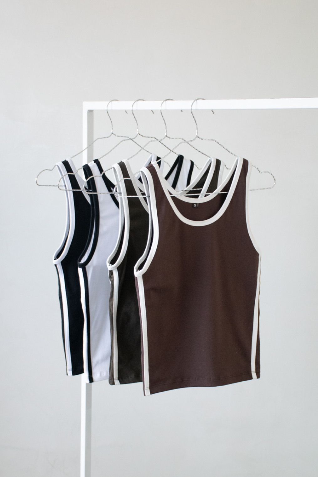 Musculosa entallada con cuello redondo en jersey algodón con lycra. Modelo con collareta a contratono y detalle de tiras en los laterales.