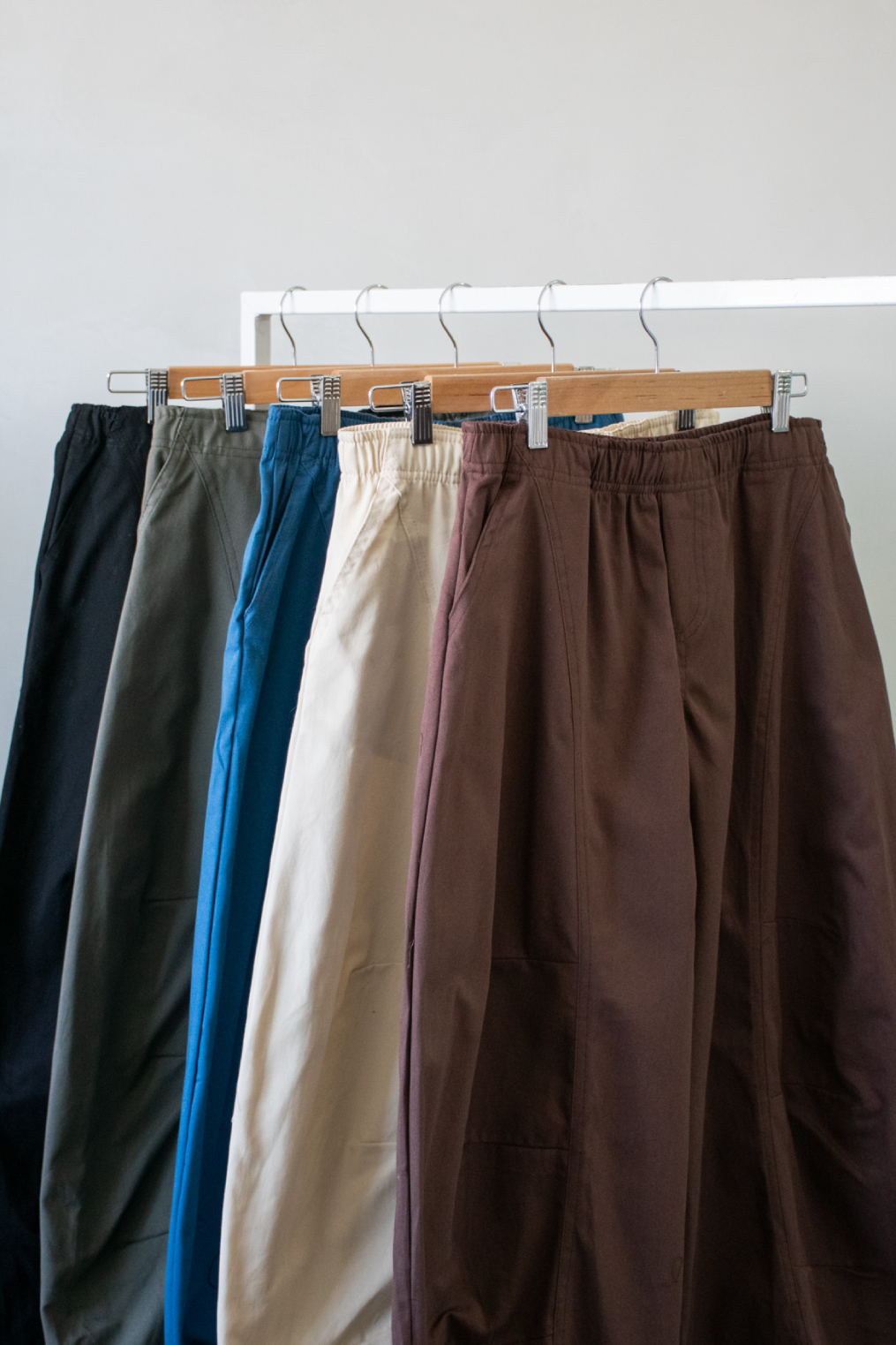 Pantalón de tiro medio en gabardina fina con corte balloon. Modelo con elástico en la cintura, bolsillos delanteros y traseros y pinzas a la altura de la rodilla delantera.