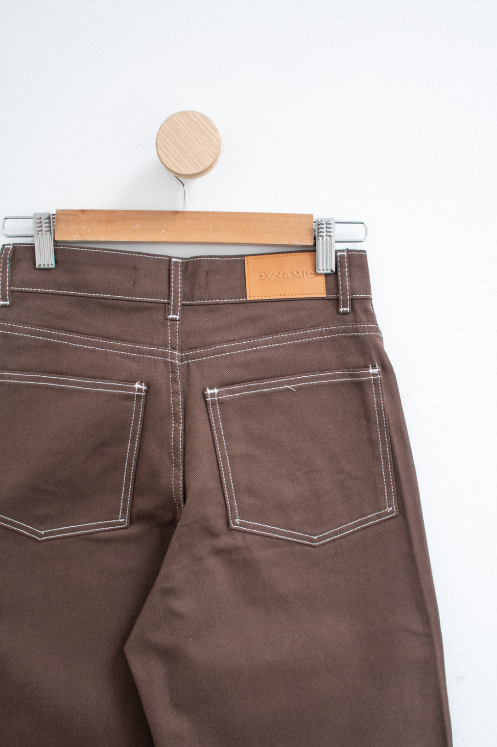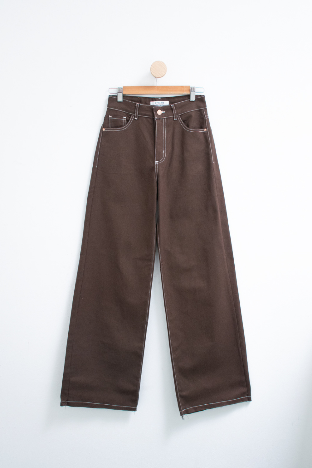 Jean rígido 100% algodón, de tiro alto y piernas anchas. Modelo con cierre metálico y cinco bolsillos.