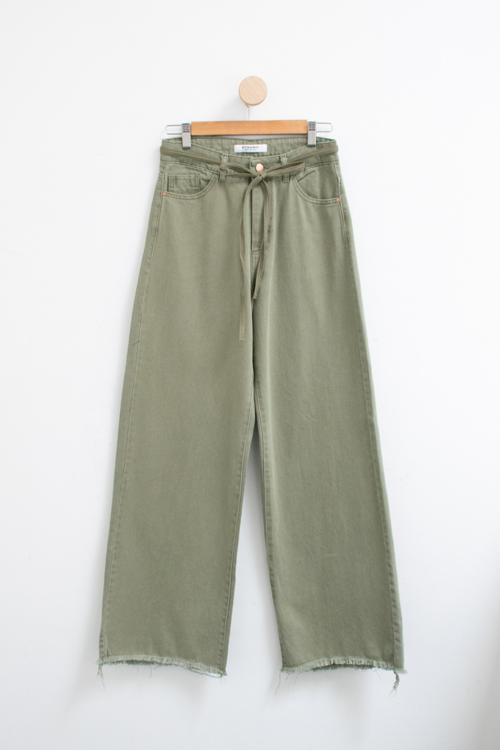 Jean wide leg de tiro alto en gabardina 100% algodón. Modelo con bajo al corte, cinco bolsillos y cinto decorativo en cintura.