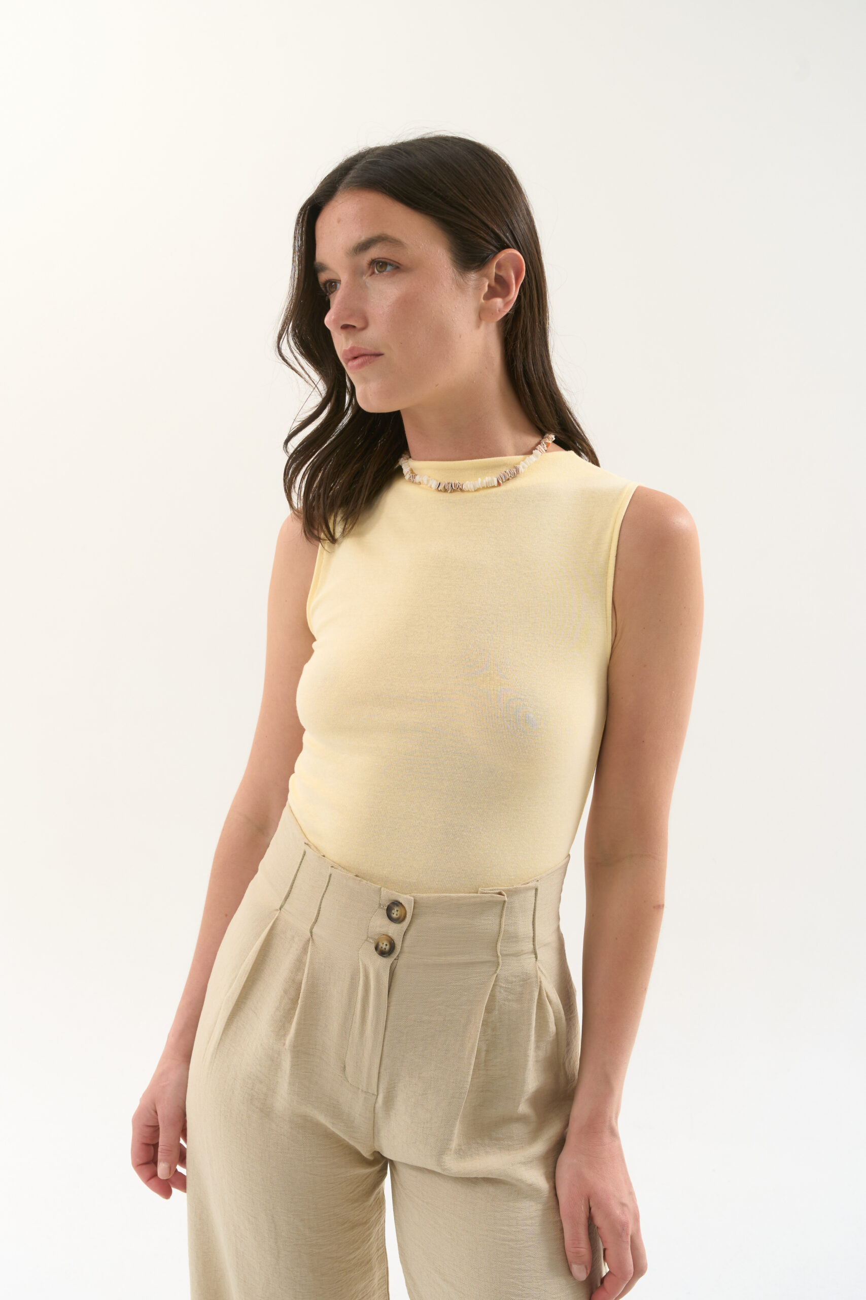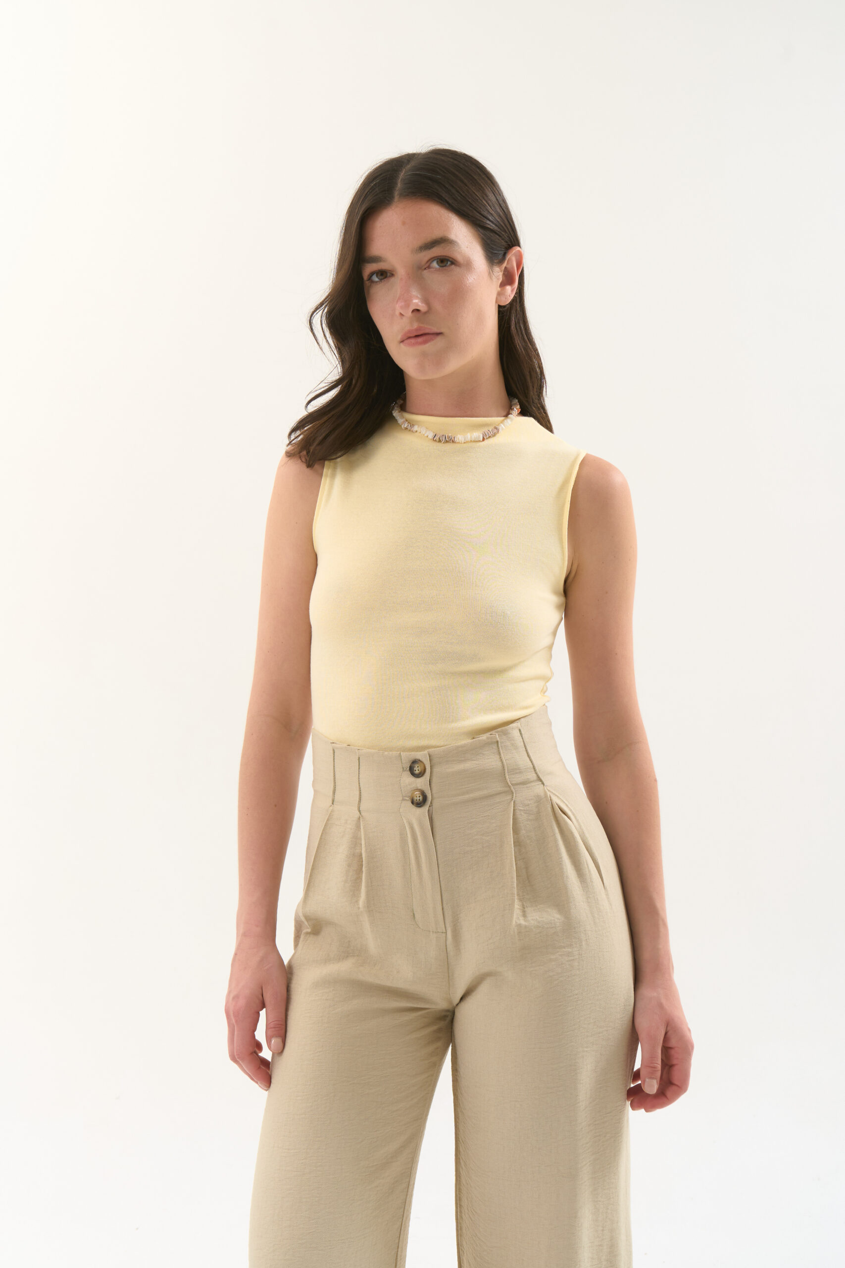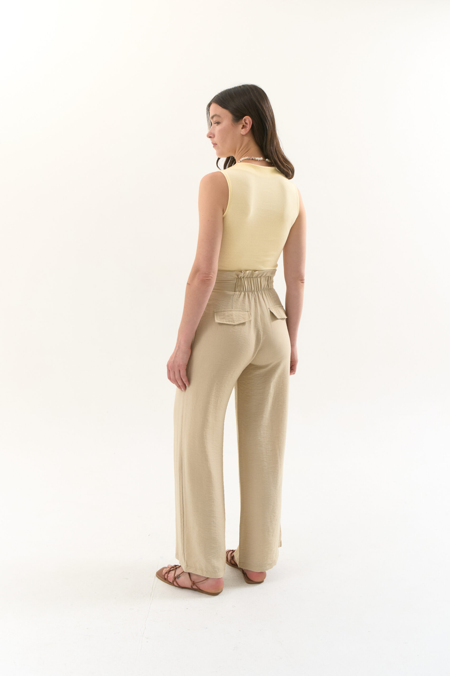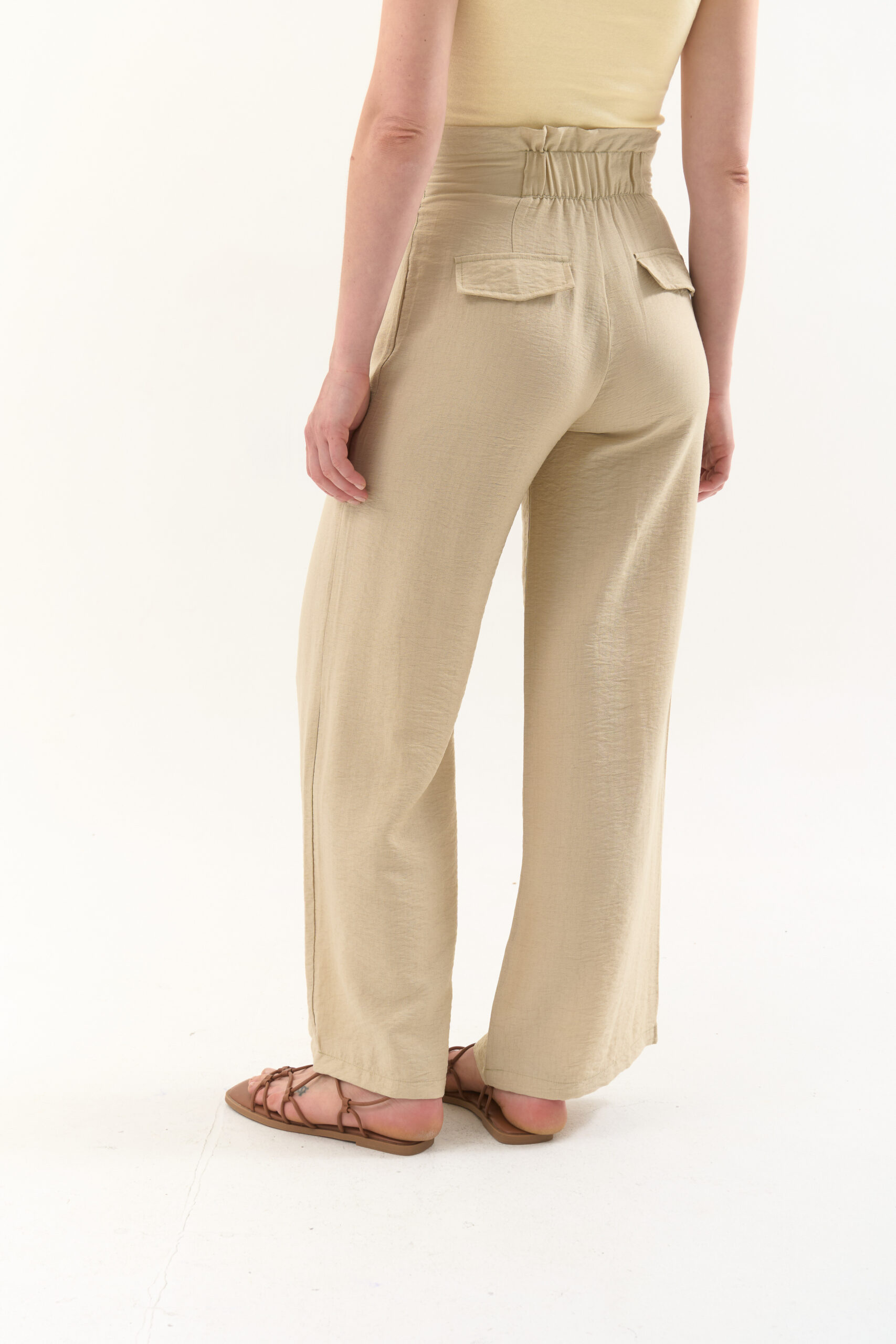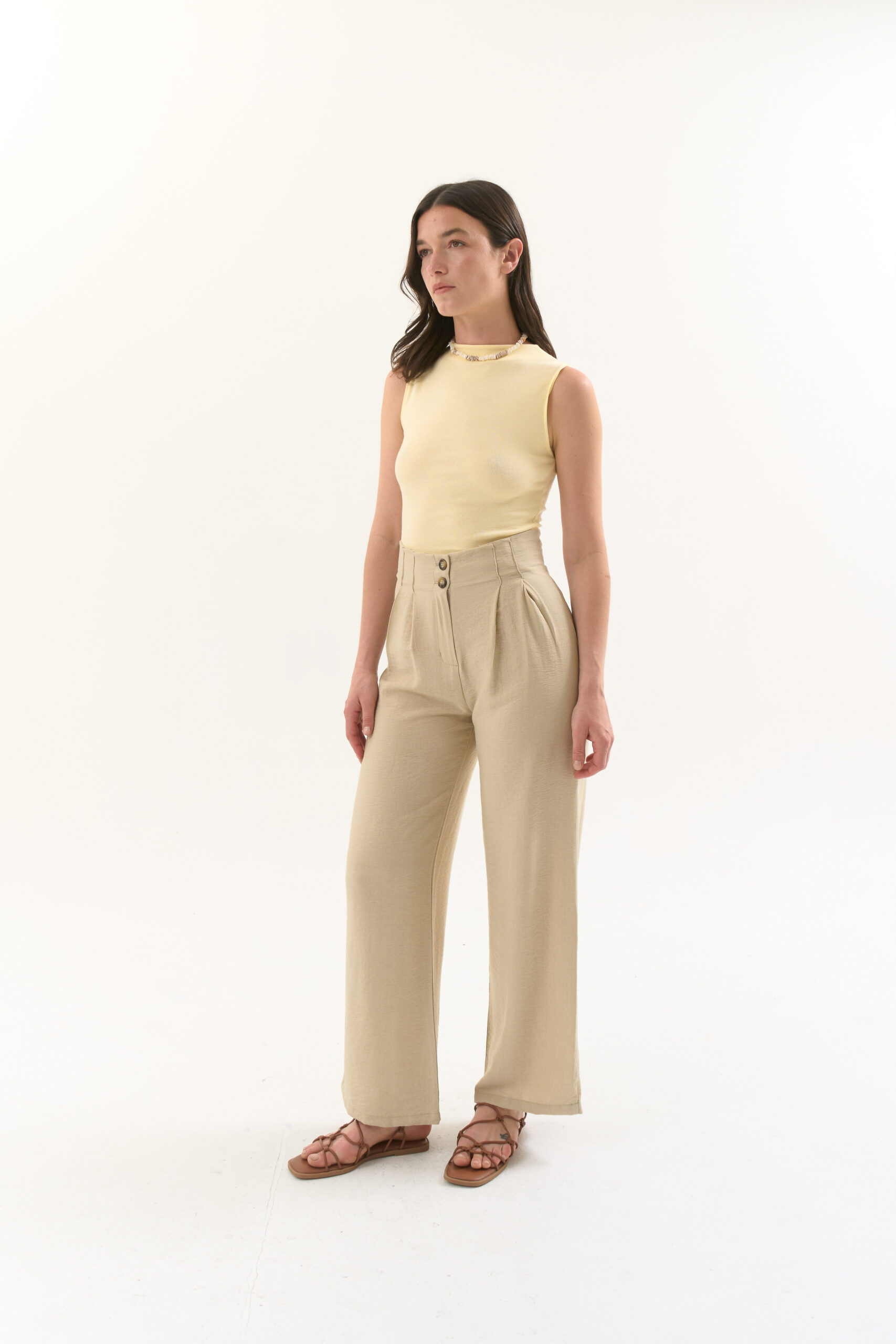 Pantalón sastrero de tiro alto con piernas anchas. Modelo con pinzas en el delantero superior, cierre y doble botón. Trasero con elástico en el centro de la cintura para mejor calce, pinzas y bolsillos falsos.